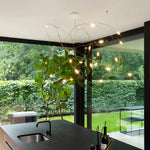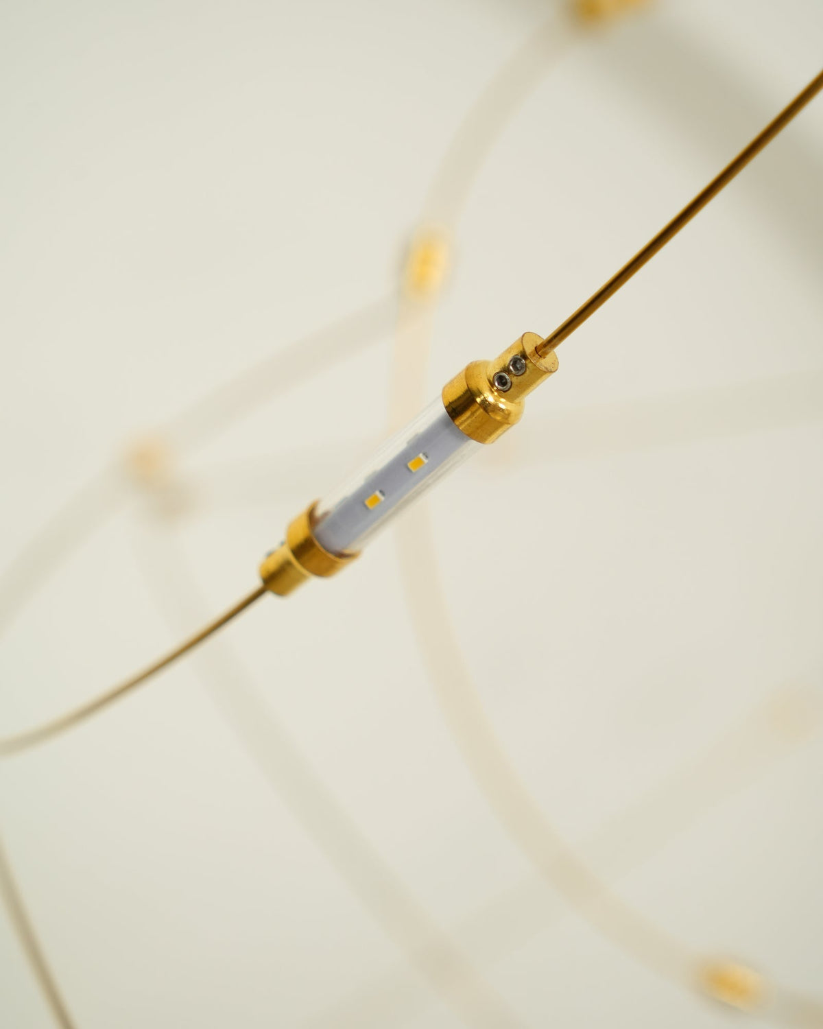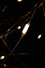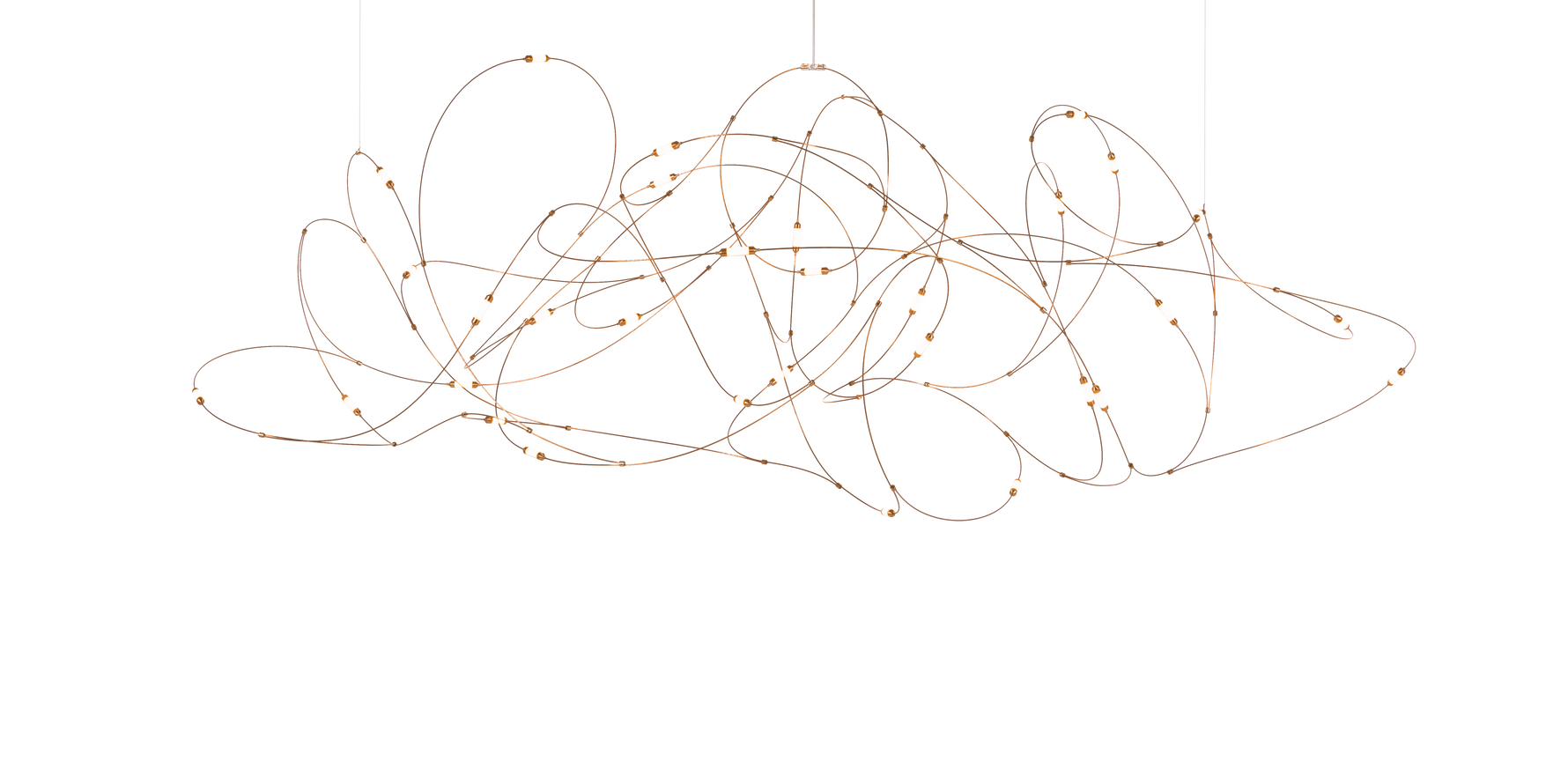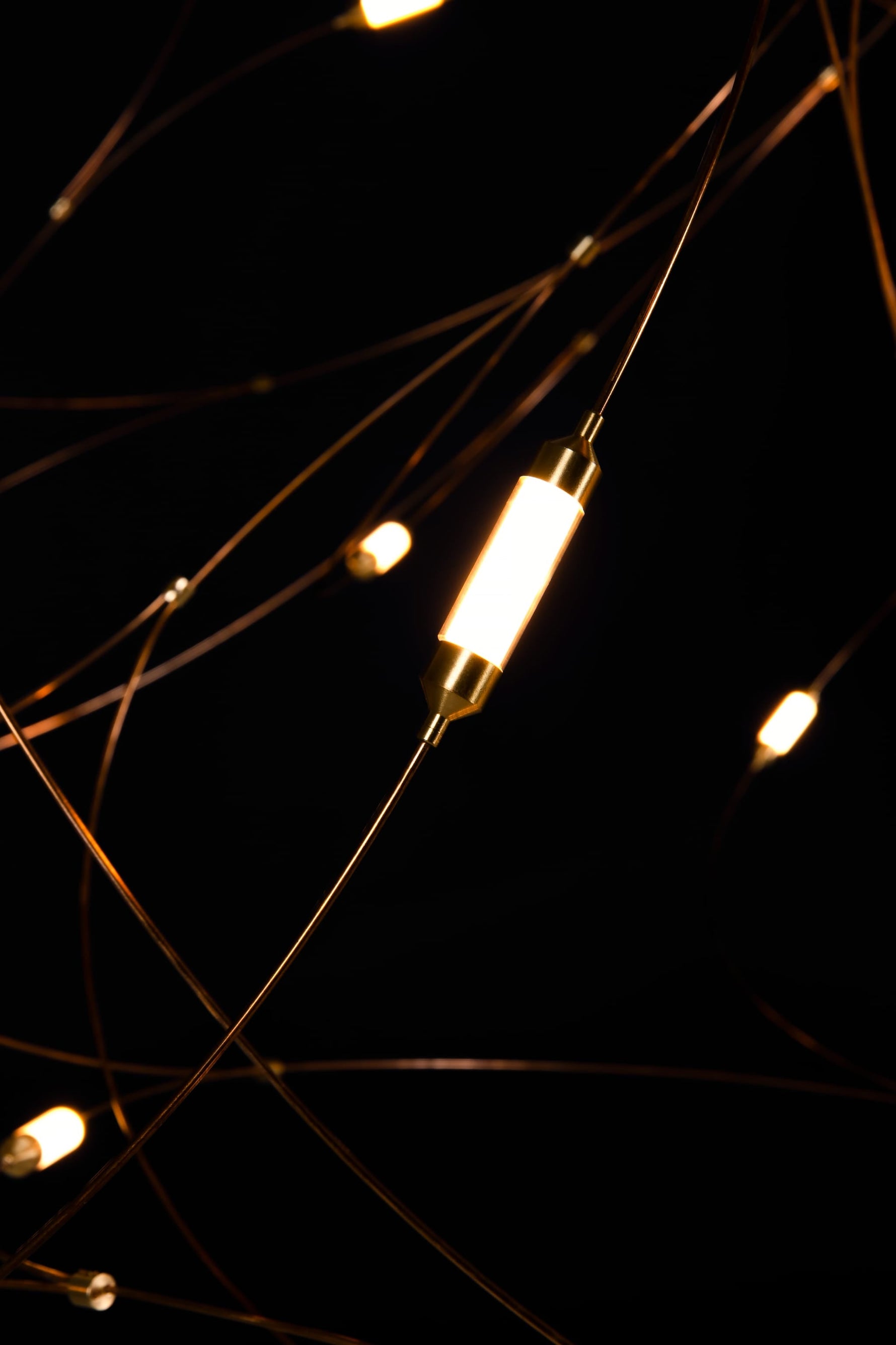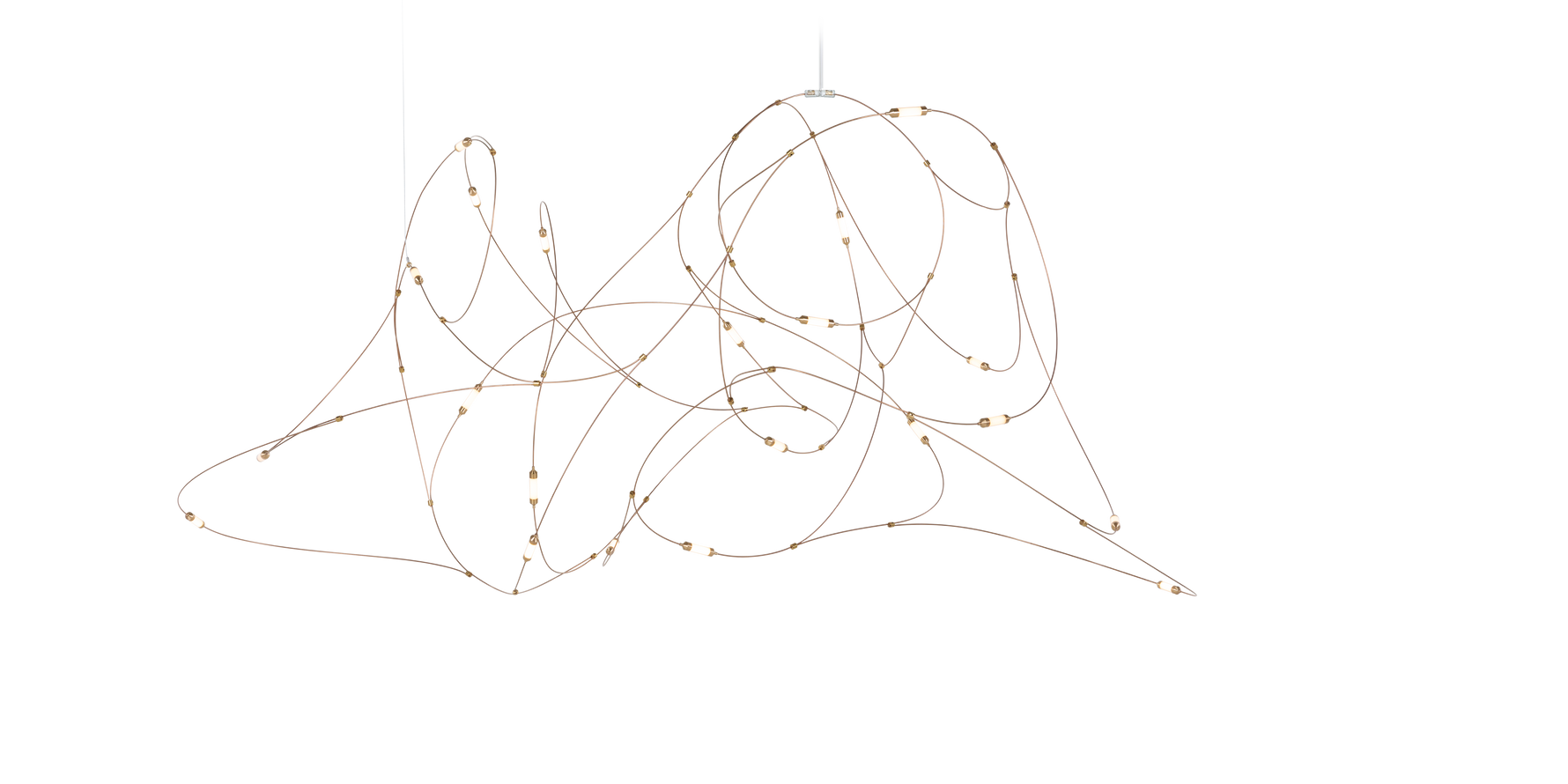- Crafted with meticulous attention to detail, the Flock features an elegant framework of fine, hand-bent bronze wires that create soft, organic curves. Suspended within this delicate structure are solid brass cups, housing energy-efficient LEDs with frosted diffusers. By day, it’s a light and airy sculptural element, adding a touch of modern elegance to your space. As dusk falls, it undergoes a magical transformation. The individual lights ignite like a swarm of gentle beetles, casting a soft, inviting, and warm glow that banishes harsh shadows.
