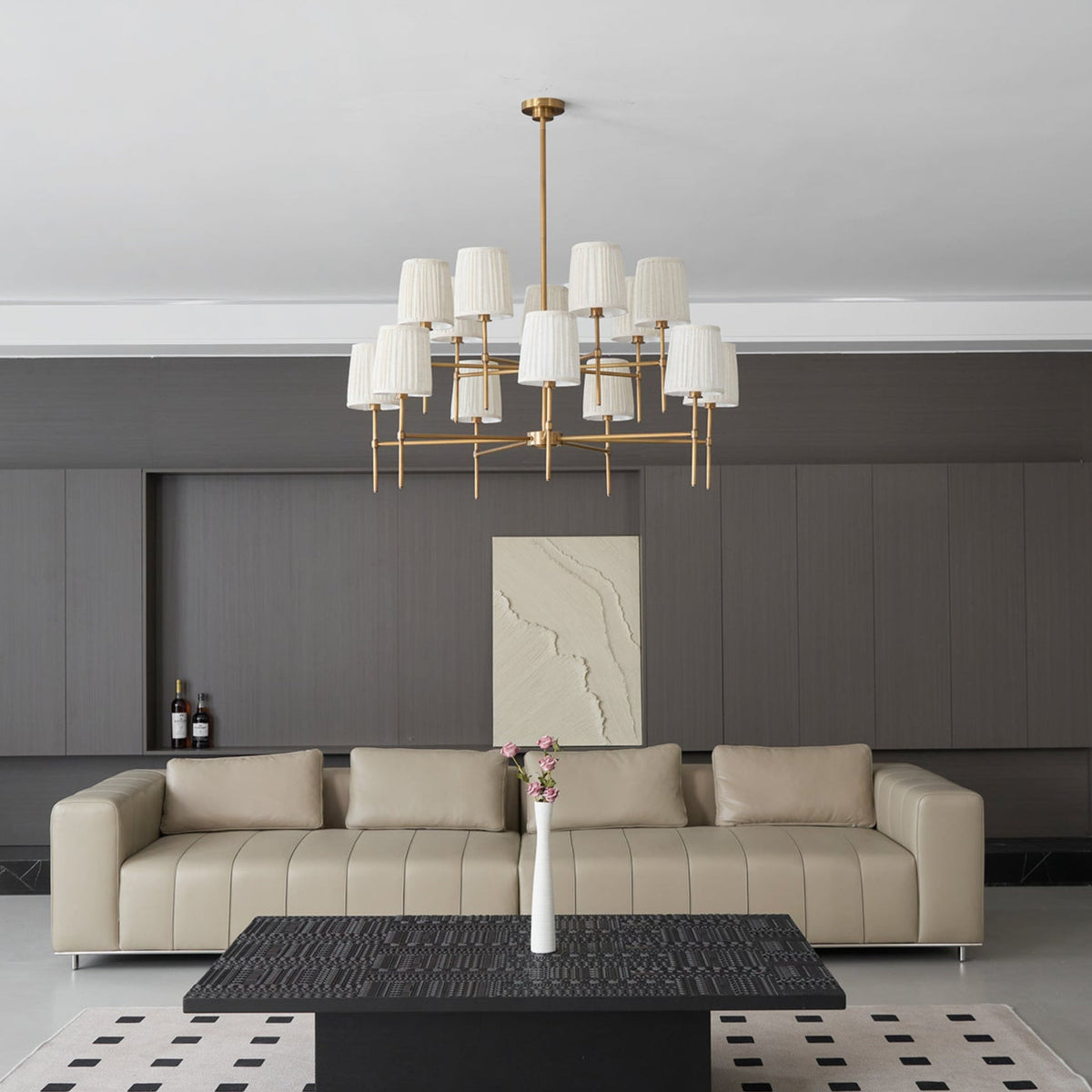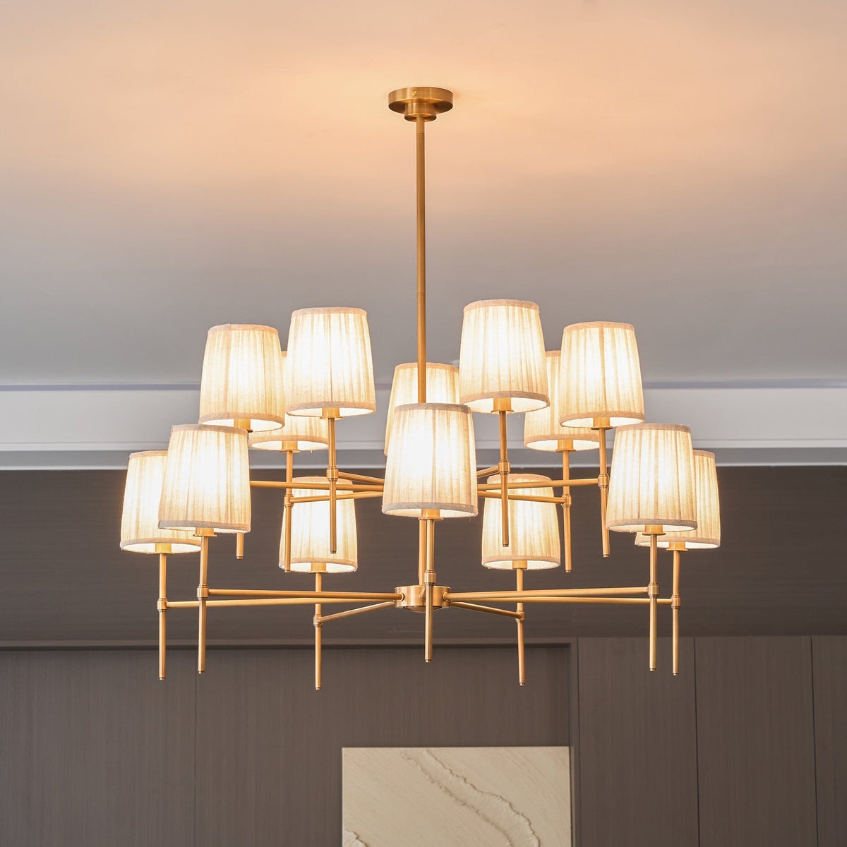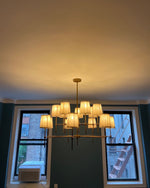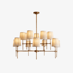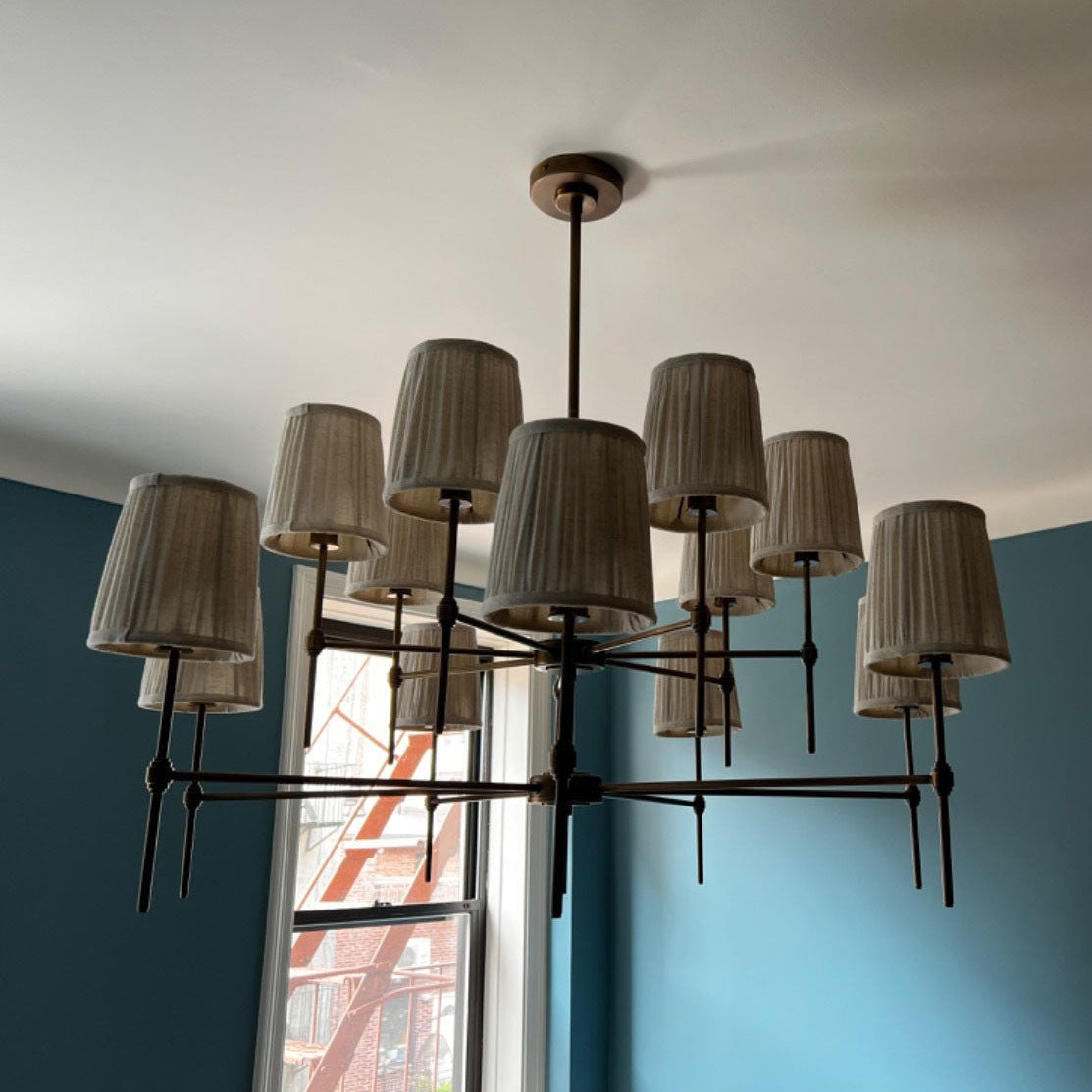 - Elevate your space with the Isobella Chandelier, a stunning lighting piece inspired by the classic interiors of Babington House. Crafted with meticulous attention to detail, this chandelier features fourteen hand-pleated linen shades, each individually lined in soft cotton for a refined, diffused glow.The antique brass-plated frame adds a touch of vintage charm, while the hand-trimmed shades create a beautifully balanced silhouette.