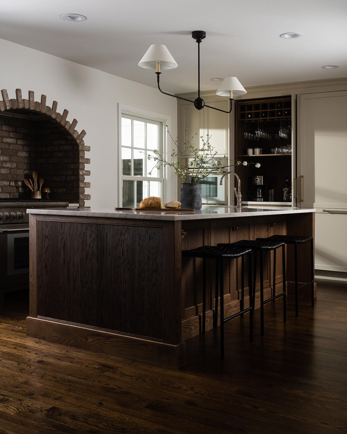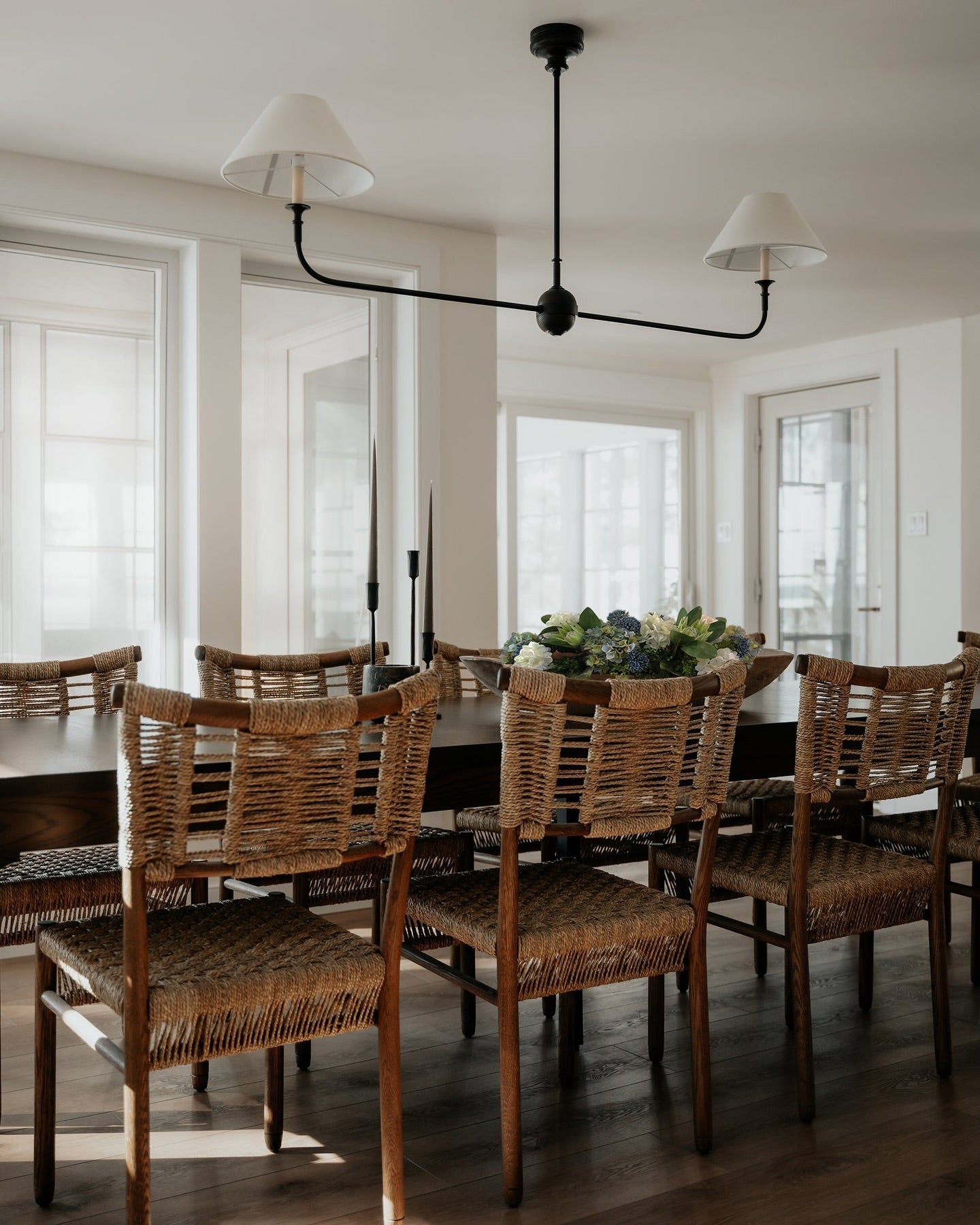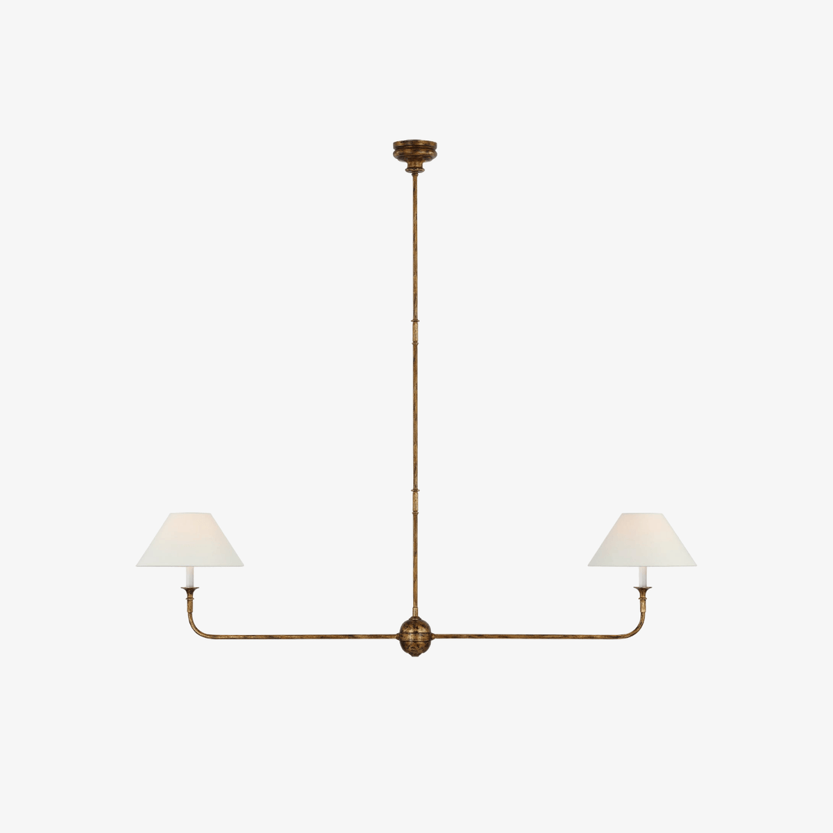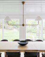- Experience the perfect blend of classic and contemporary design with the Kati Linear Pendant Light. This elegant fixture features natural brass bars that intersect with brass hubs, creating a visually striking and airy composition. The simple candles and white conical shades add a touch of warmth and sophistication. The juxtaposition of traditional forms with modern details makes the Kati Linear Pendant Light a versatile piece that complements a variety of interior styles.