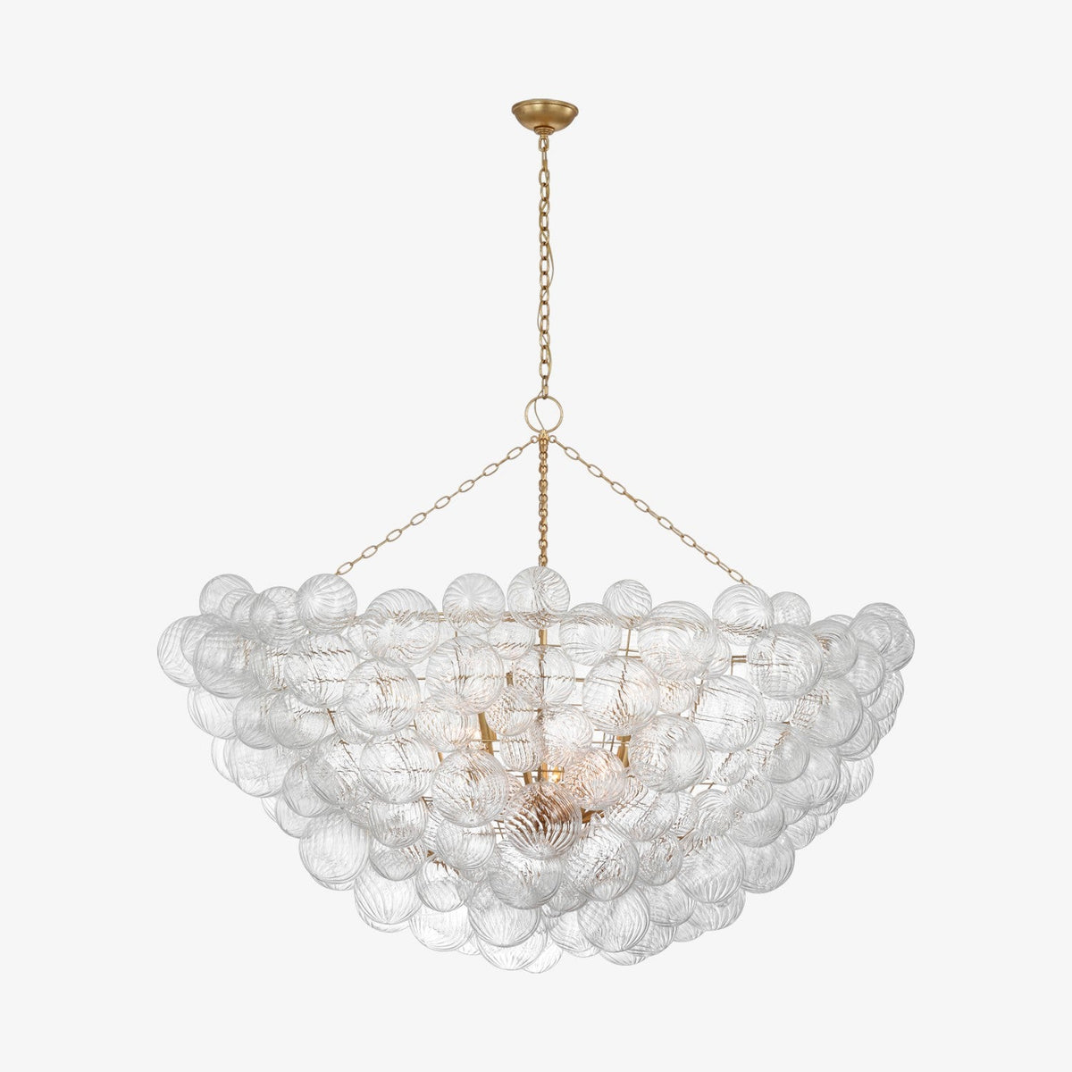 • Elevate your space from ordinary to extraordinary with the Talia 66-Inch Chandelier. This piece reimagines the classic globe light, transforming it into a stunning sculptural statement. Artisanal, swirled glass orbs are nestled within sleek metal baskets, creating a captivating play of light and texture. As the light dances and shimmers through each unique glass sphere, it casts a warm, inviting glow, perfect for setting a sophisticated yet playful mood.
