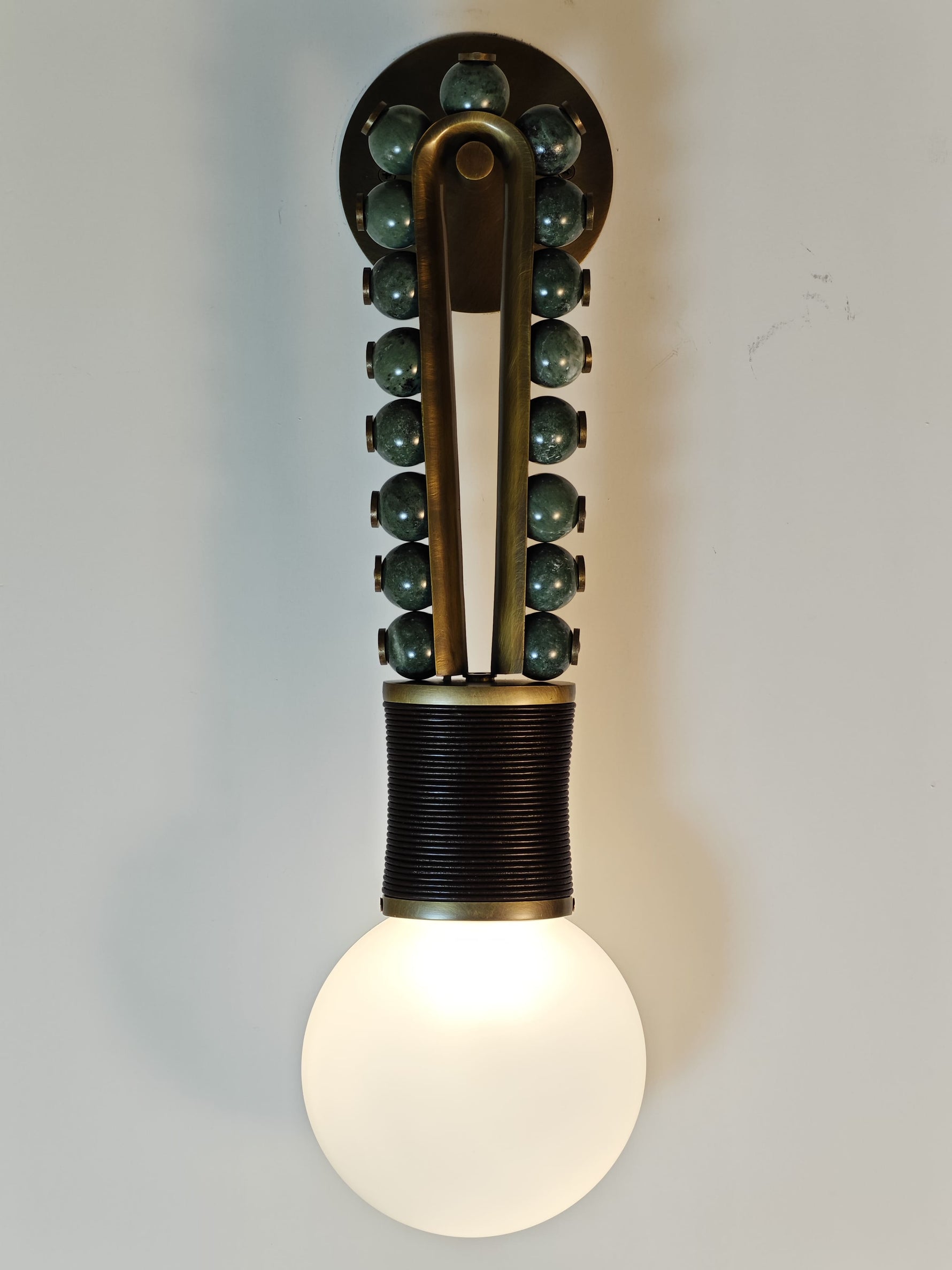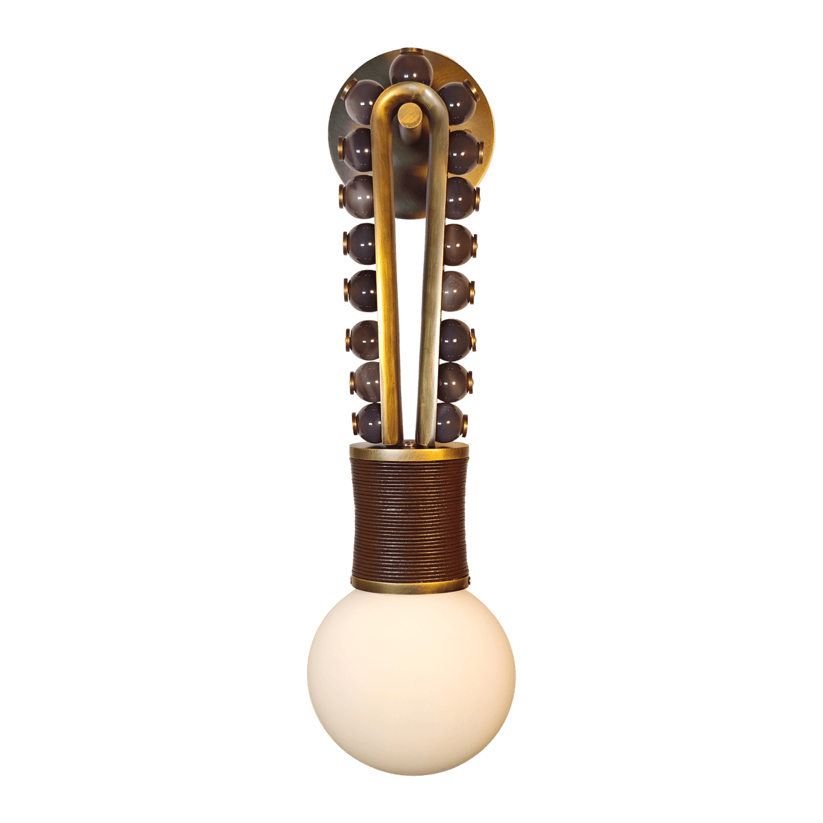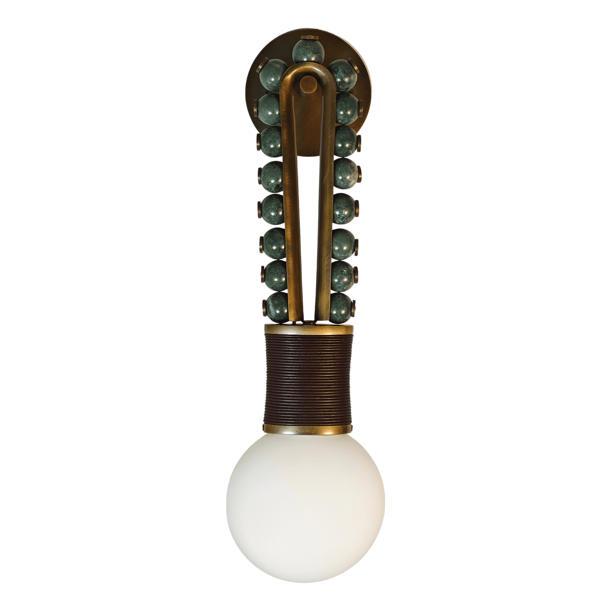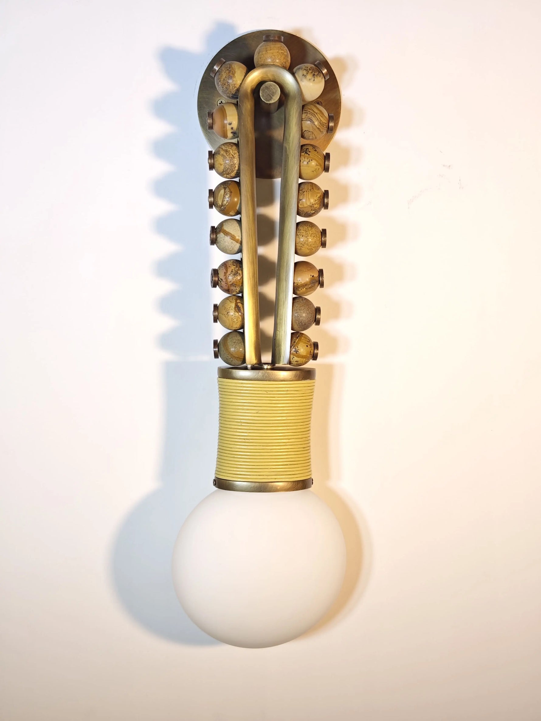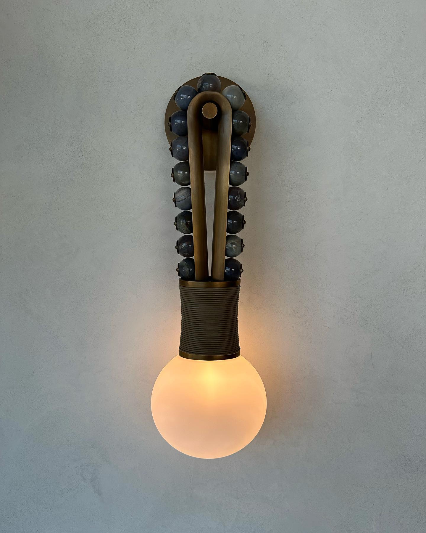 - The Talisman Loop Sconce is a work of art in itself. Inspired by the intricate details of ancient Persian architecture, this one-of-a-kind sconce features a captivating display of semi-precious stones. Agate, jasper, and jade beads are delicately pierced and secured to a hand-crafted brass frame, creating a truly unique and luxurious lighting experience.
