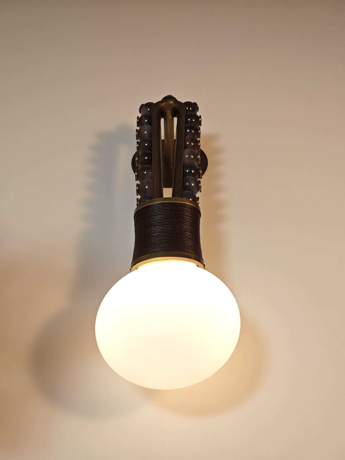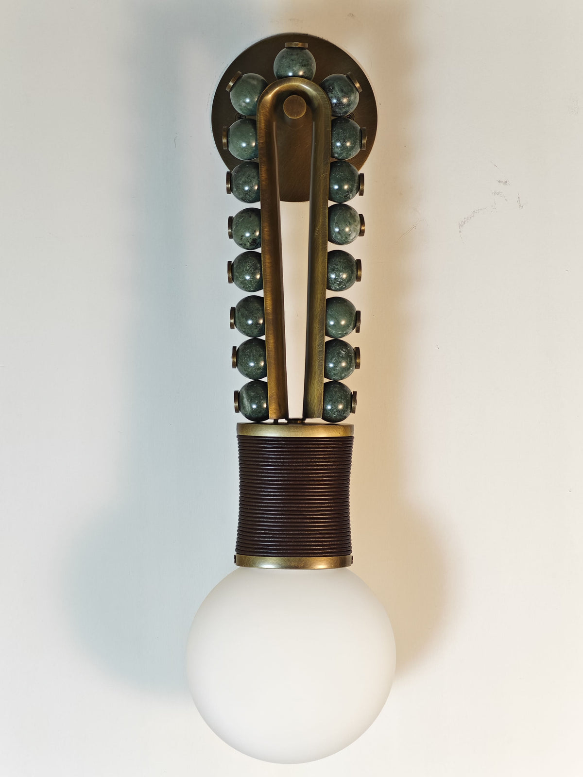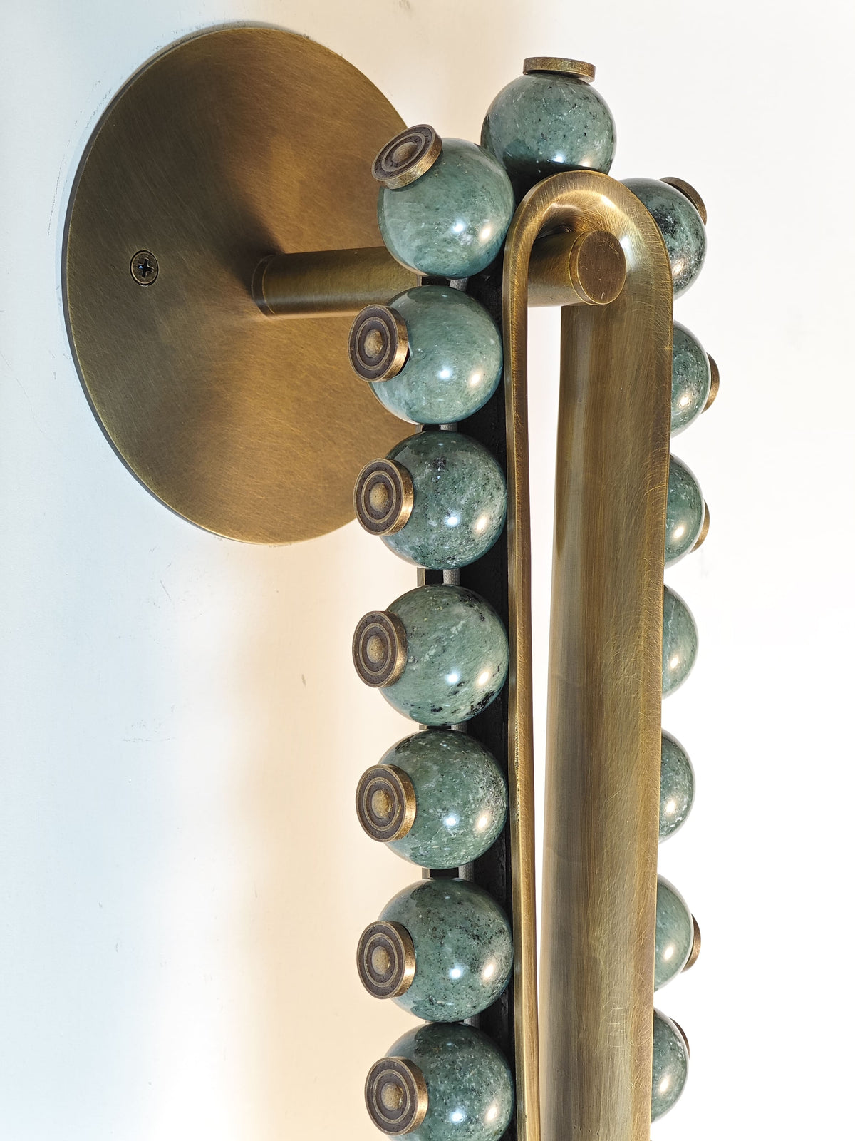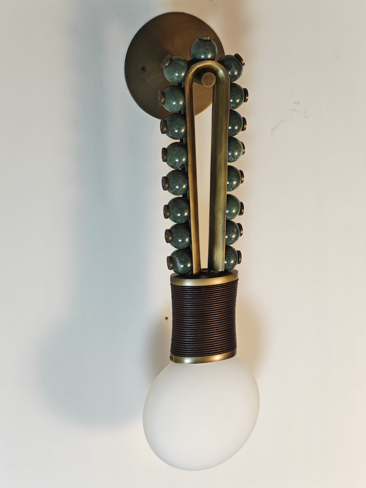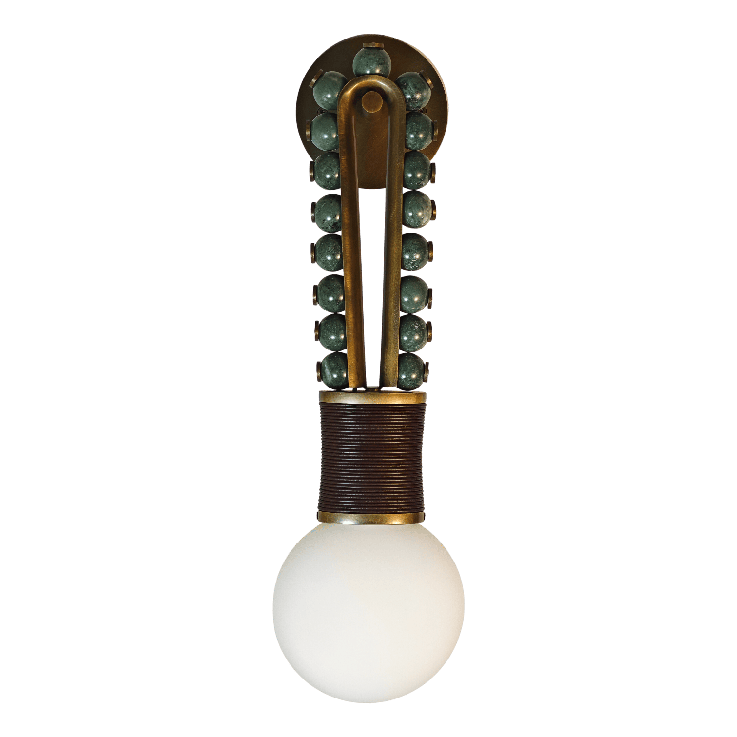 - The Talisman Loop Sconce is a work of art in itself. Inspired by the intricate details of ancient Persian architecture, this one-of-a-kind sconce features a captivating display of semi-precious stones. Agate, jasper, and jade beads are delicately pierced and secured to a hand-crafted brass frame, creating a truly unique and luxurious lighting experience.