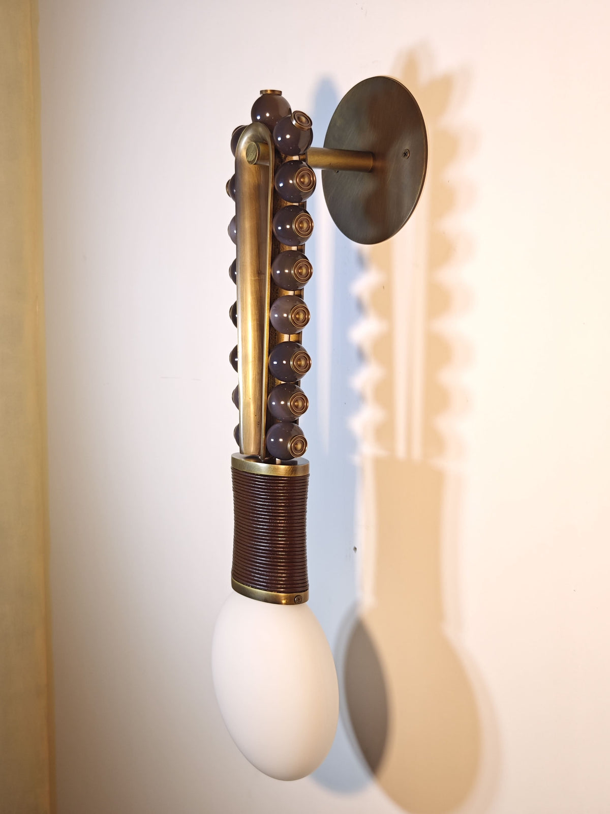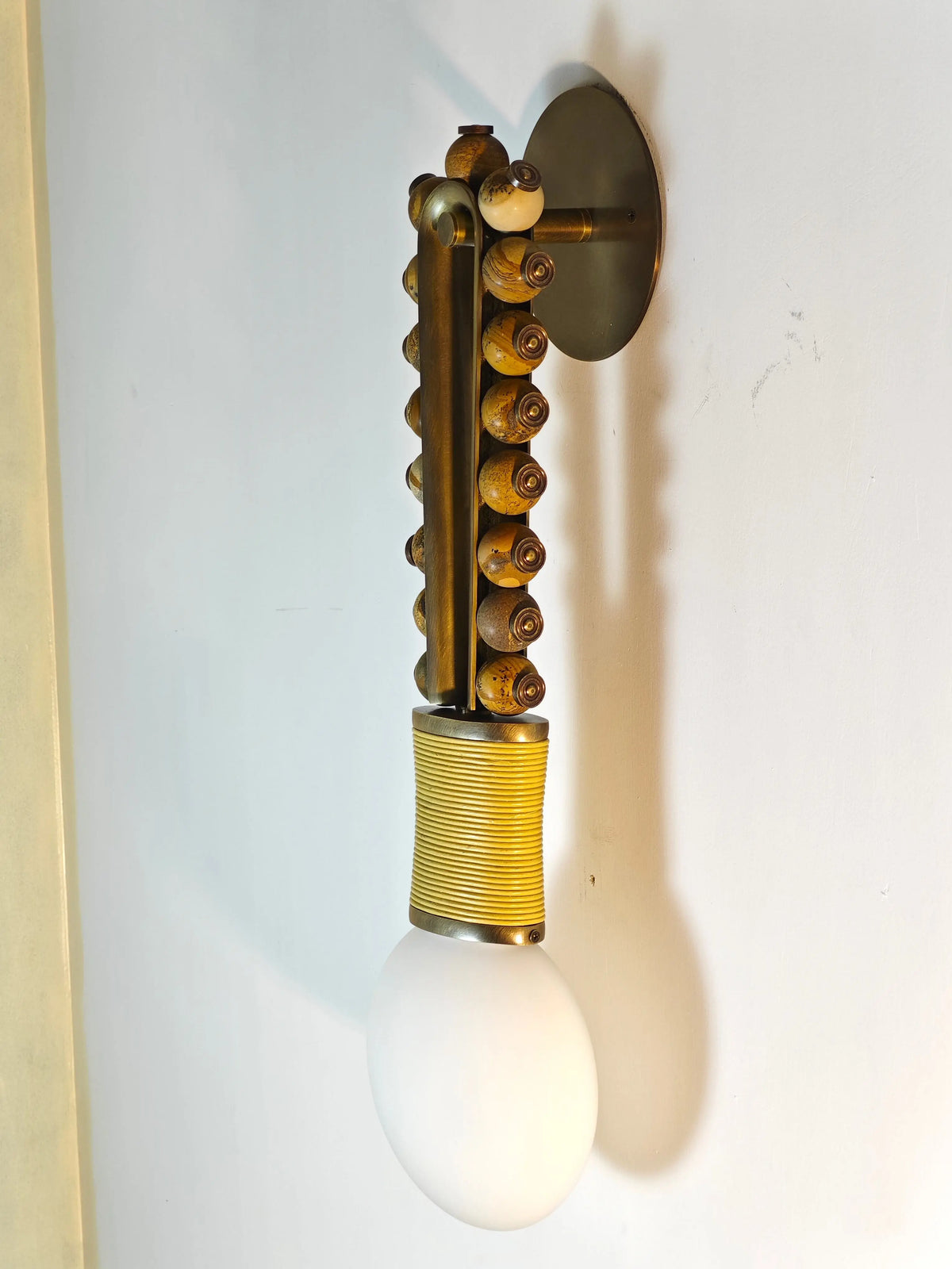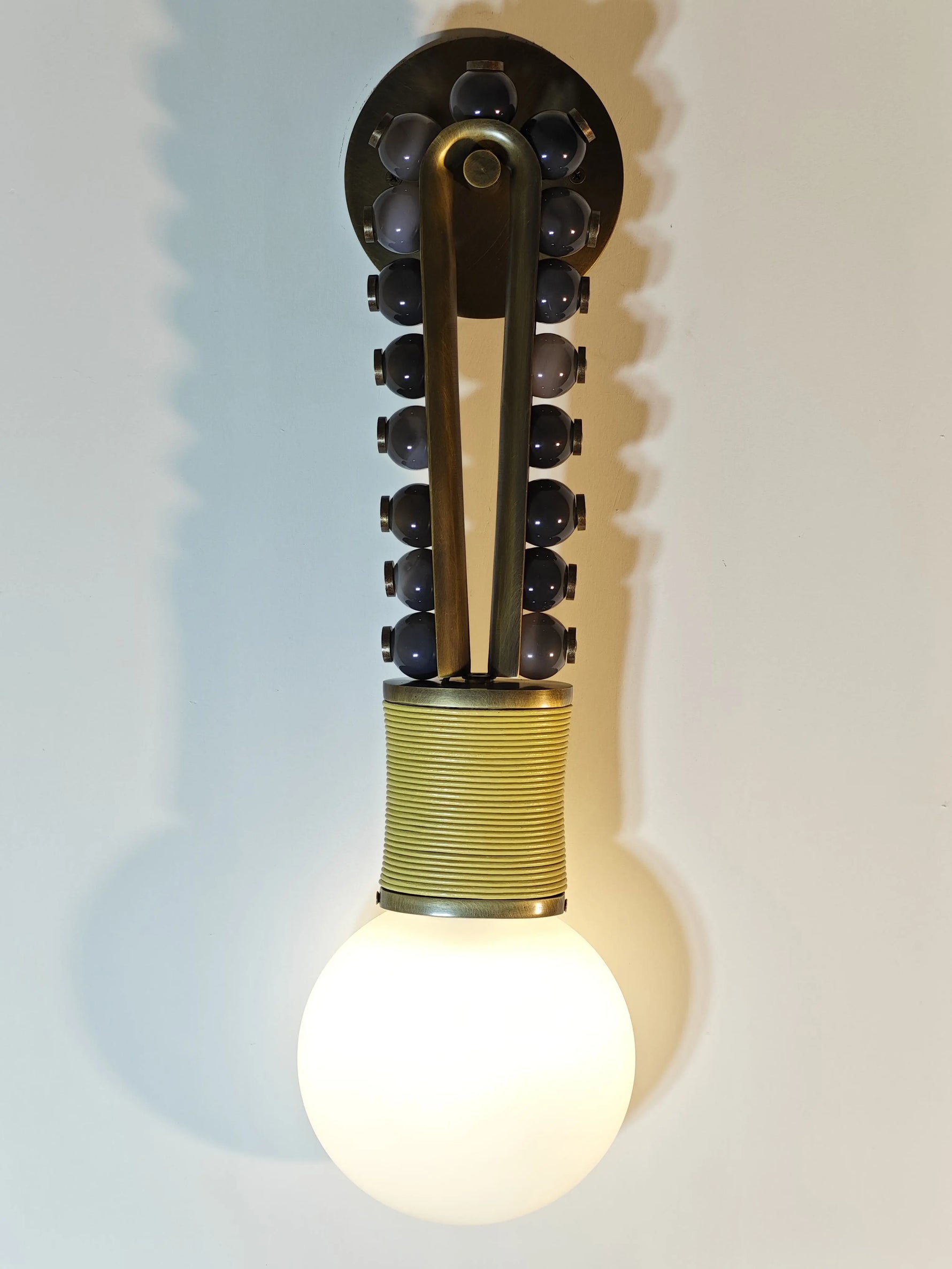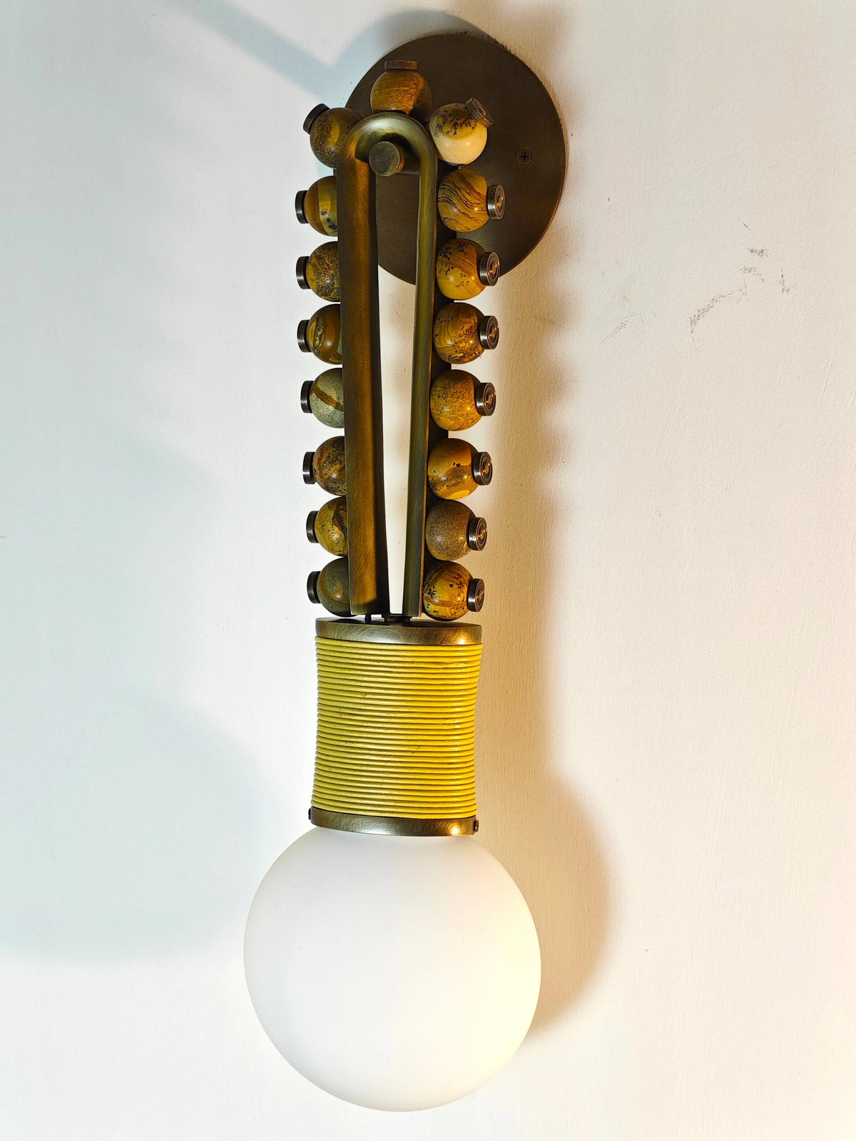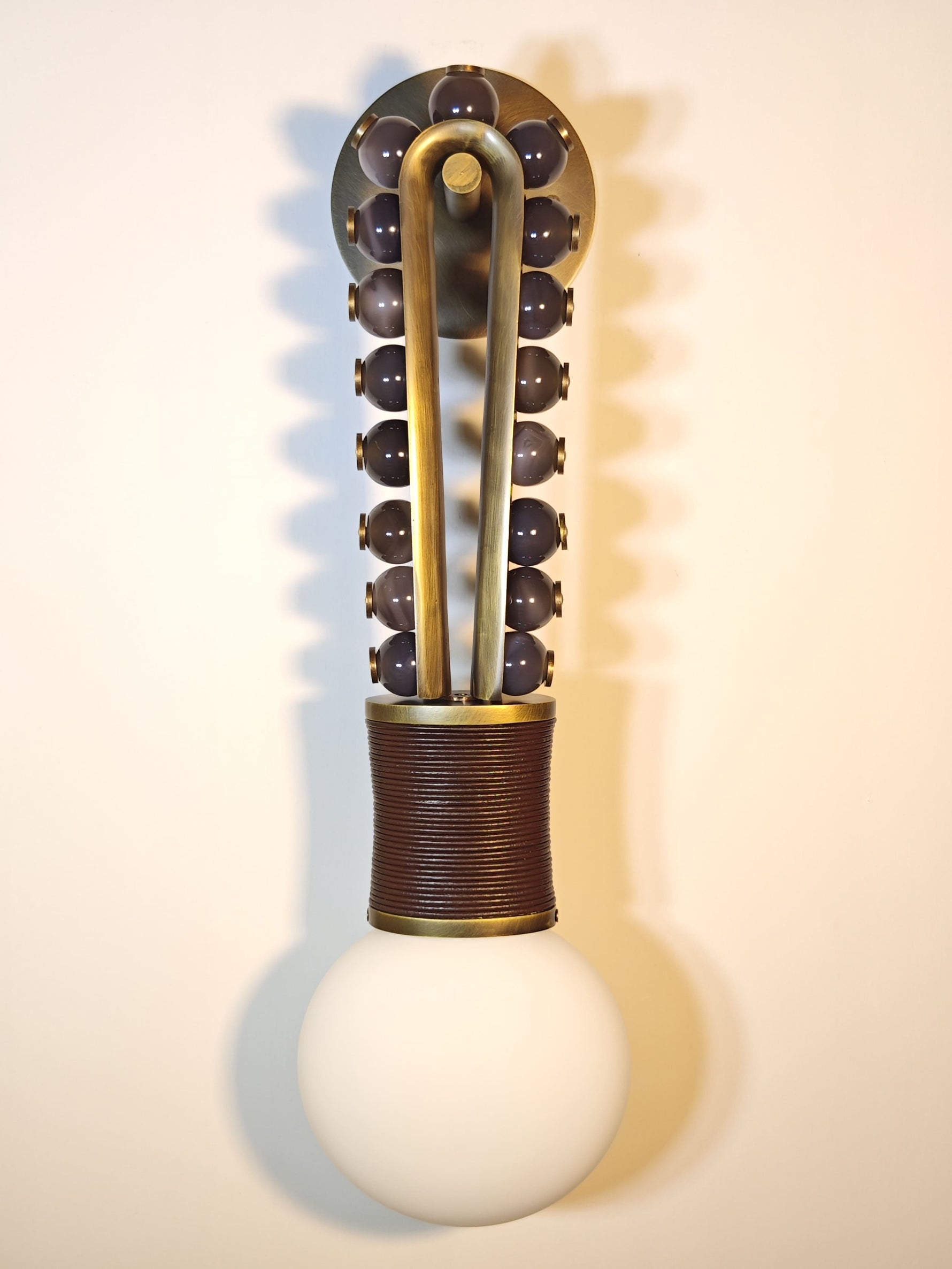 - The Talisman Loop Sconce is a work of art in itself. Inspired by the intricate details of ancient Persian architecture, this one-of-a-kind sconce features a captivating display of semi-precious stones. Agate, jasper, and jade beads are delicately pierced and secured to a hand-crafted brass frame, creating a truly unique and luxurious lighting experience.