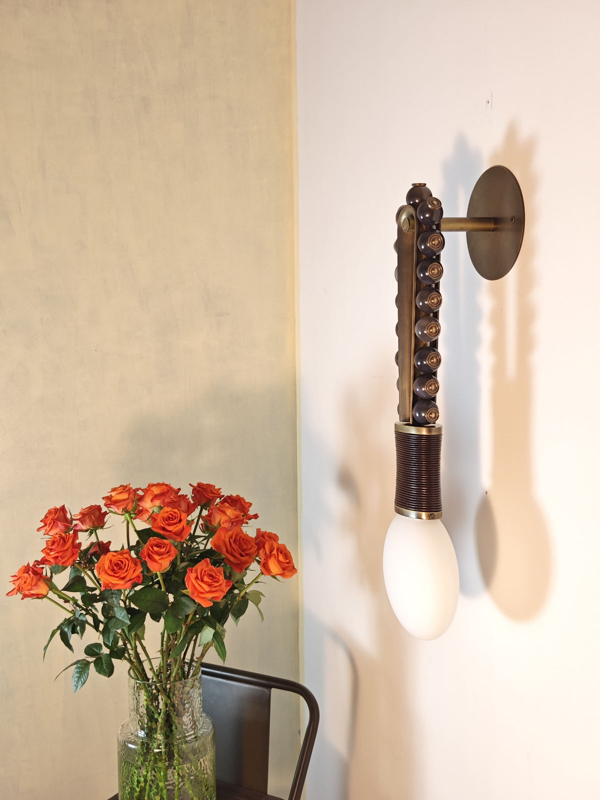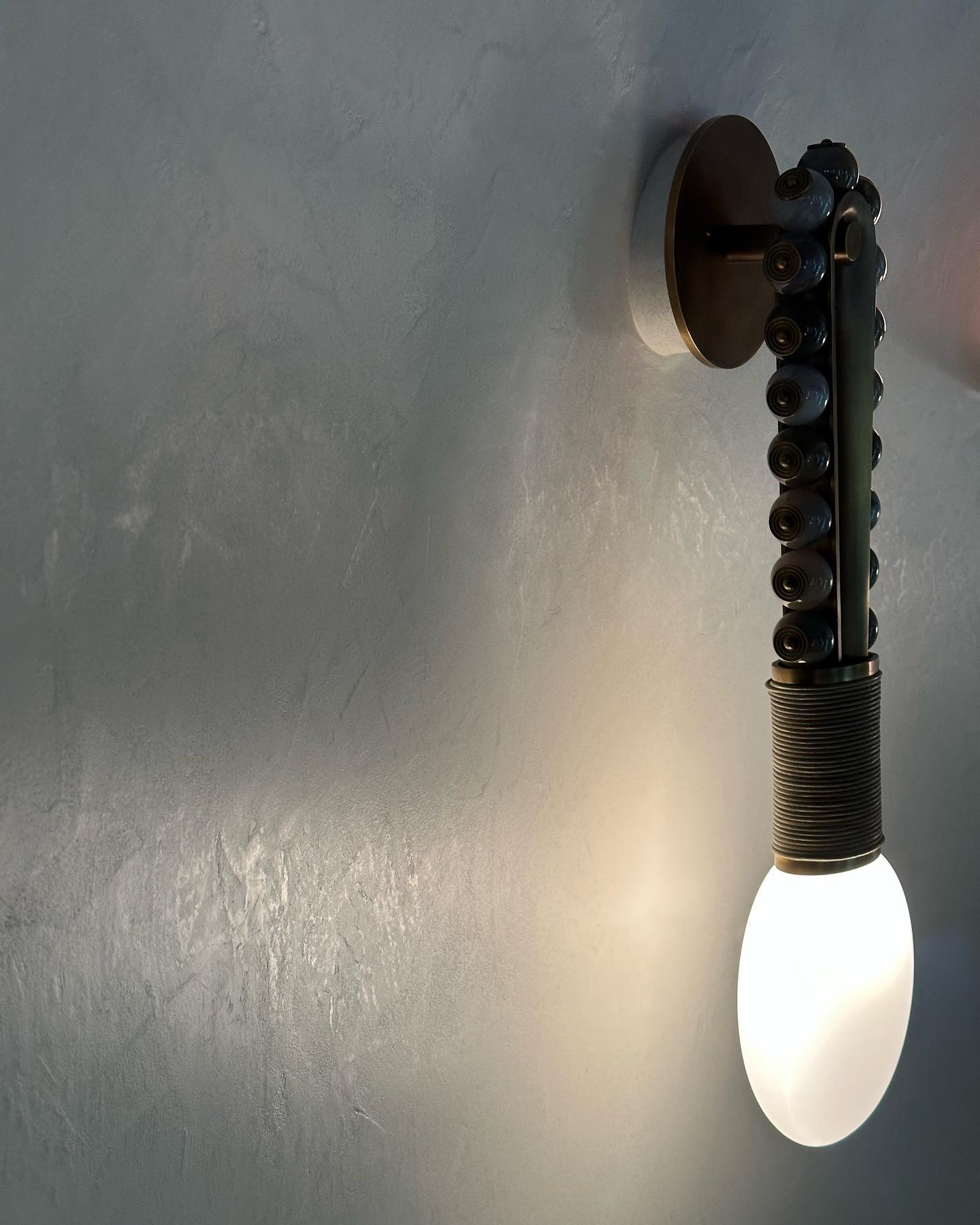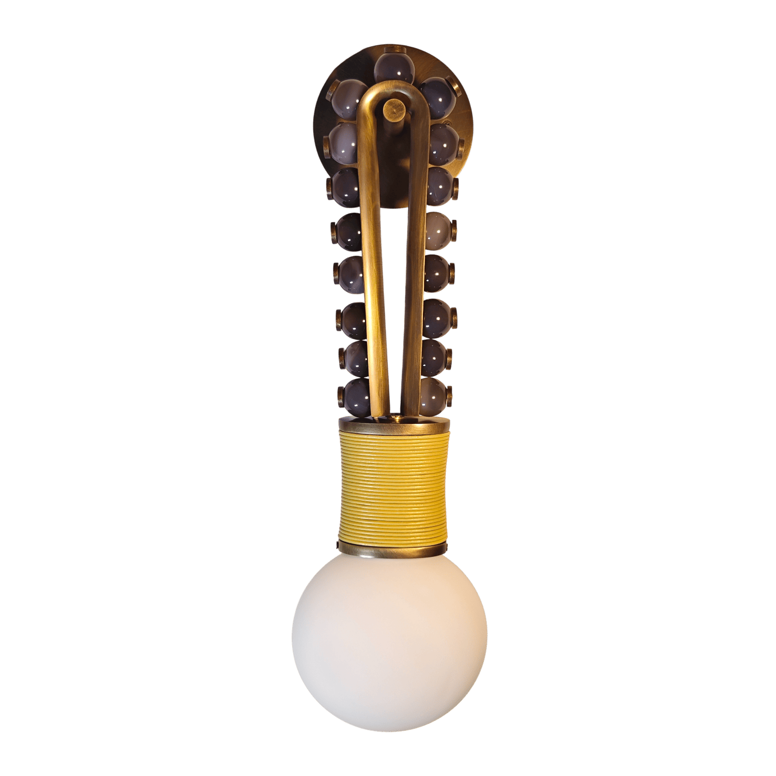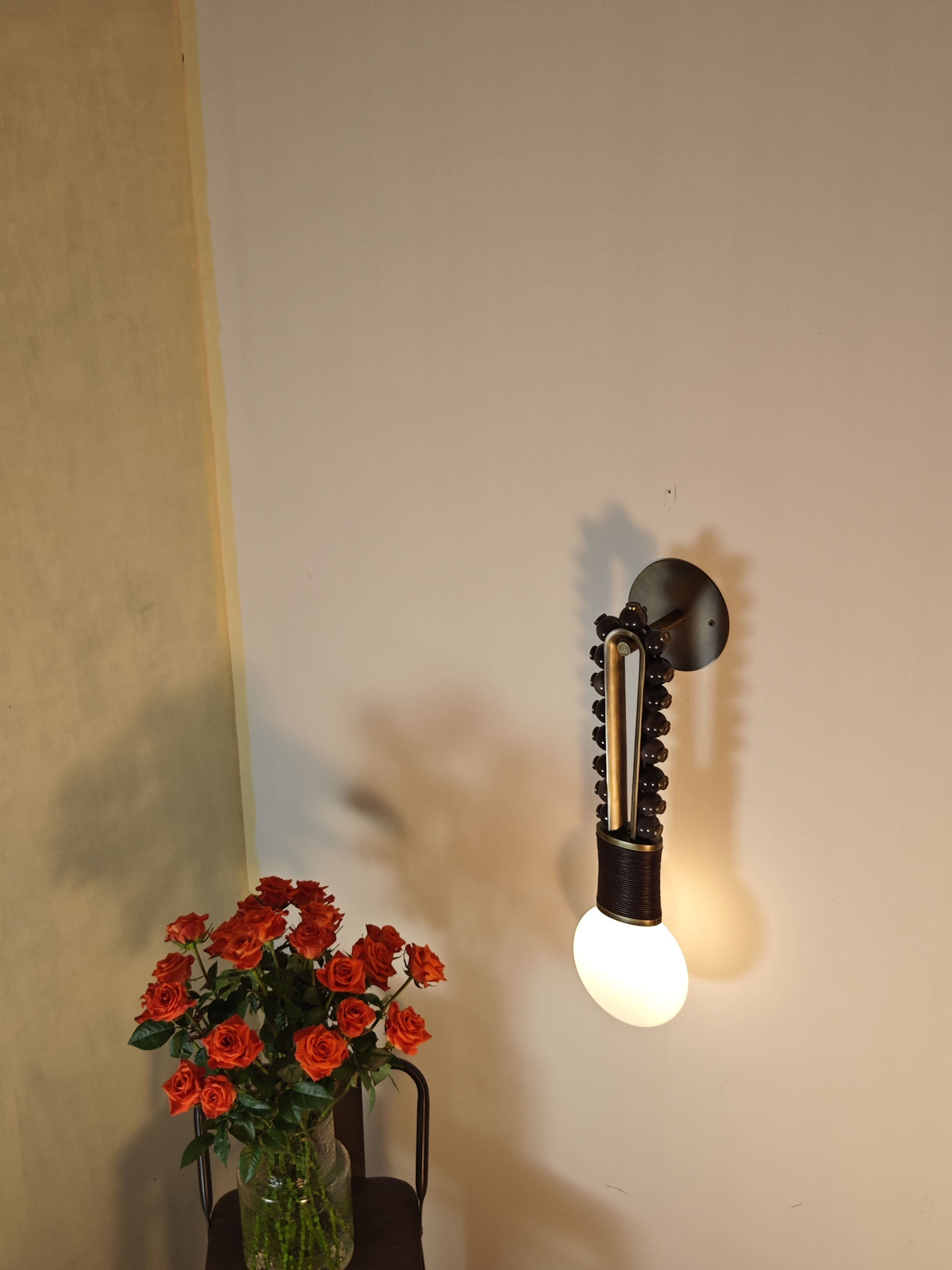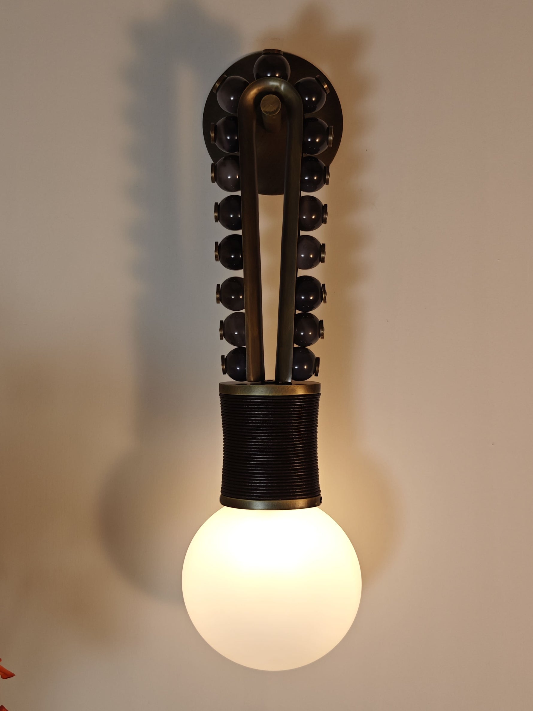 - The Talisman Loop Sconce is a work of art in itself. Inspired by the intricate details of ancient Persian architecture, this one-of-a-kind sconce features a captivating display of semi-precious stones. Agate, jasper, and jade beads are delicately pierced and secured to a hand-crafted brass frame, creating a truly unique and luxurious lighting experience.