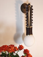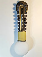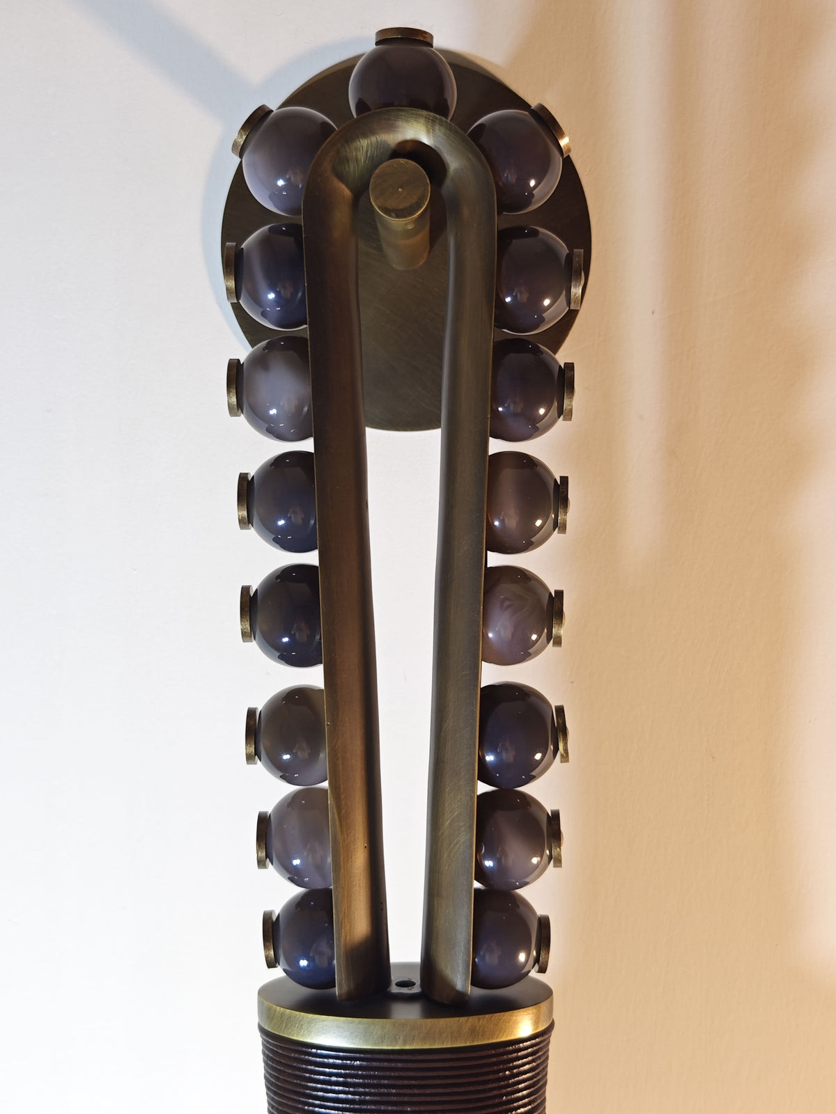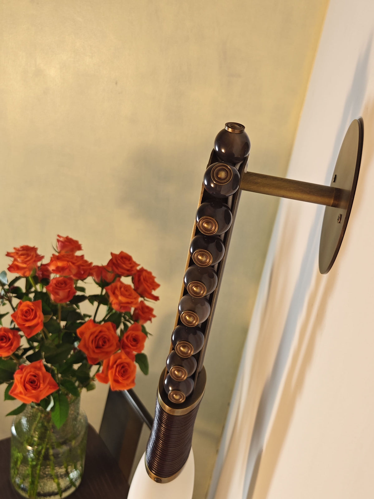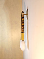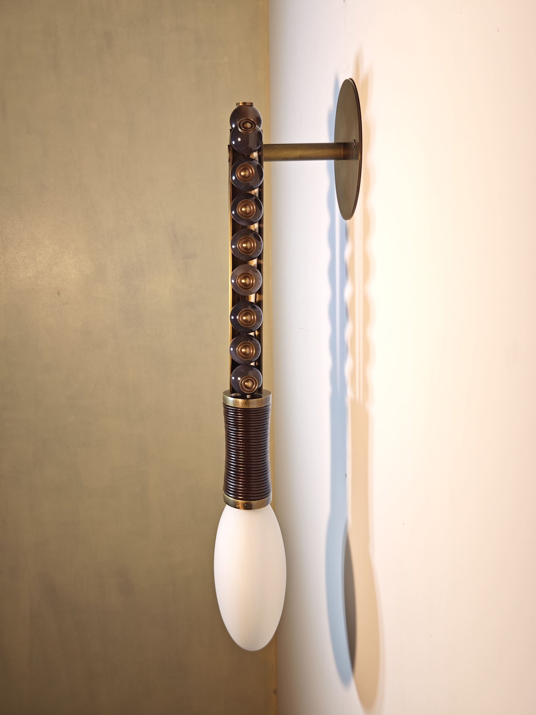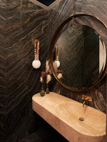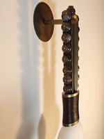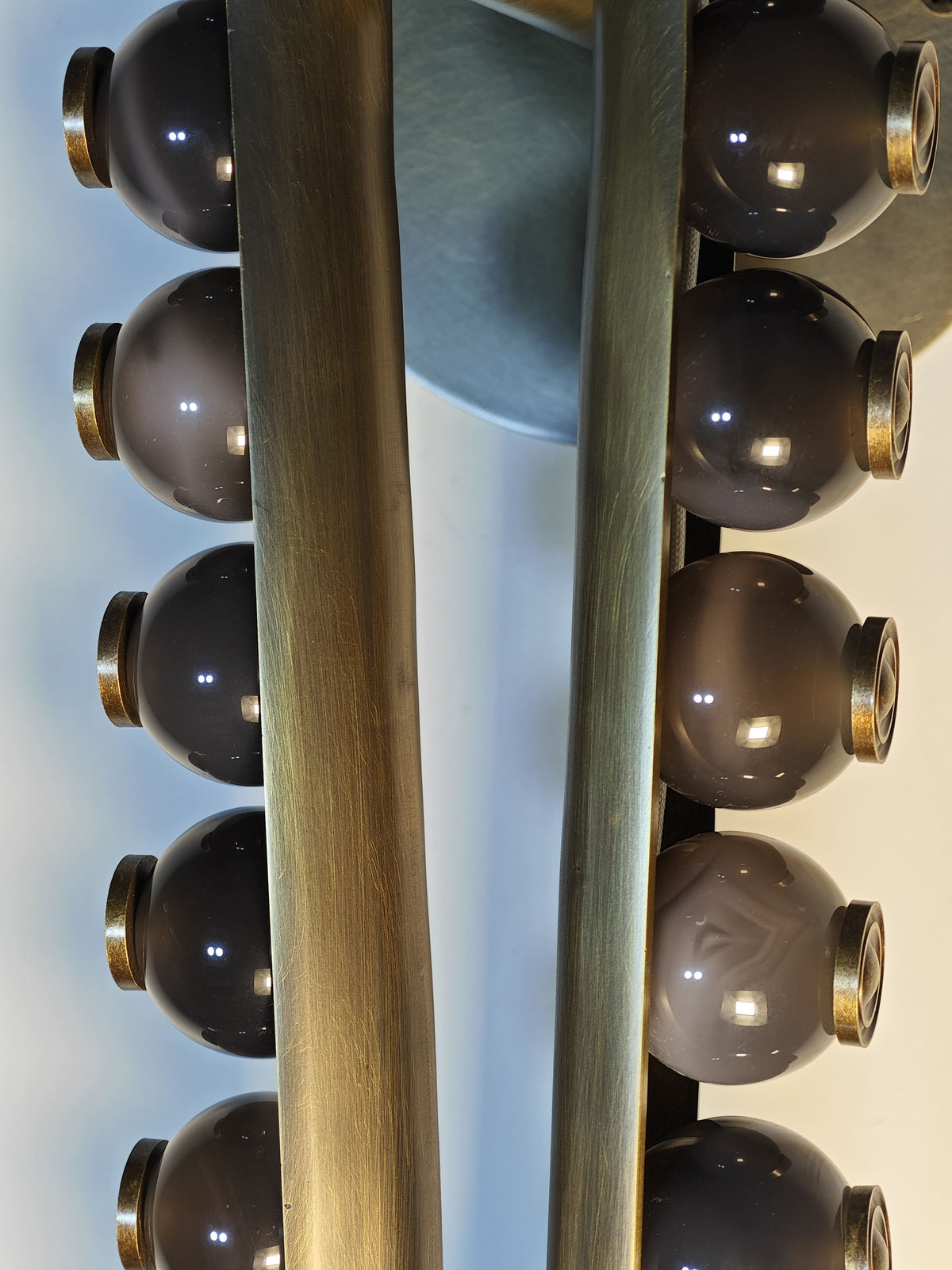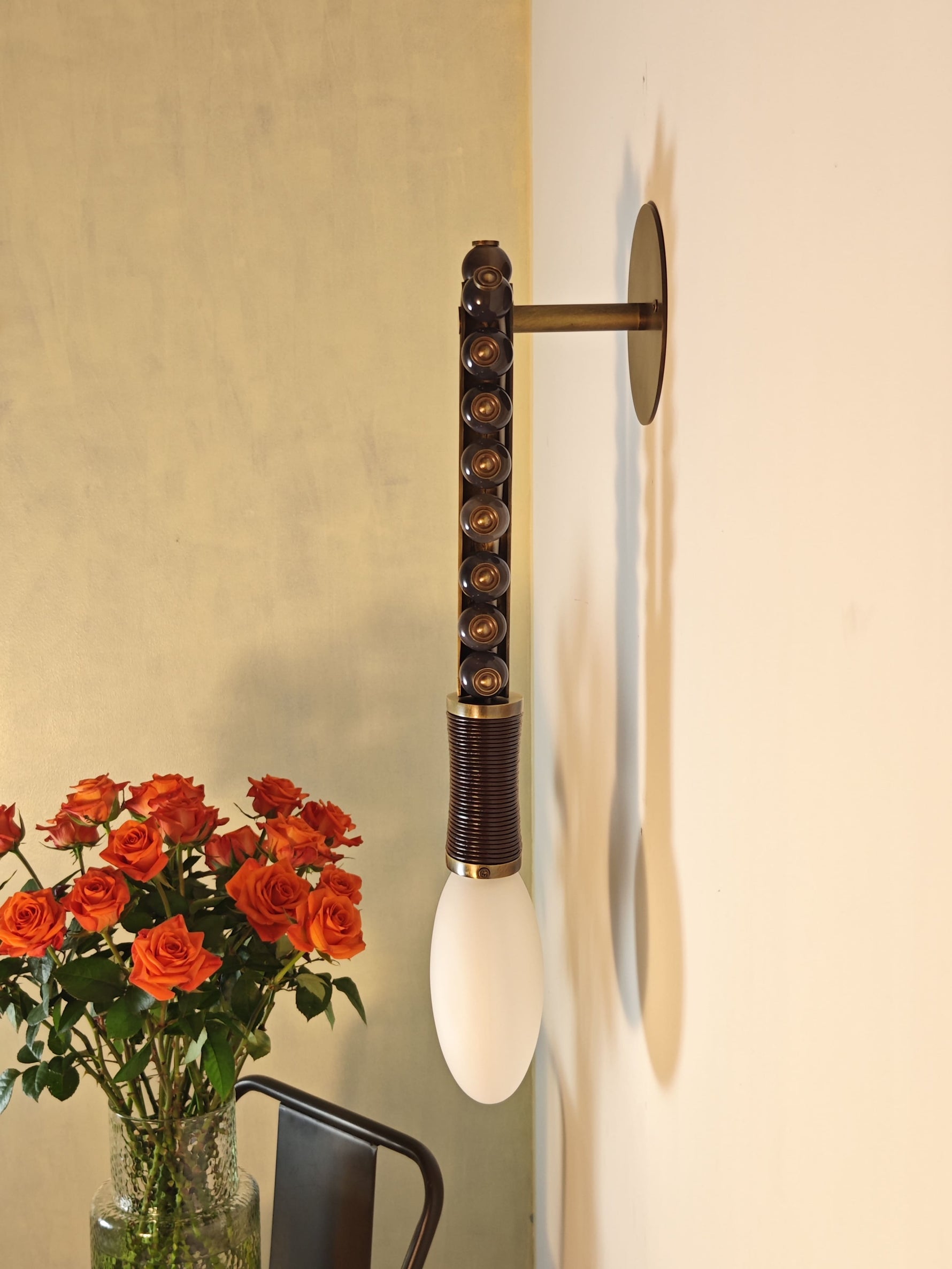 - The Talisman Loop Sconce is a work of art in itself. Inspired by the intricate details of ancient Persian architecture, this one-of-a-kind sconce features a captivating display of semi-precious stones. Agate, jasper, and jade beads are delicately pierced and secured to a hand-crafted brass frame, creating a truly unique and luxurious lighting experience.