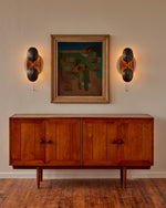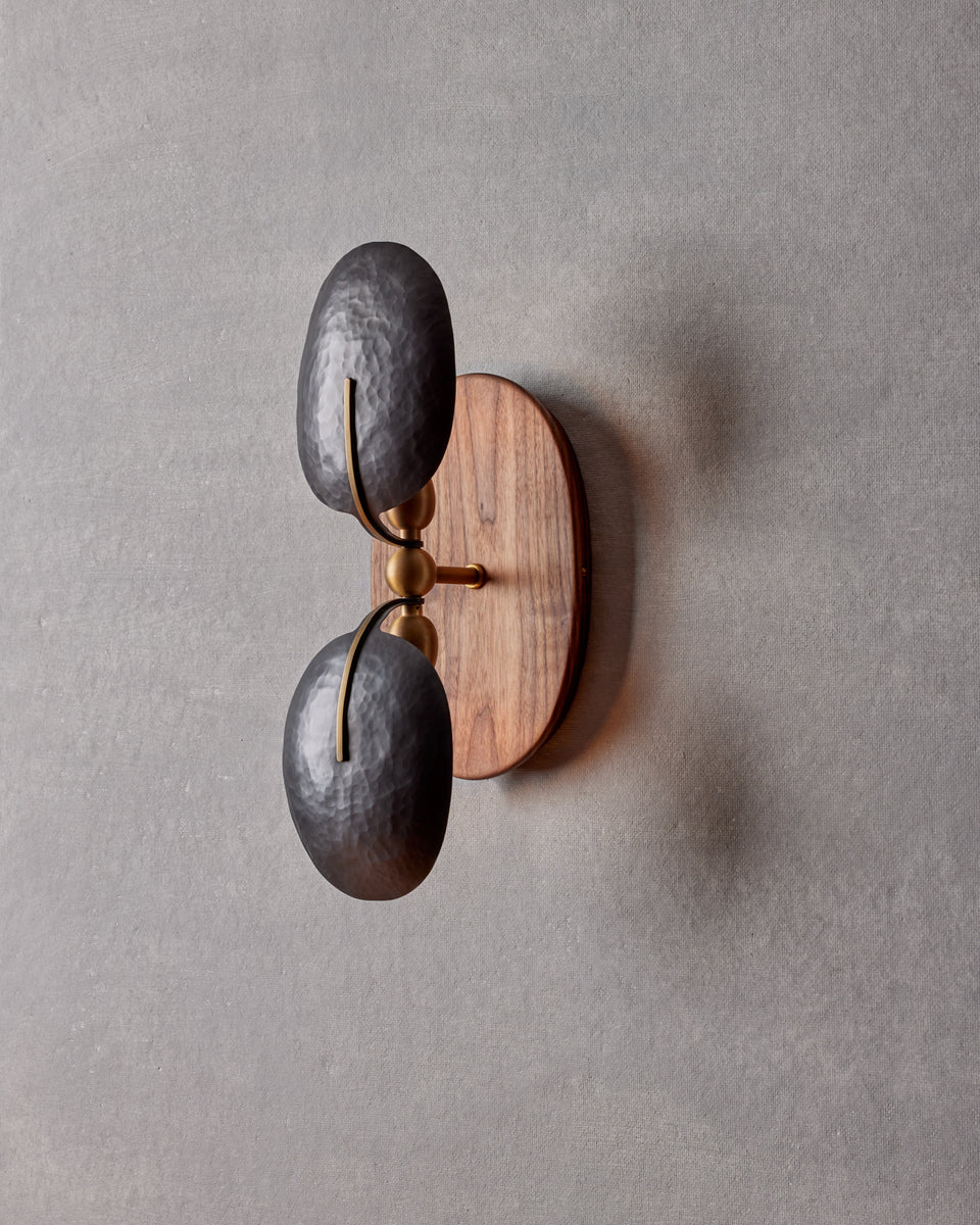 - Every detail begins with the foundation. The sconce is anchored by a hand-finished, solid walnut backplate, expertly milled to a subtle concave curve. This isn't a flat piece of wood; it's a sculptural element that catches the light and creates soft shadows, adding depth and a touch of organic modernity. The rich, varied grain of the walnut ensures that each sconce is utterly unique, bringing the warmth of nature directly into your home.