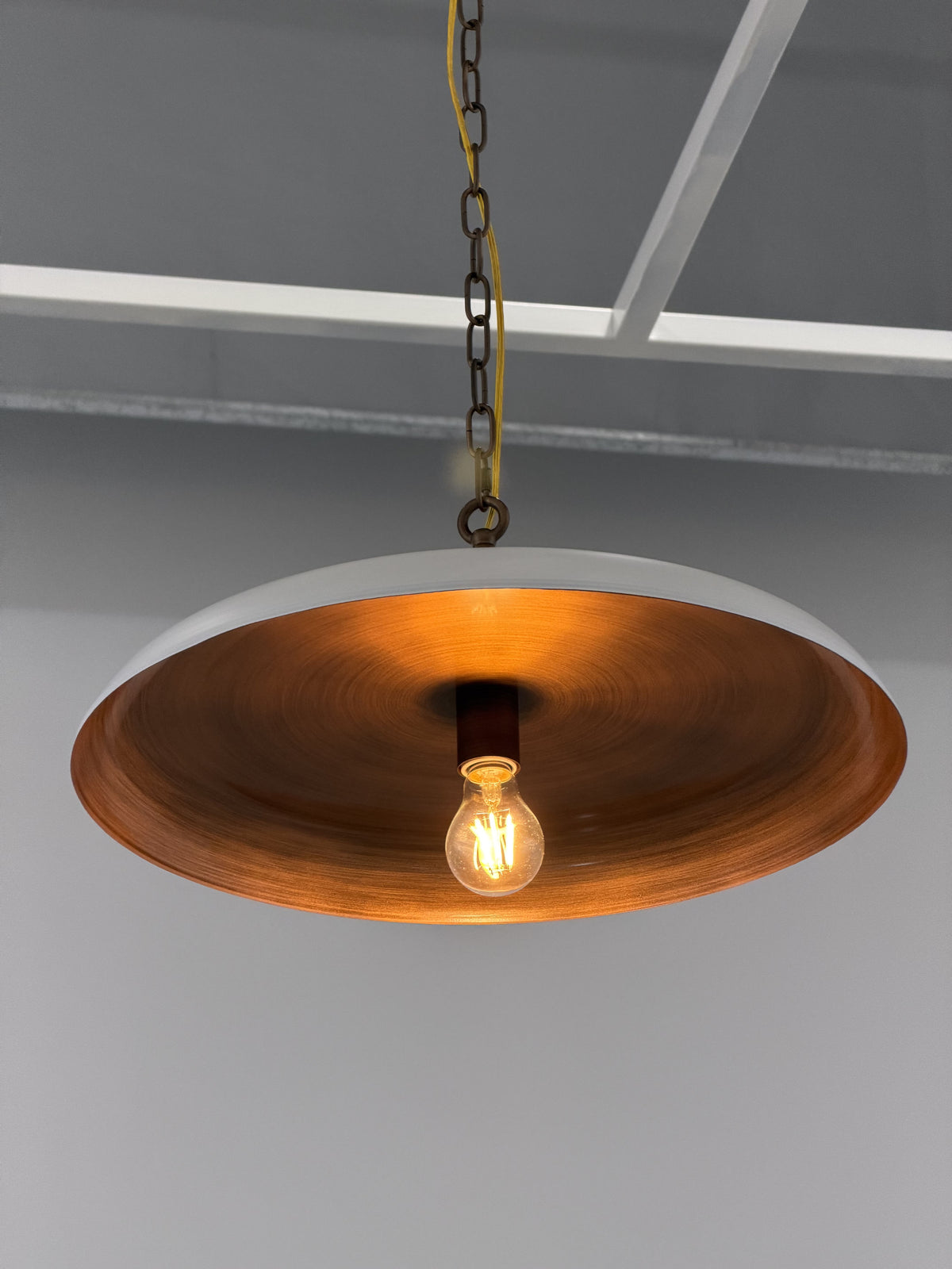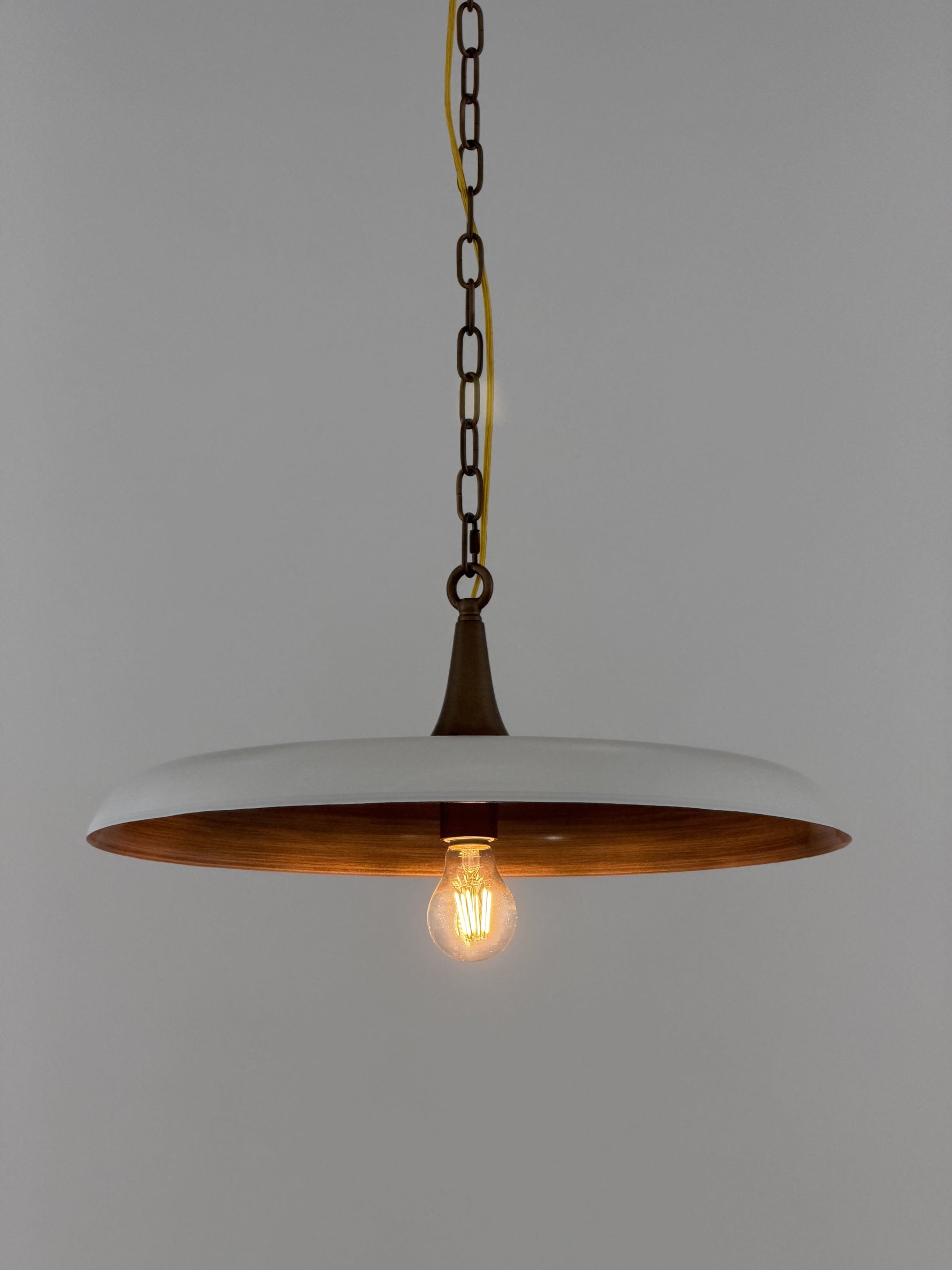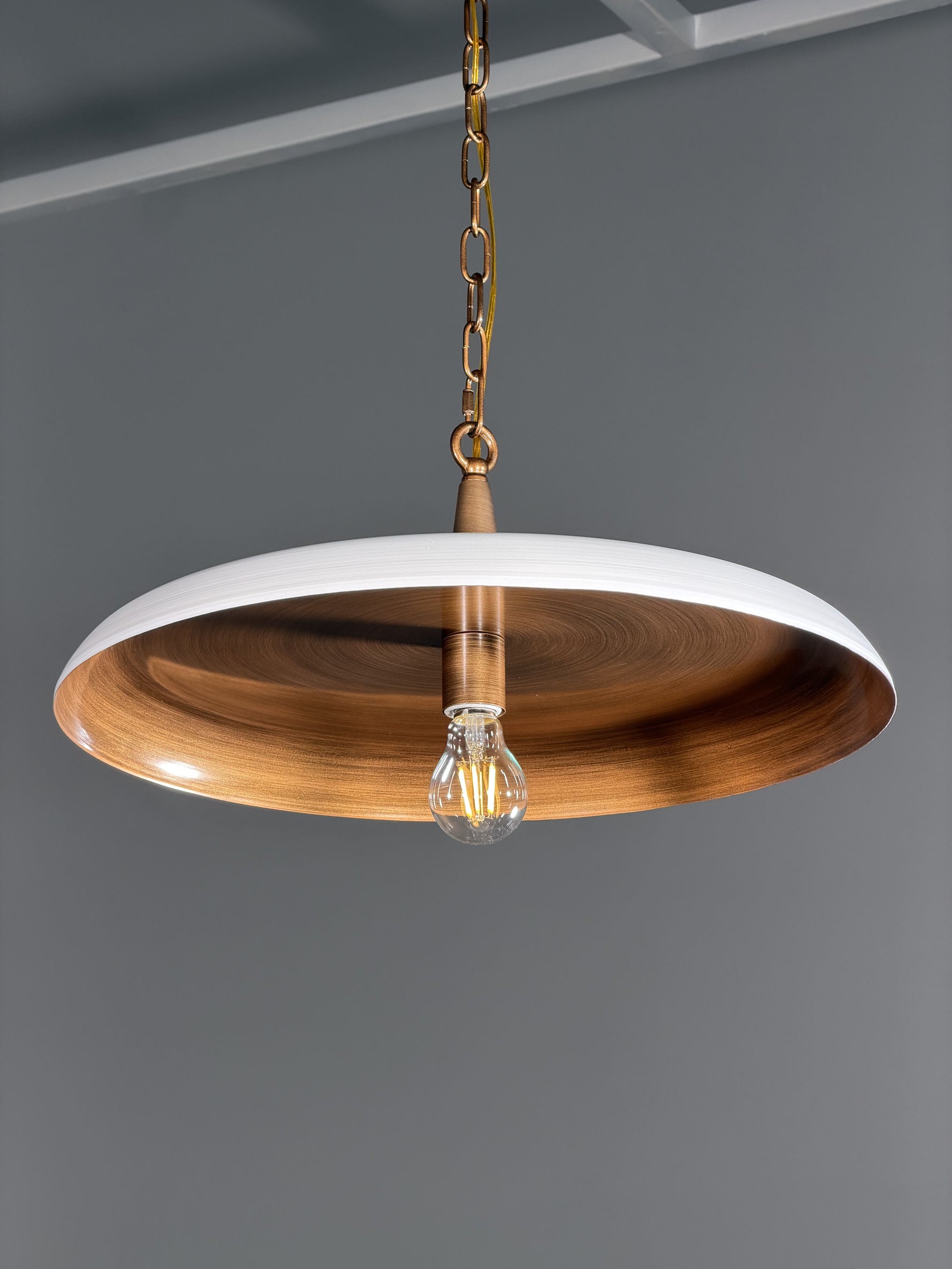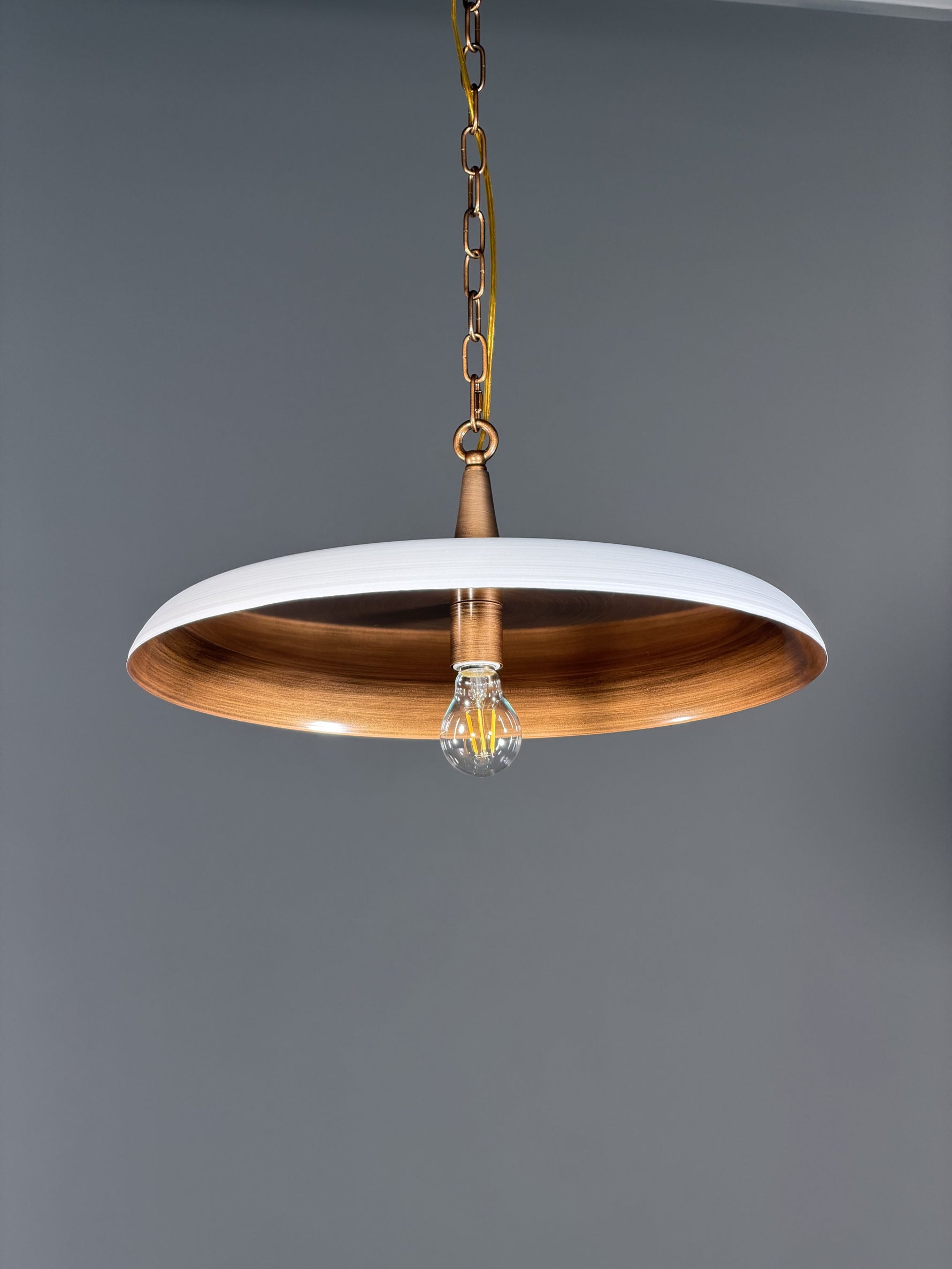 • Inside, a surprise awaits: a warm, brushed vintage brass coating. This inner layer works to transform the light, casting it in a warmer, golden hue that is reflected softly downward. The result is an inviting and ambient atmosphere, perfect for creating a focal point of understated luxury and comfort in your home.