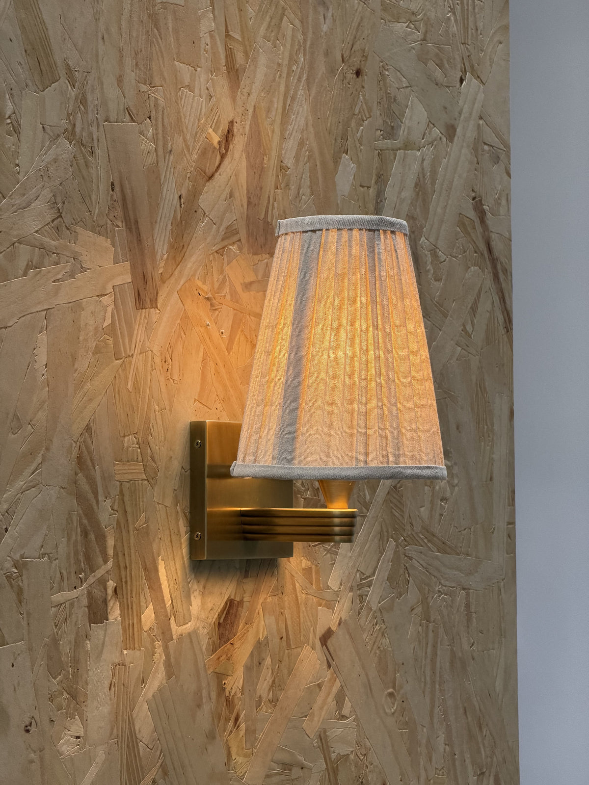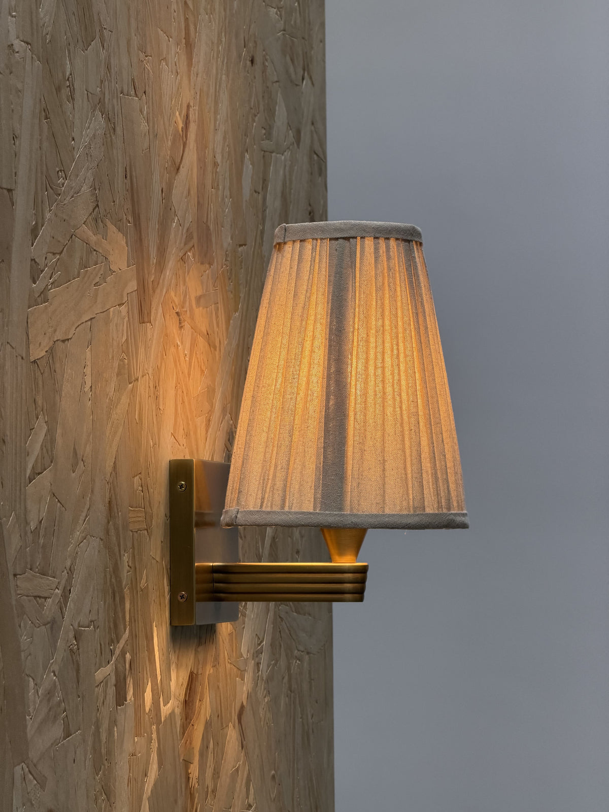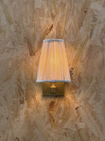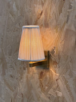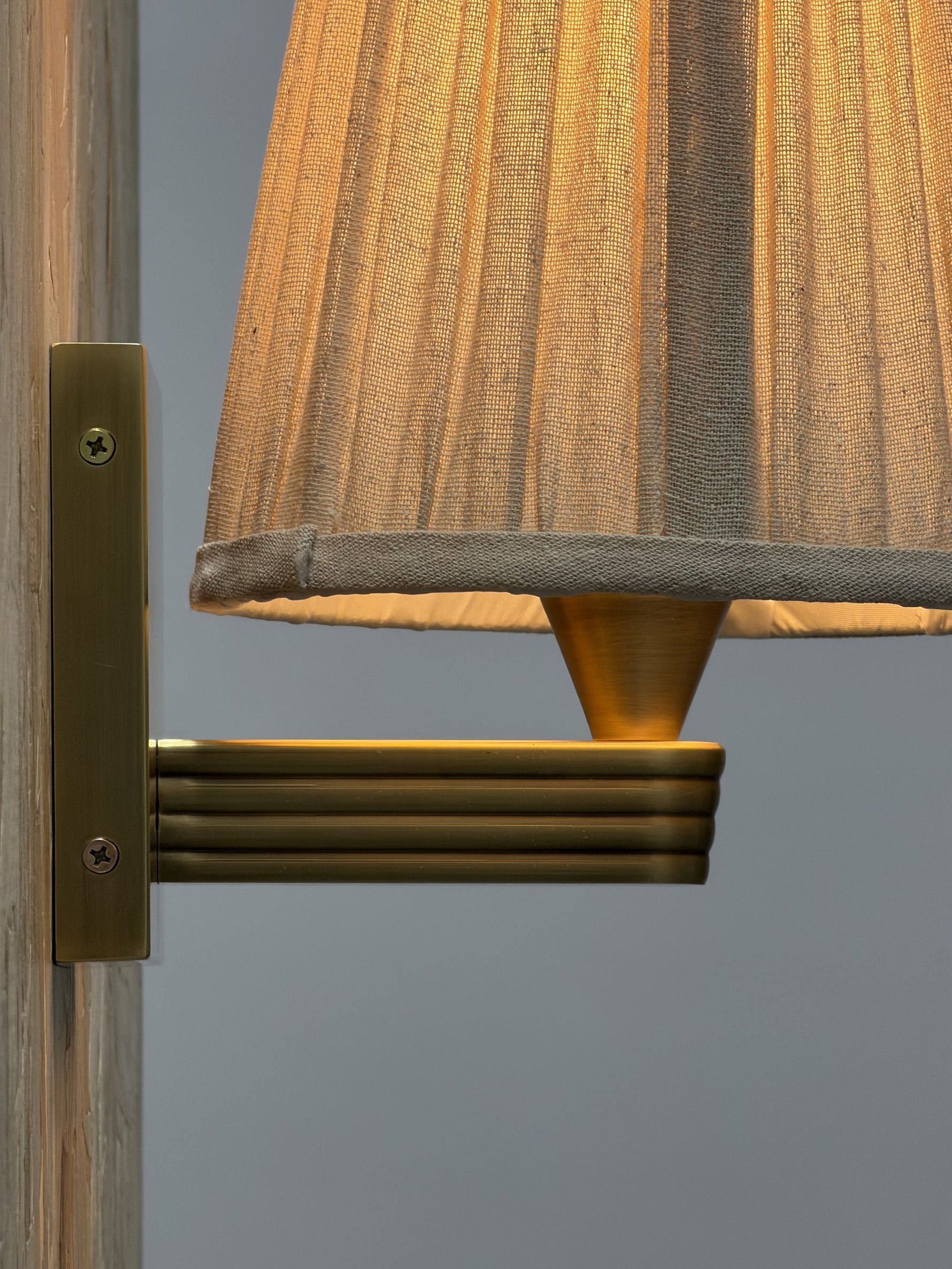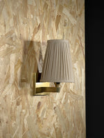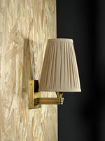 • Our Viola Wall Sconce emits a soft glow for the hallway or living room. Inspired by Rome, a linen shade has been hand-pleated alongside a bespoke molded wall arm in solid brass. Fluted detail adds extra texture and depth to this piece, with the brass finish made to patina over time.