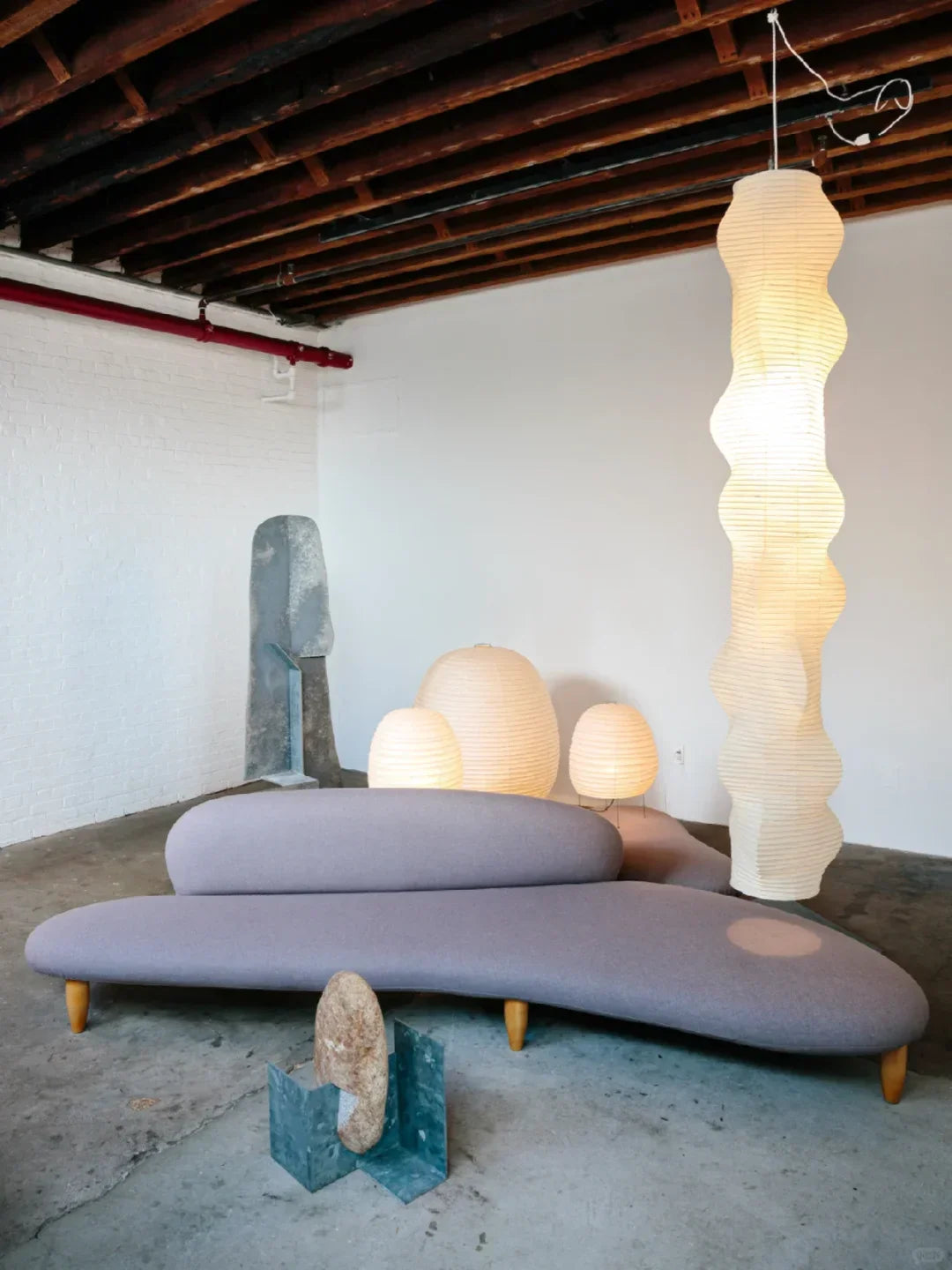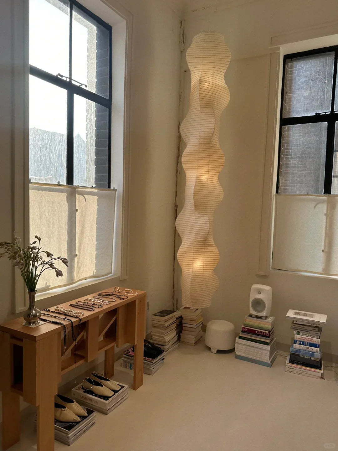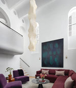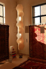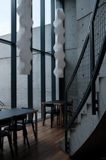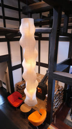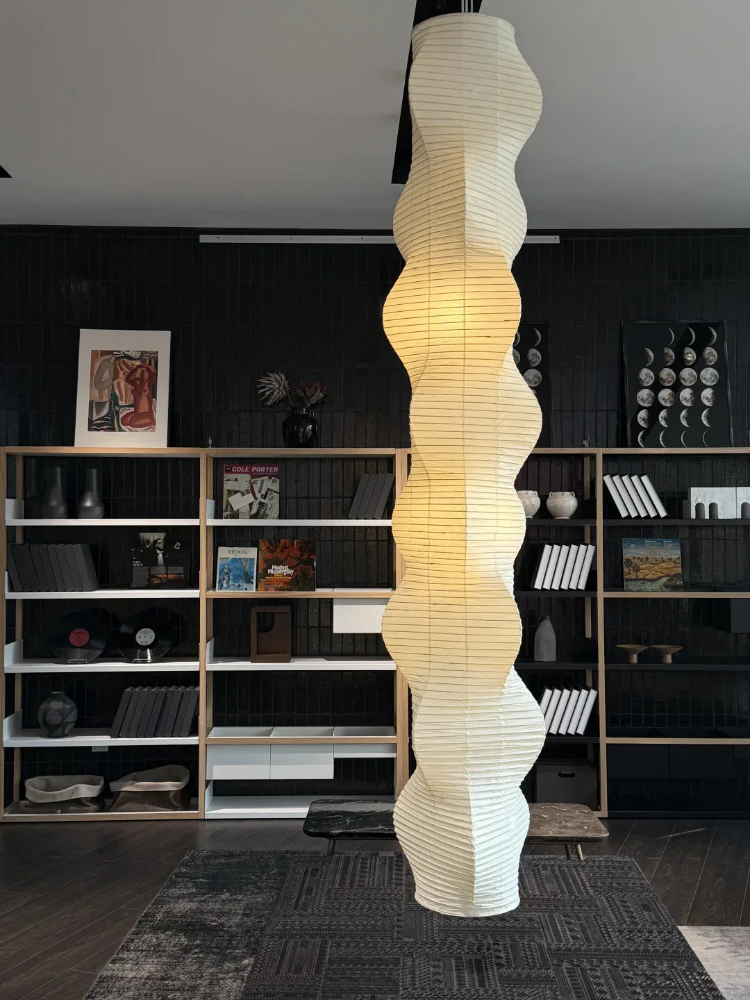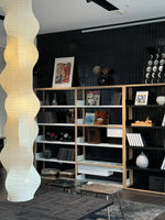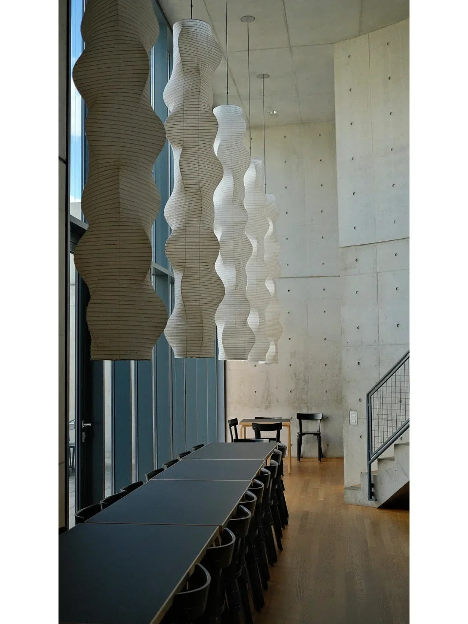 - The Akari B Pendant Lamp rich in layers and lines, creating a sense of depth and artistic elegance. Standing at an impressive 92.5 inches tall, this commanding piece is designed to make a bold statement in high-ceiling environments. Its generous height ensures a strong visual presence, effortlessly filling expansive spaces with warmth and sophistication.