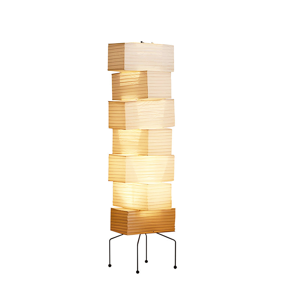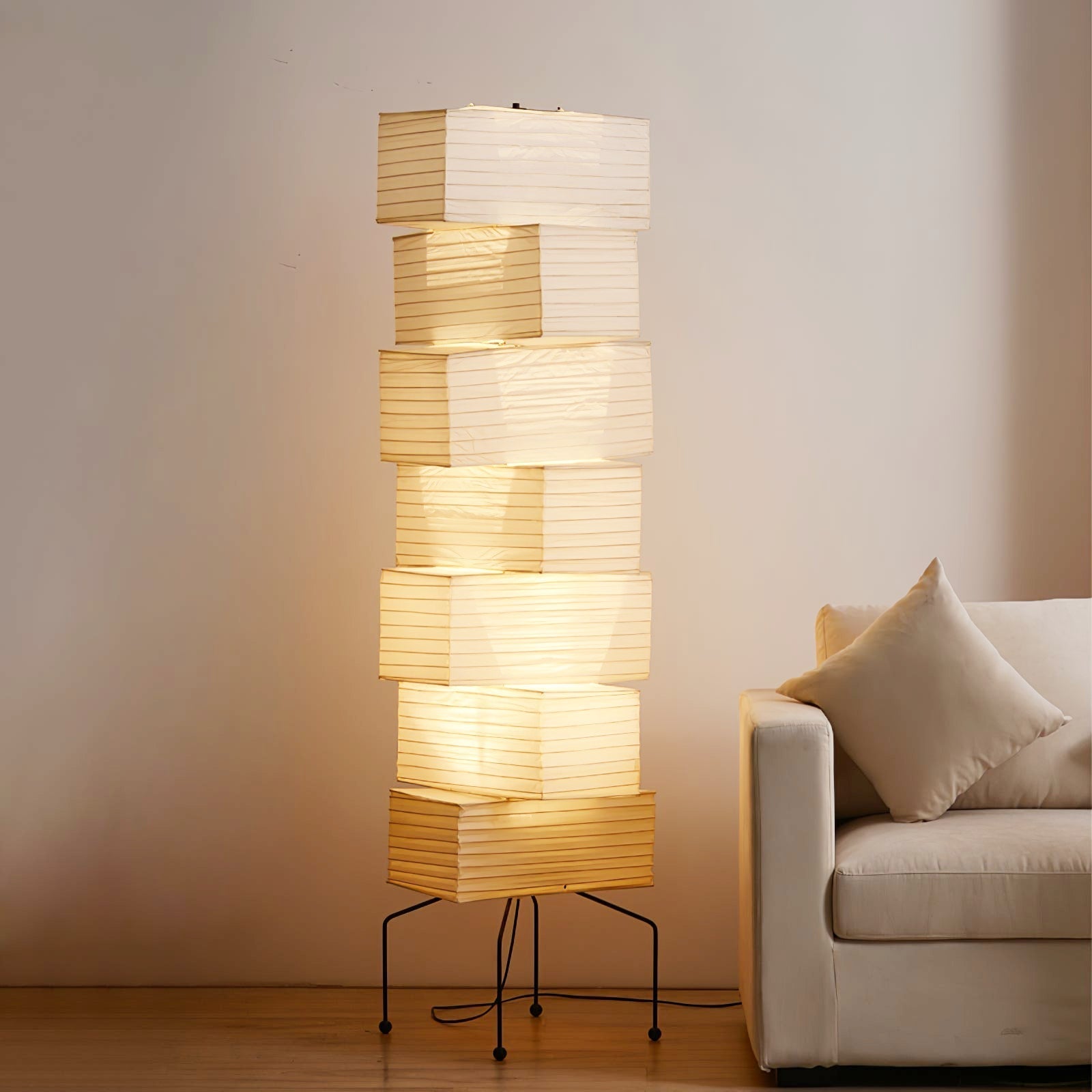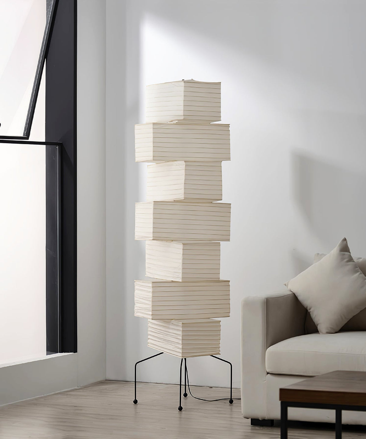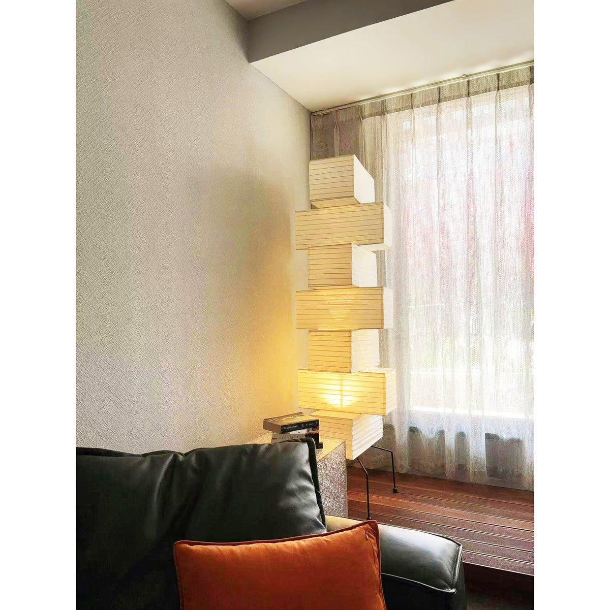 • The Akari UF4-L10 Floor Lamp is a stunning example of modern Japanese design. Crafted with meticulous attention to detail, this lamp features a series of stacked square forms that create a captivating layered look. The interplay of light and shadow through the delicate washi paper creates a warm and inviting ambiance in any space.