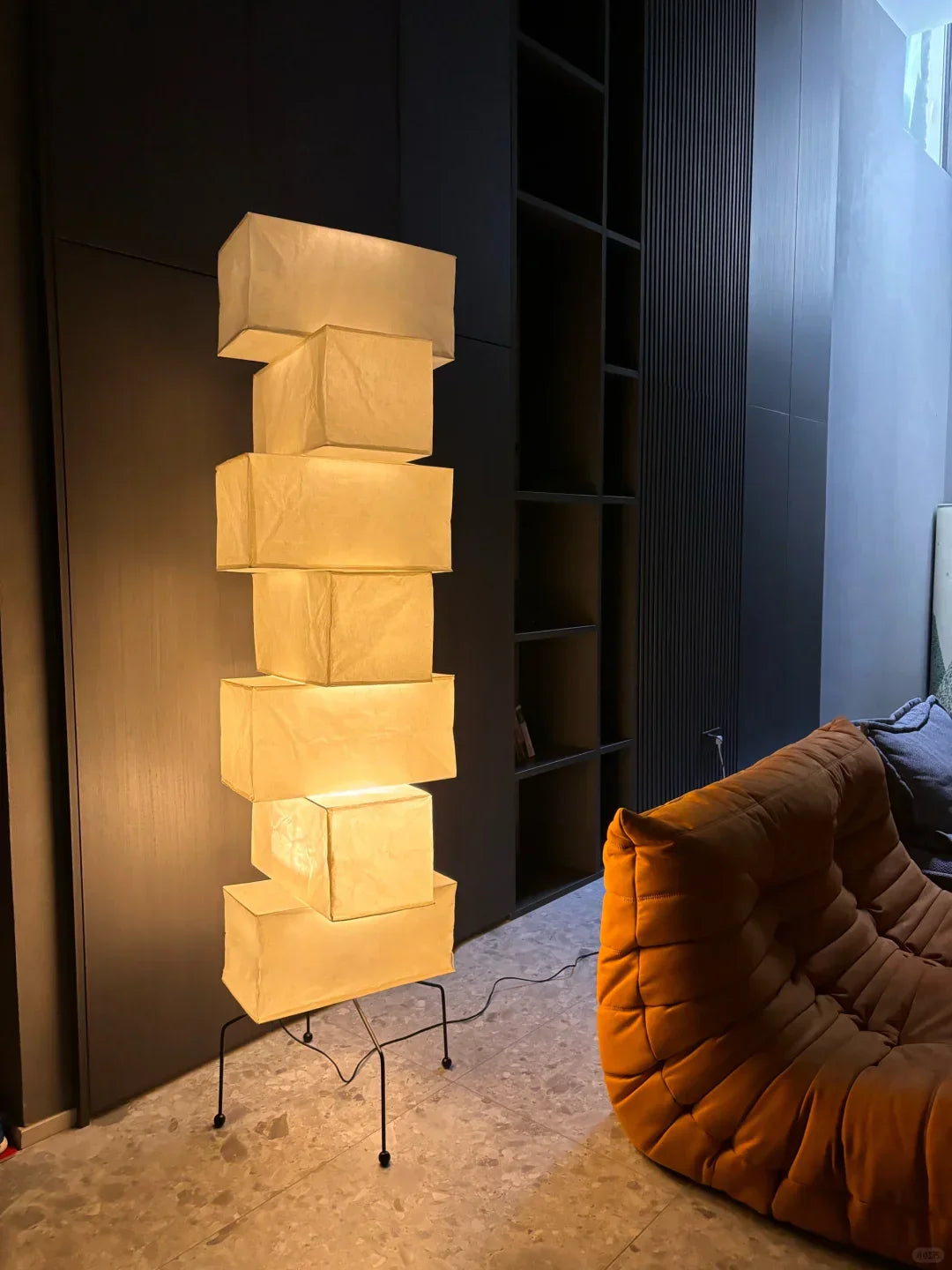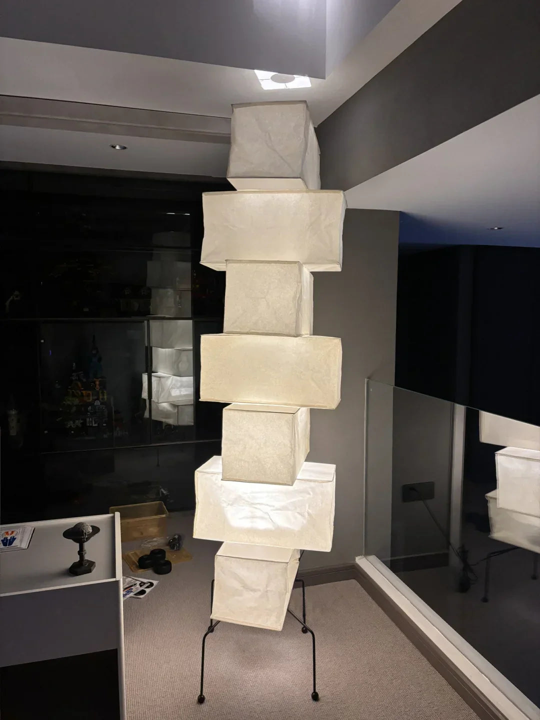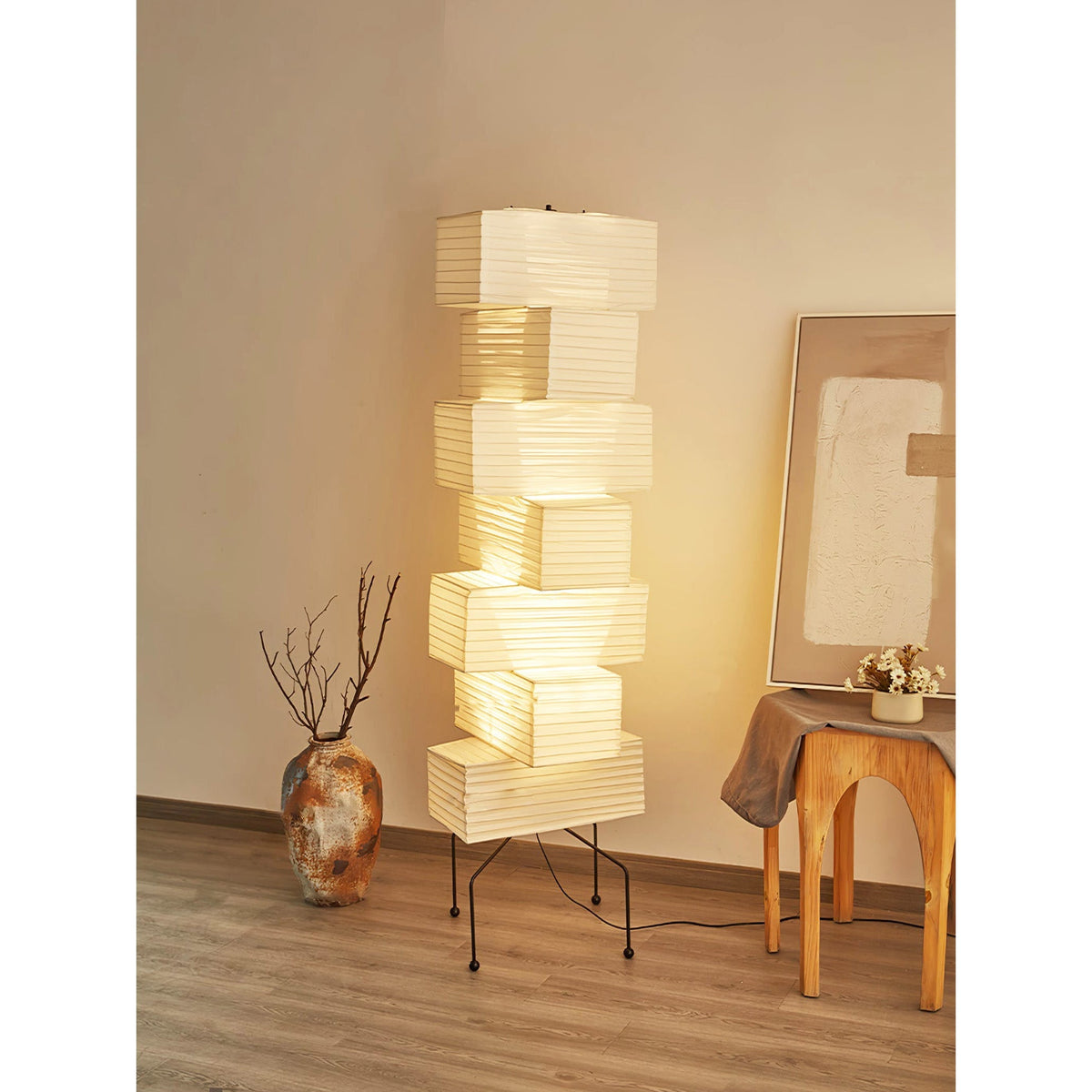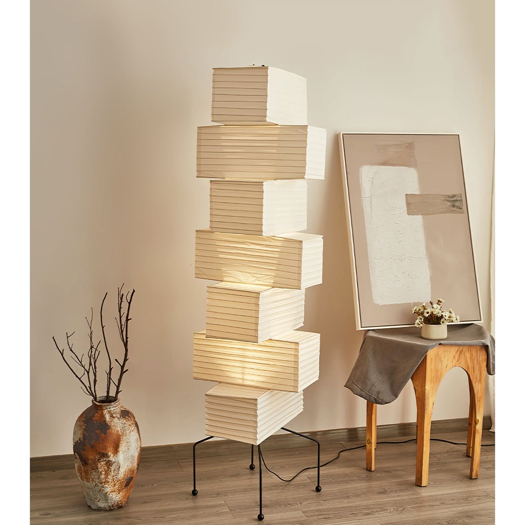 • The Akari UF4-L10 Floor Lamp is a stunning example of modern Japanese design. Crafted with meticulous attention to detail, this lamp features a series of stacked square forms that create a captivating layered look. The interplay of light and shadow through the delicate washi paper creates a warm and inviting ambiance in any space.