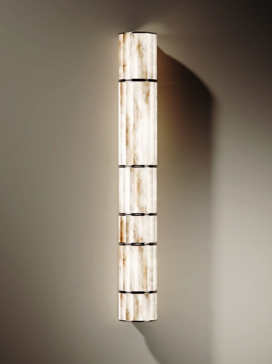 - Akiko’s true magic lies in its captivating play of light. Each sconce is expertly carved from a single block of natural alabaster, a stone revered for its unique veining and translucent properties. When illuminated, the light glows softly through the stone, creating a warm, ambient radiance and a mesmerizing dance of chiaroscuro—contrasts between light and dark. The result is a dramatic yet deeply soothing atmosphere that feels both opulent and inviting.