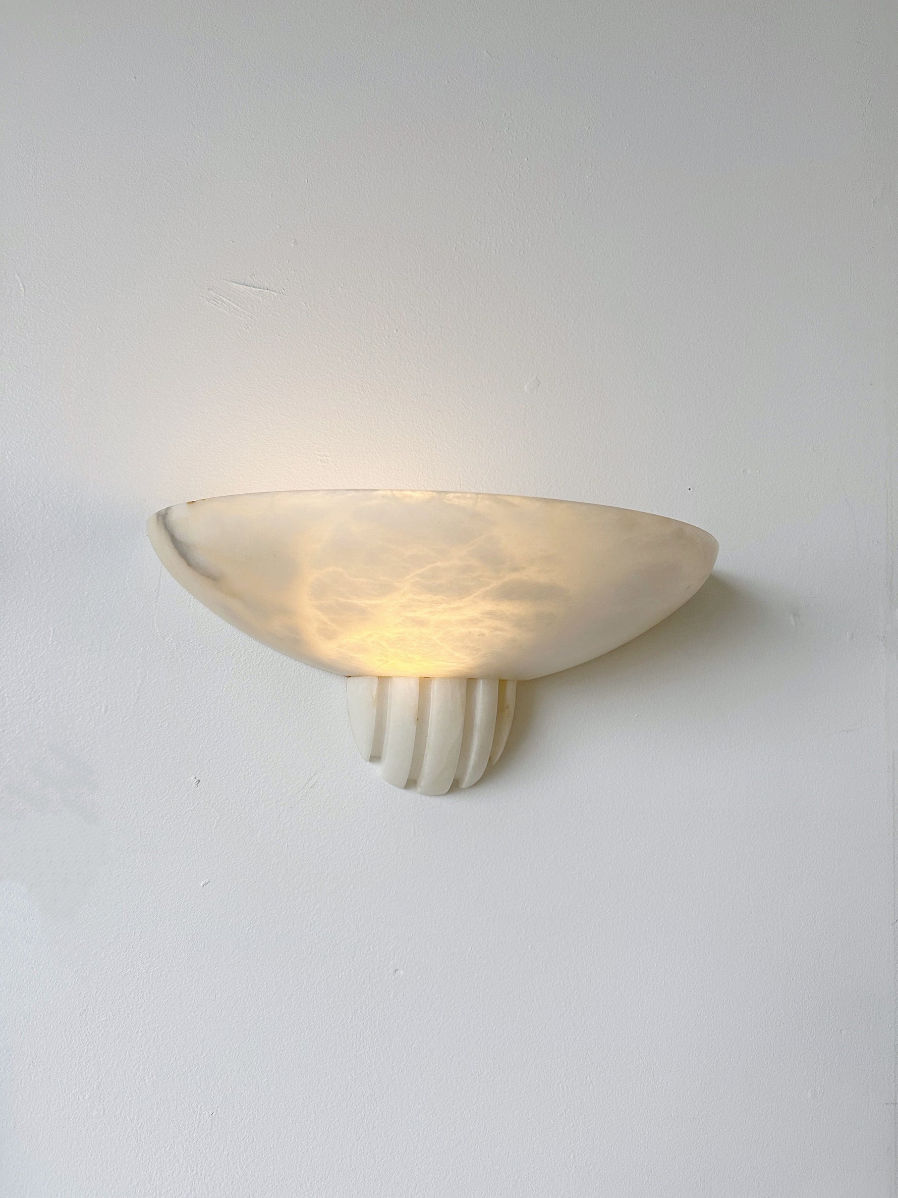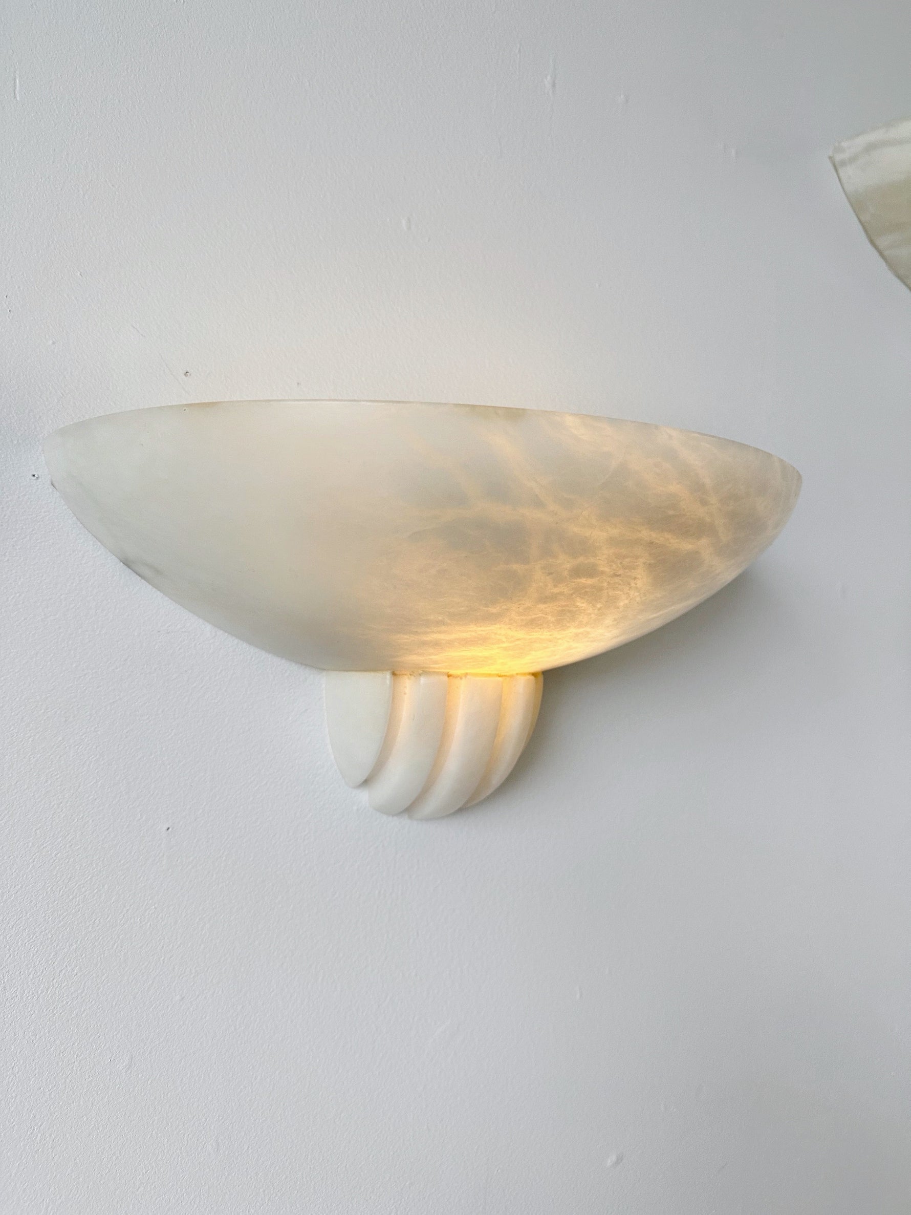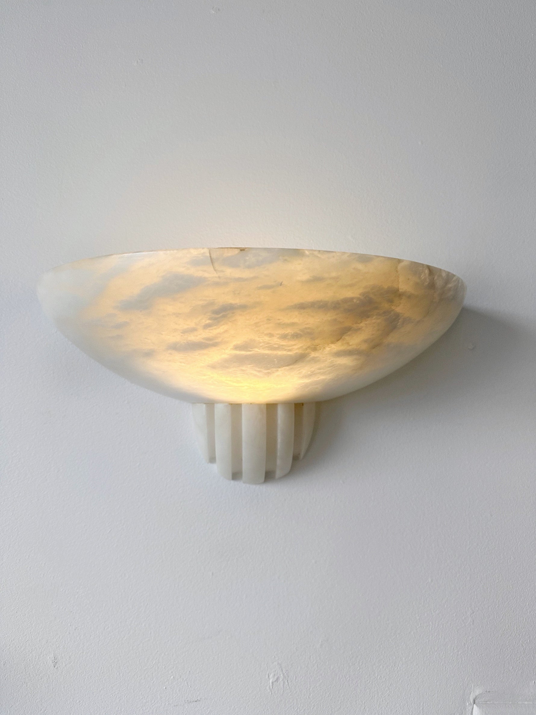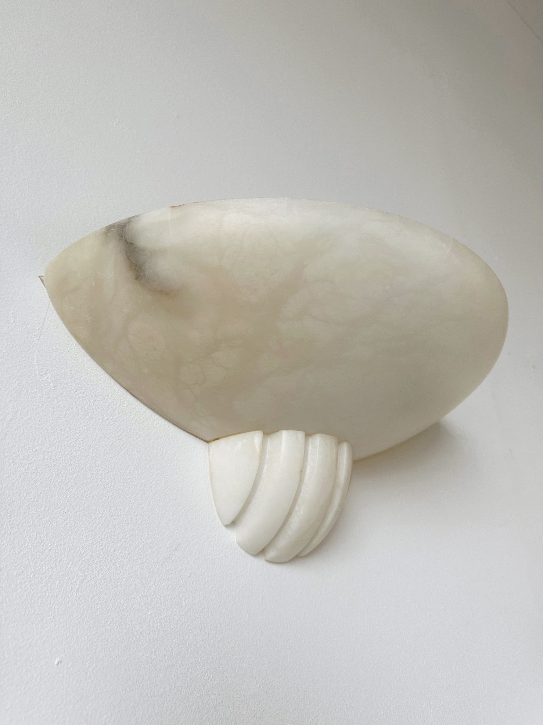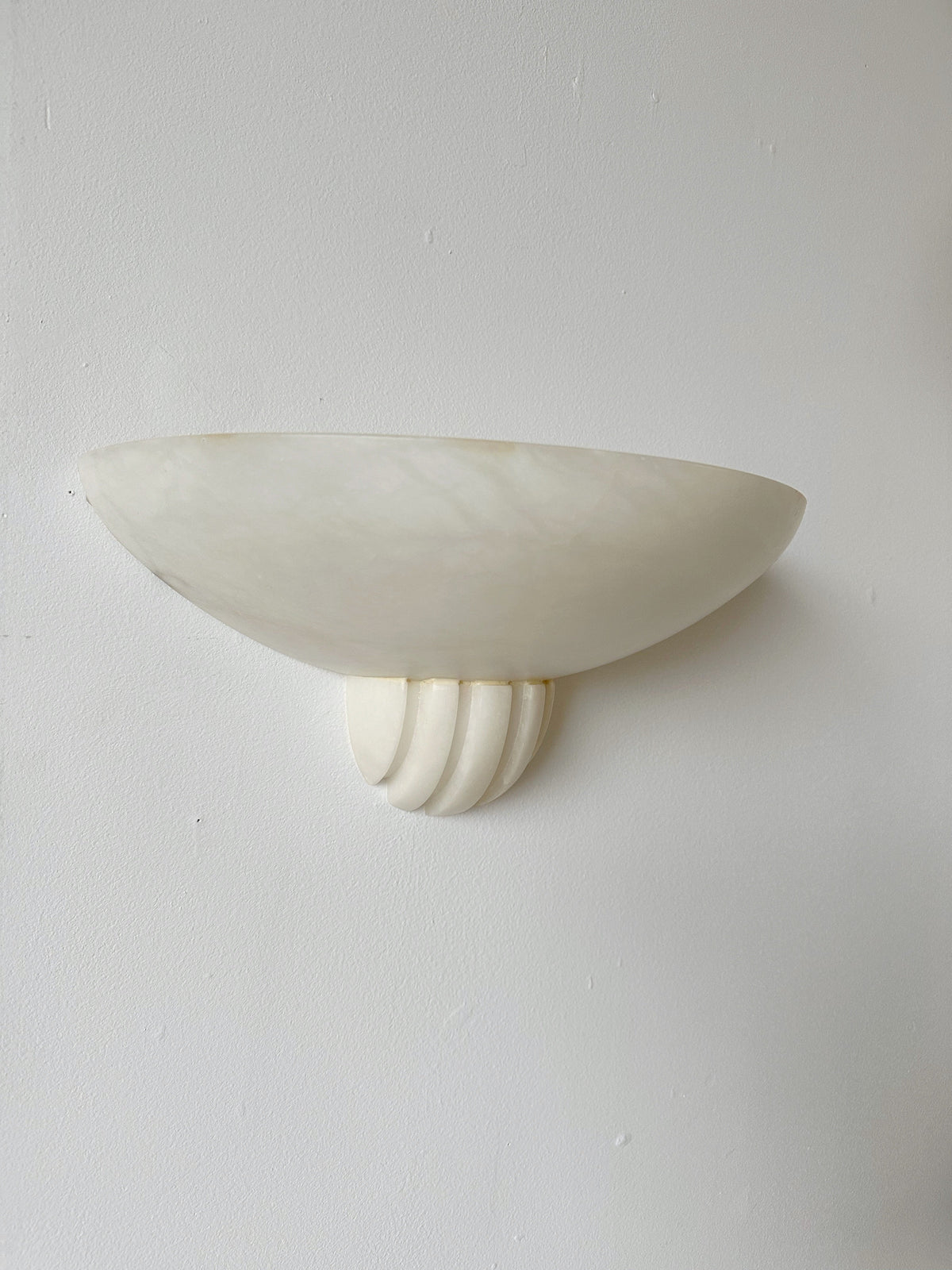 • Embrace the glamour and sophistication of the Roaring Twenties with this stunning, original ArtD Alabaster Wall Sconce. Crafted from genuine, luminous alabaster, this piece is a true testament to the era's unparalleled craftsmanship and geometric design.