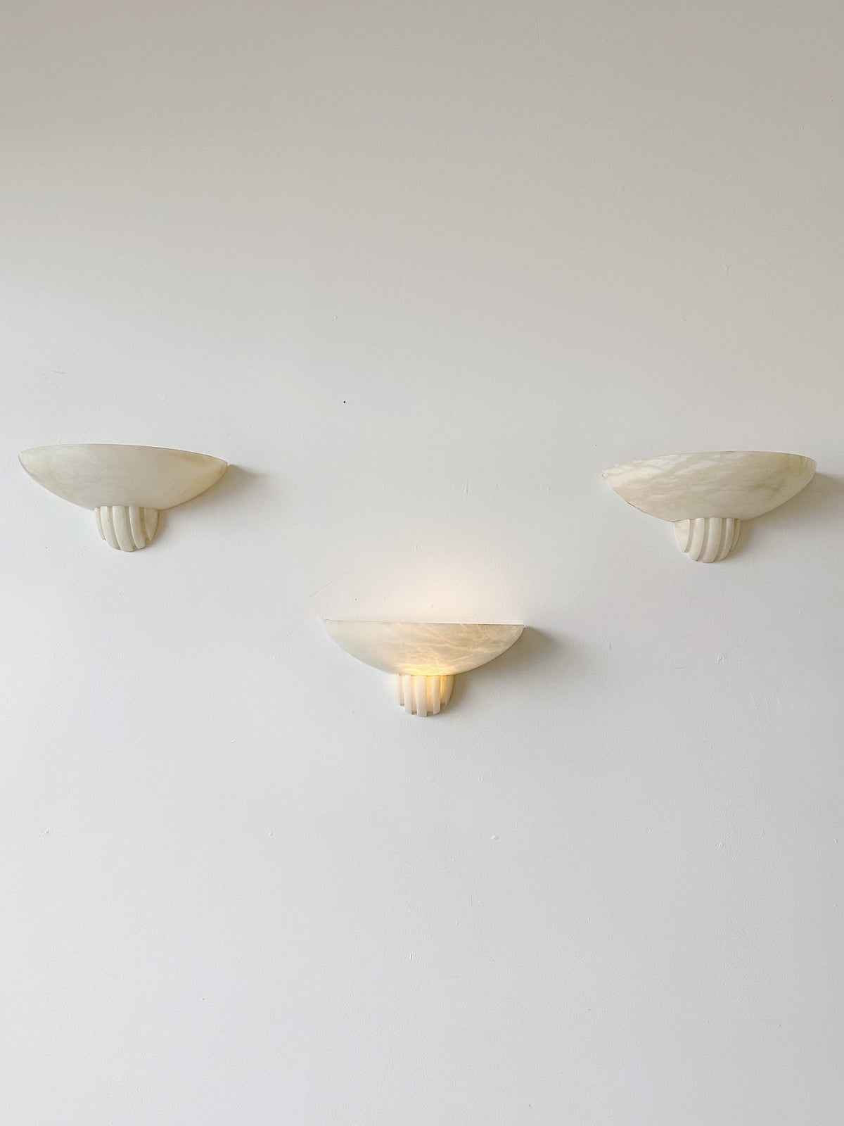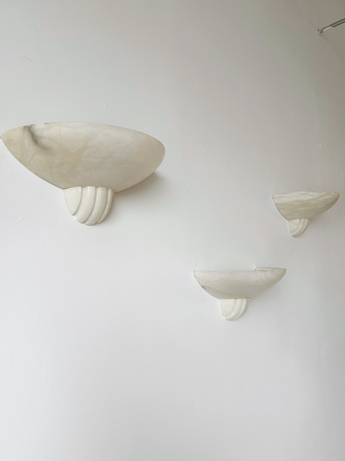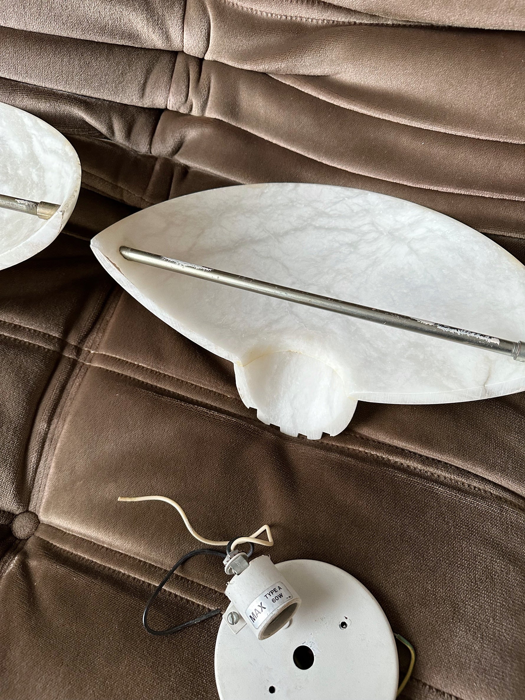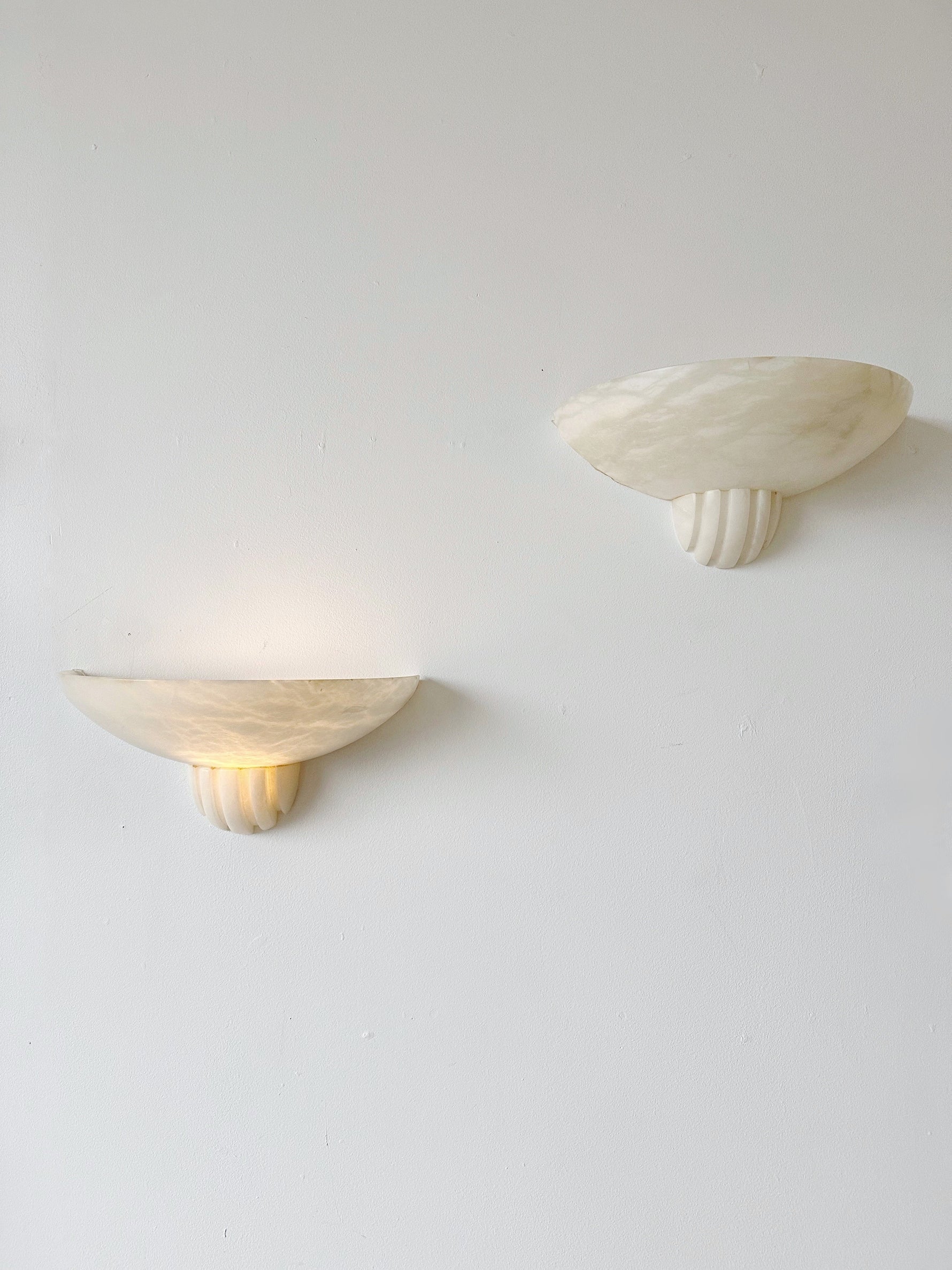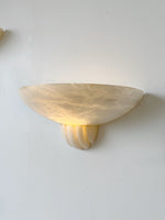 • Embrace the glamour and sophistication of the Roaring Twenties with this stunning, original ArtD Alabaster Wall Sconce. Crafted from genuine, luminous alabaster, this piece is a true testament to the era's unparalleled craftsmanship and geometric design.