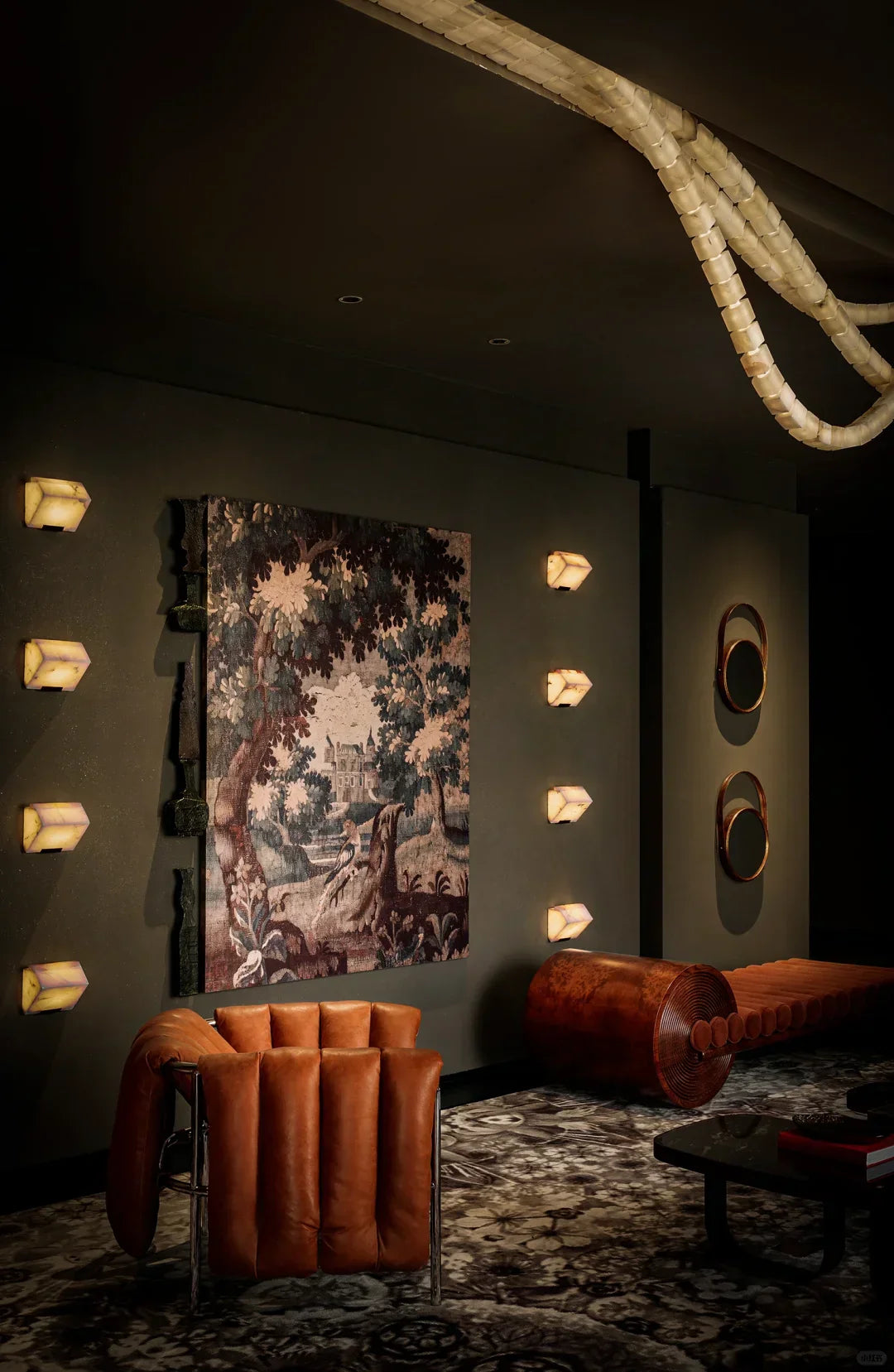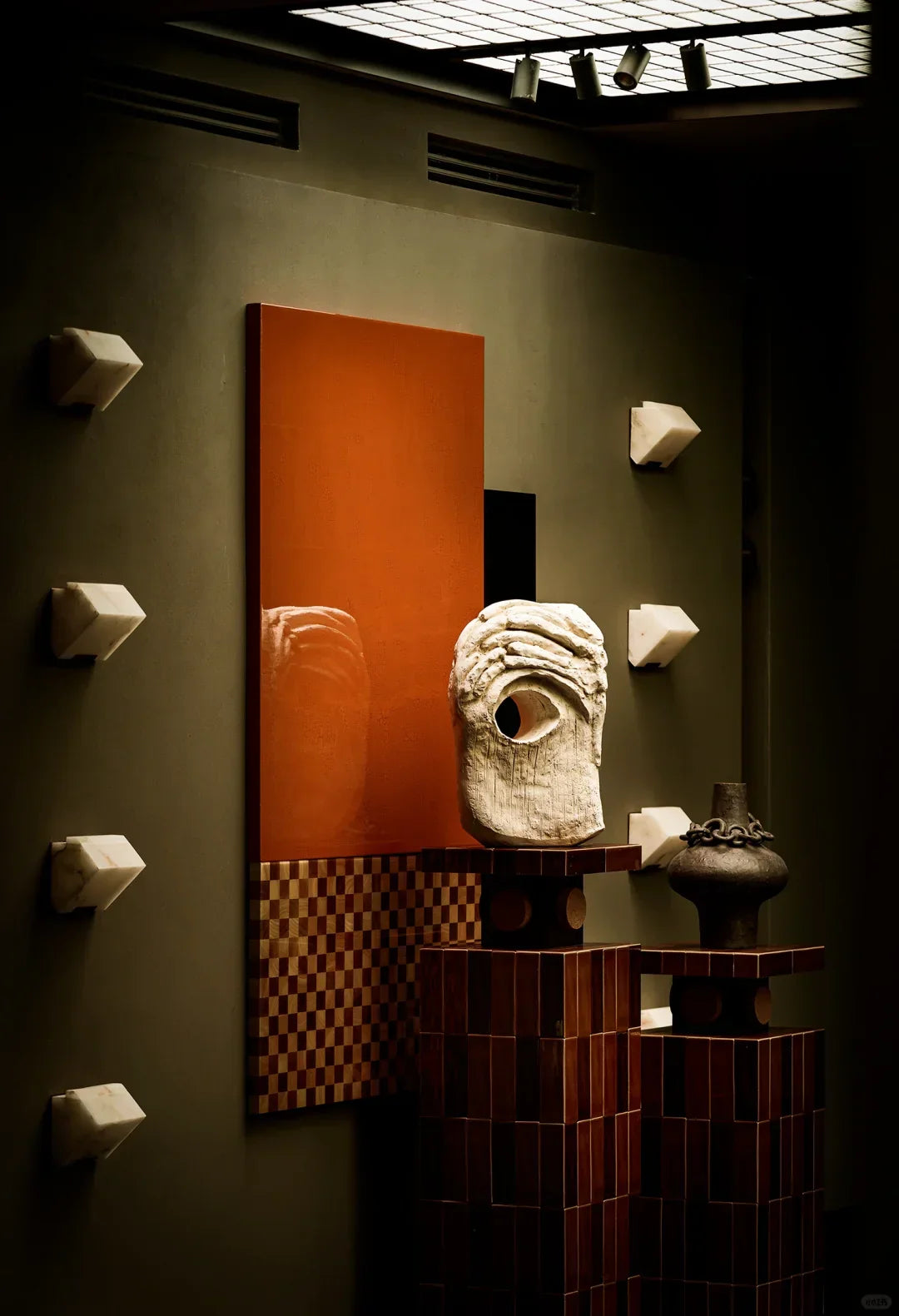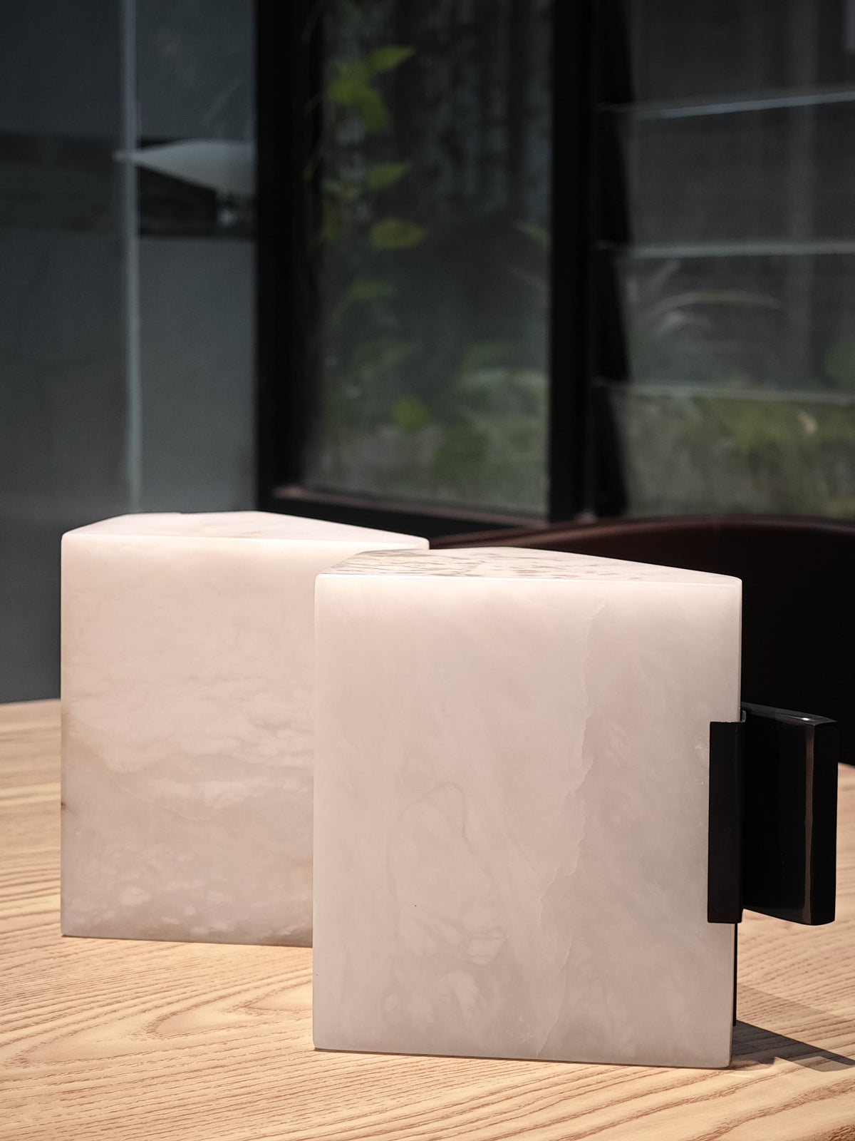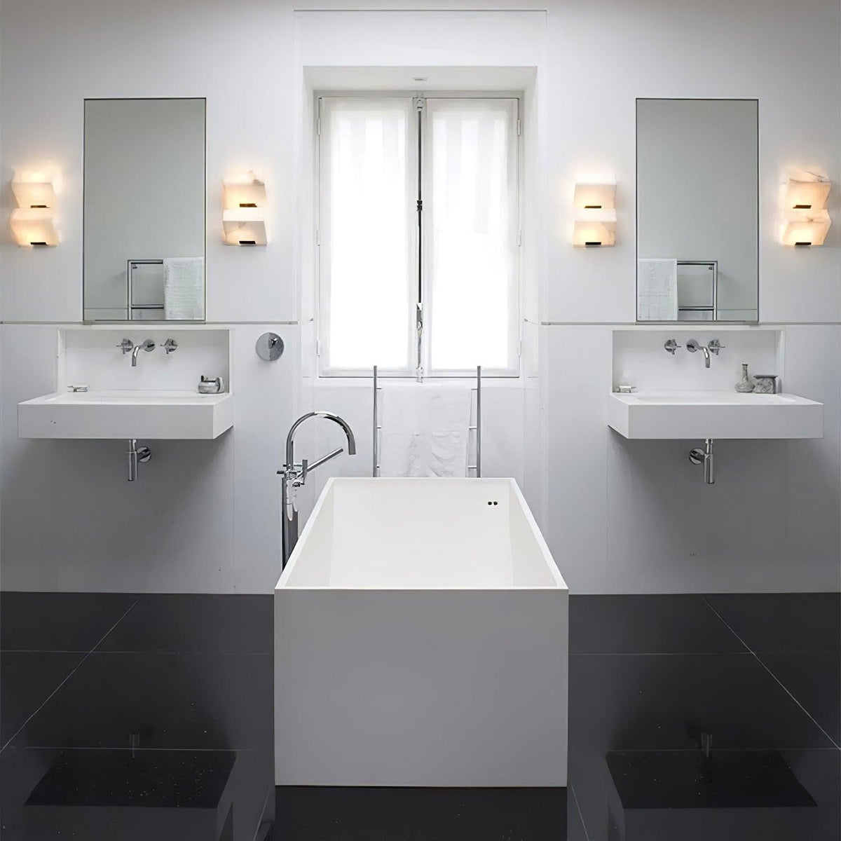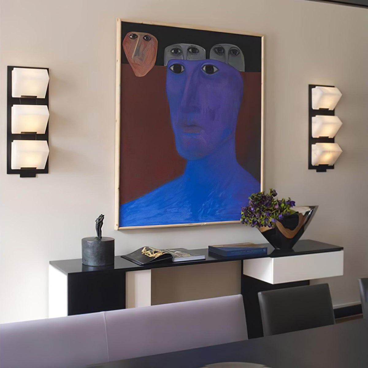 - Crafted in 1923, the Block Wall Sconce is a masterpiece that embodies the harmonious balance between rigorous geometry and understated elegance. Designed to highlight the natural beauty of alabaster, this sconce showcases a simple yet striking volume that accentuates the stone's soft, luminous quality. The minimalist vision of Pierre Chareau is brought to life through the bold contrast of black metal and white alabaster, creating a timeless interplay of light and shadow.