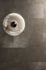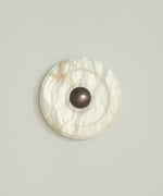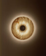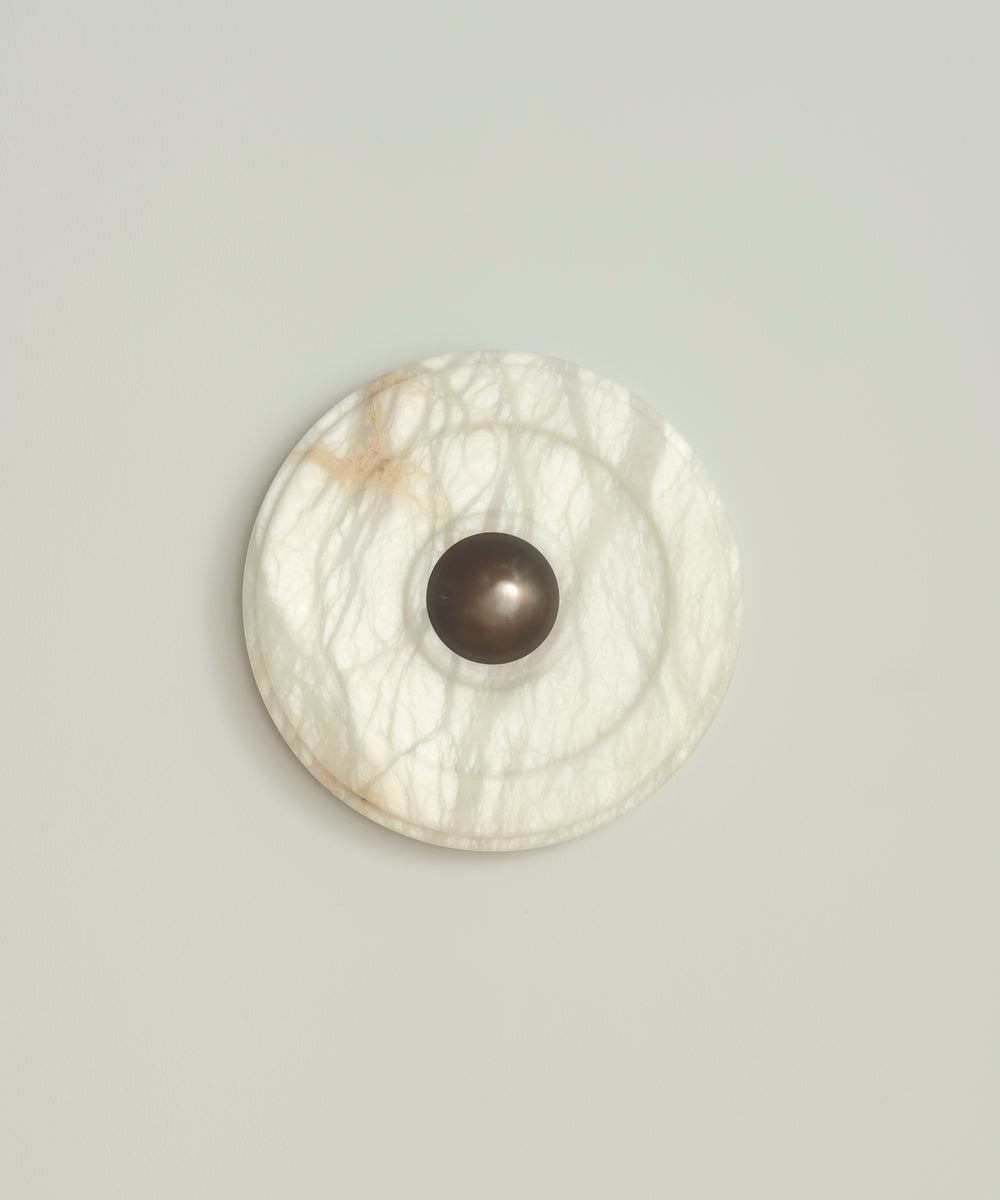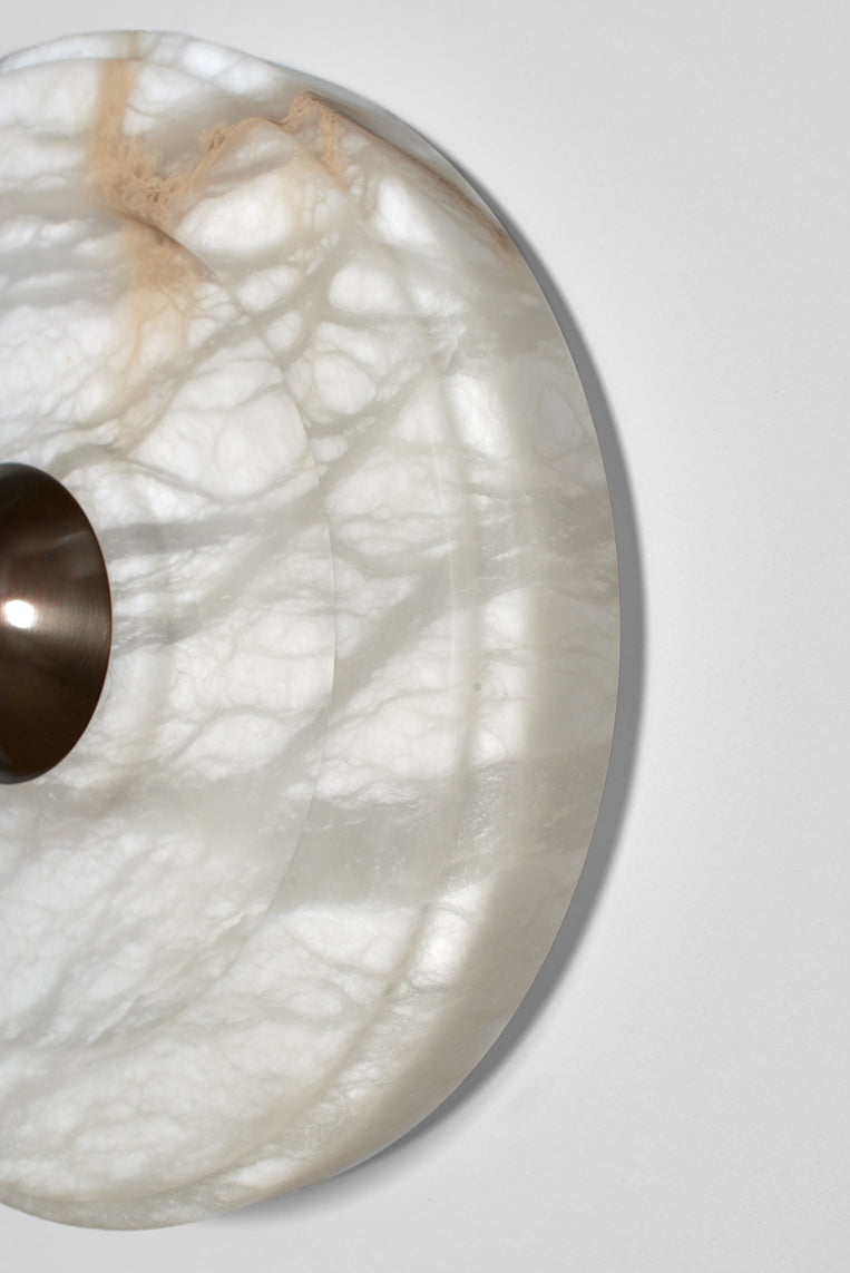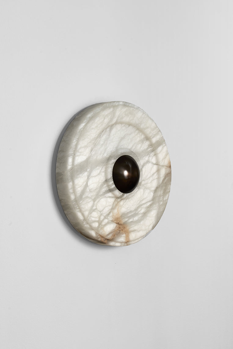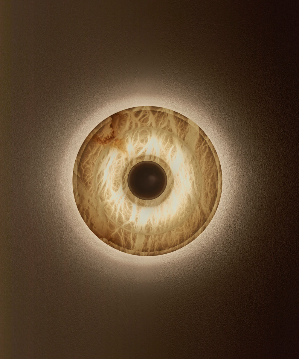 - Introducing the Circle Wall Sconce, a masterpiece of minimalist lighting born from our collaboration with the renowned Milanese interior design studio, LC Atelier. Crafted from luminous alabaster, the circular form softens the stone's inherent solidity, creating a piece that is both substantial and softly ethereal. Concentric grooves highlight the natural, unique veins of the stone, while a central burnished brass stud adds a touch of refined warmth. This sconce doesn't just illuminate a space; it transforms it into a gallery of light and shadow.