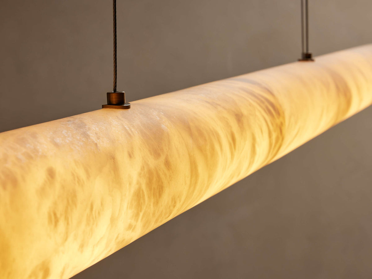 - Introduce an atmosphere of serene sophistication with the Halima Linear Pendant Lamp. Meticulously hand-crafted from a single block of ethereal Spanish alabaster, this stunning linear piece is more than a light fixture—it's a functional work of art for your home.