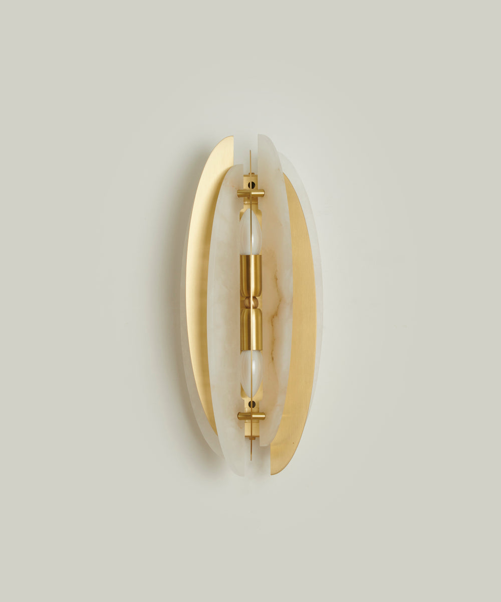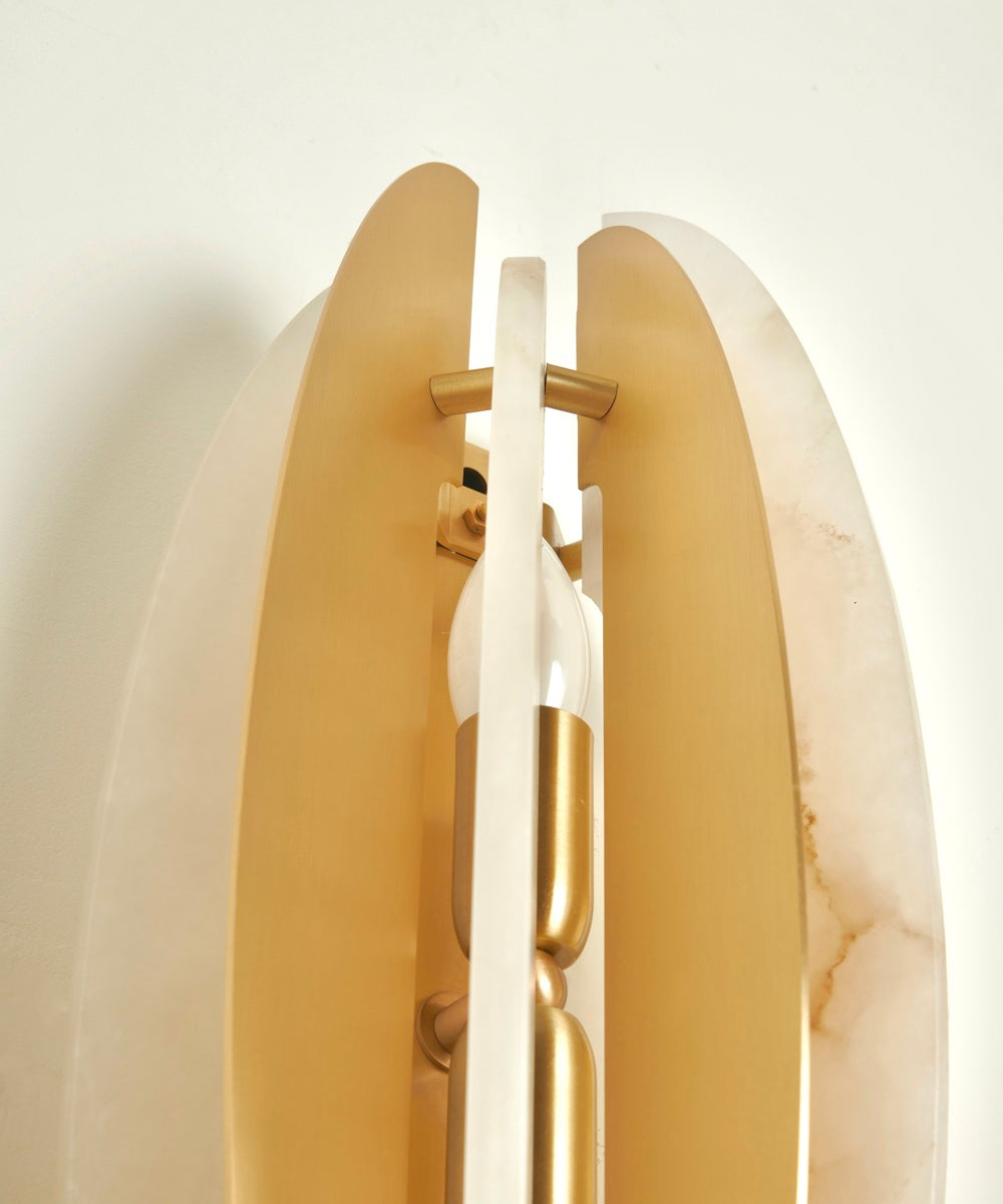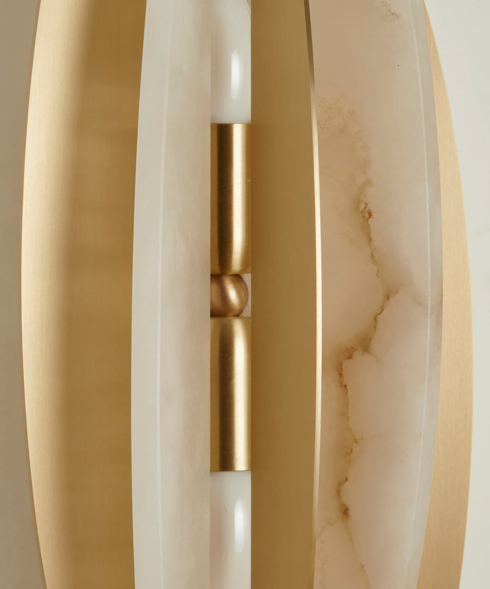 - Each element is meticulously balanced, with the warm metal and luminous stone alternating in perfect harmony. When illuminated, light gently filters through the unique, natural veining of the alabaster, casting a soft, warm, and sophisticated glow that transforms any room into an inviting sanctuary. The satin brass finish adds a touch of modern luxury, gently reflecting its surroundings to enhance the overall sense of depth and elegance.