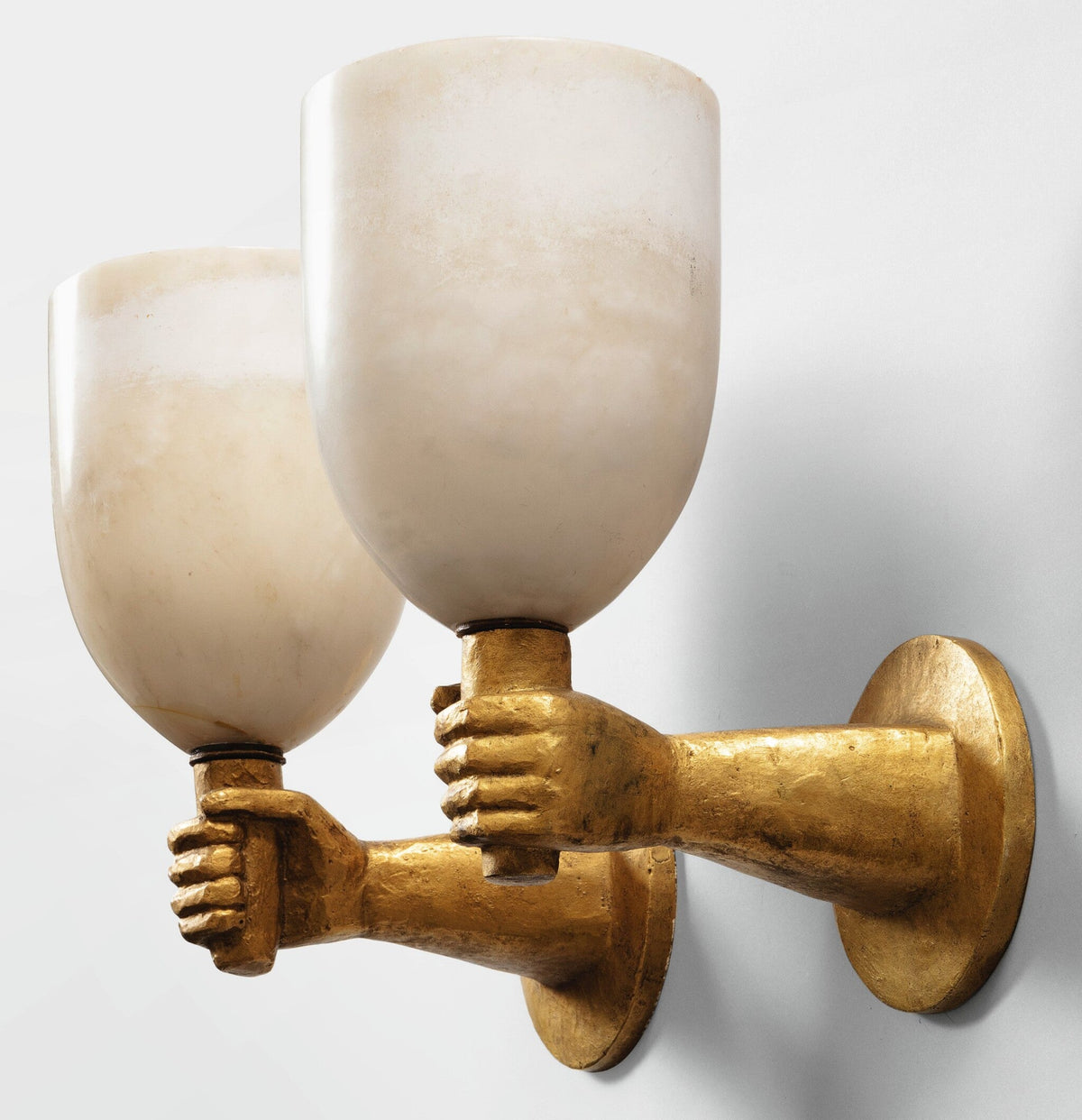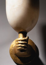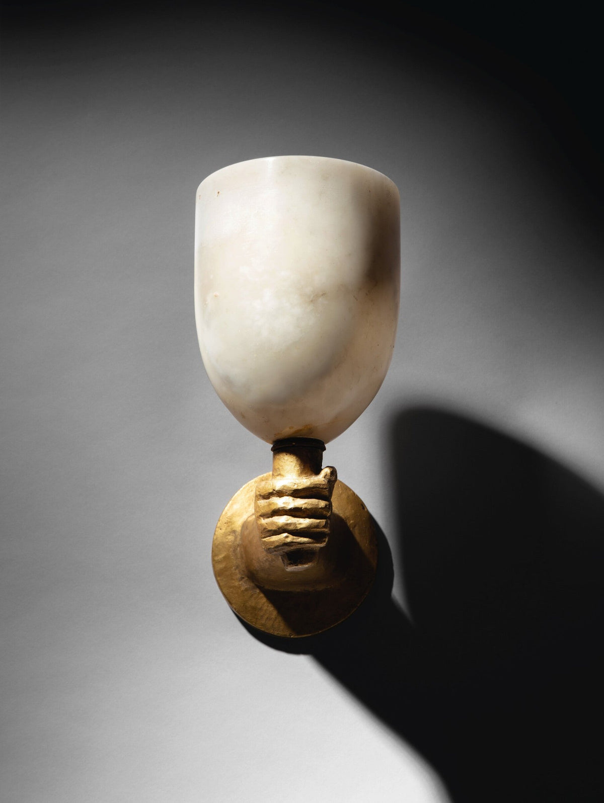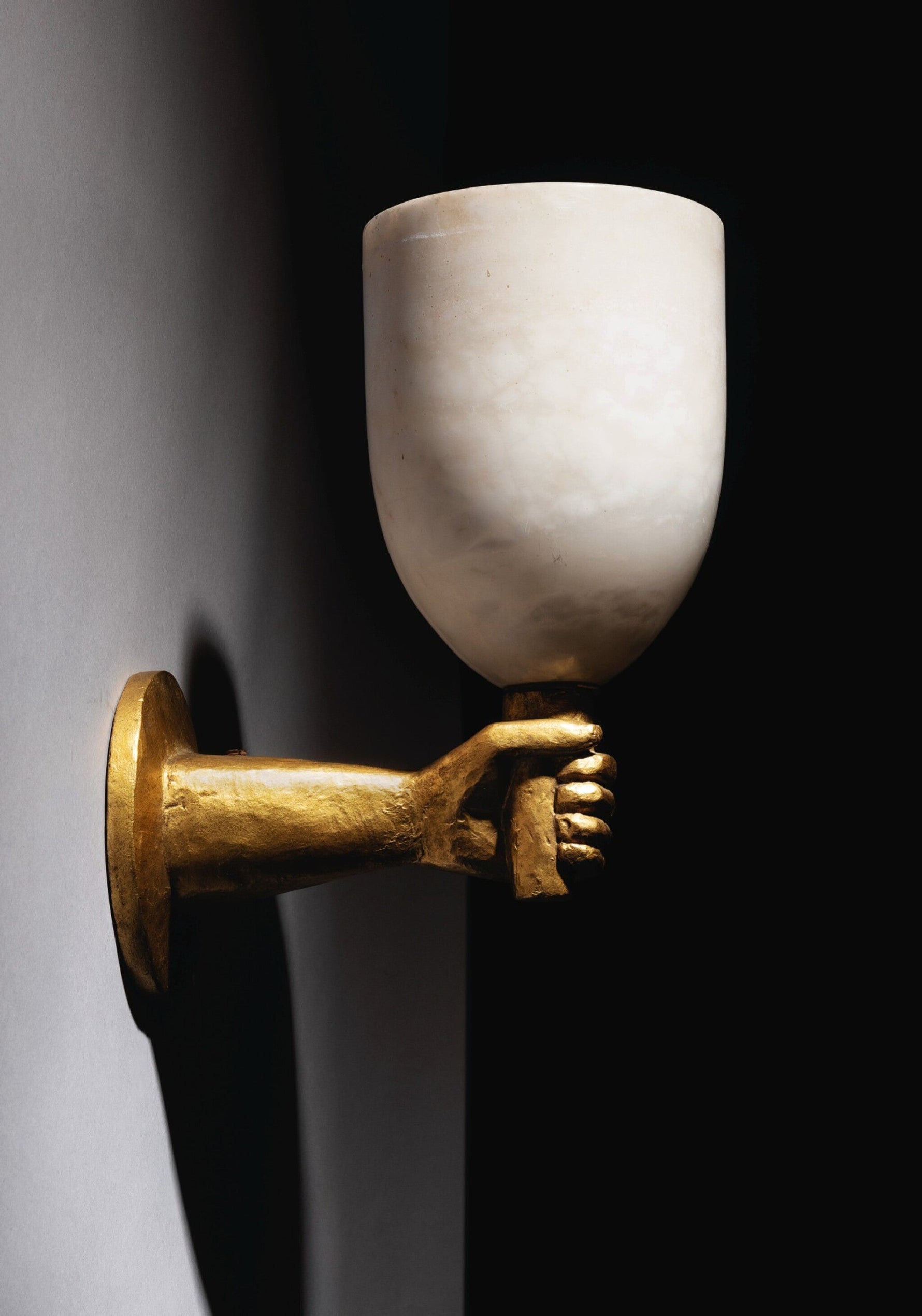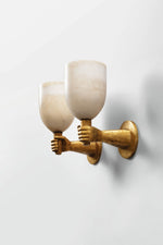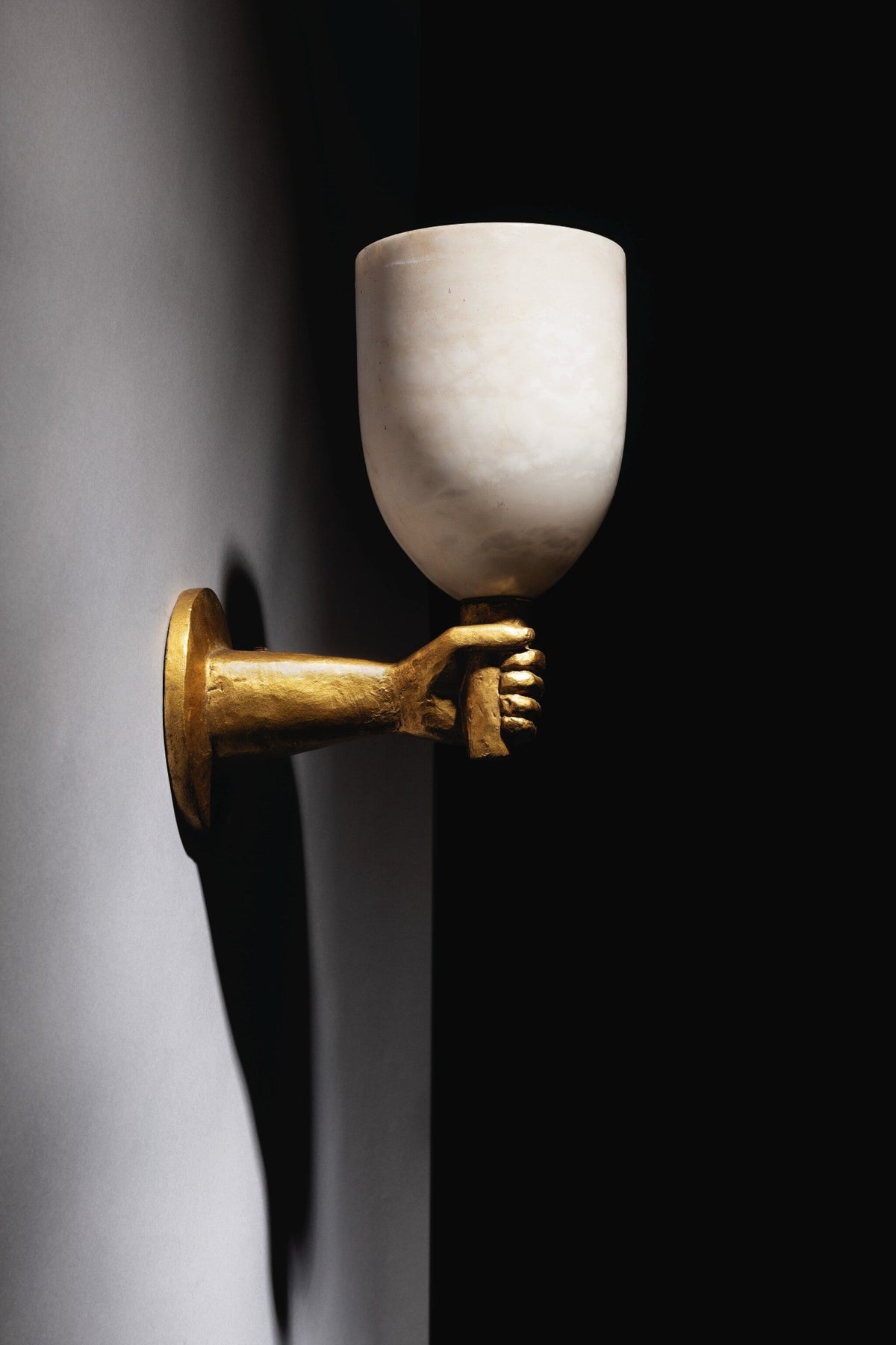 - Make a powerful statement with the Le Poing Sconce, where art and illumination converge. This exquisite wall lamp features a meticulously sculpted brass hand, capturing raw strength and elegant detail in a single form. The hand cradles a soft, glowing alabaster shade, which diffuses light into a warm and tranquil radiance.
