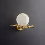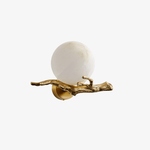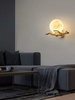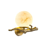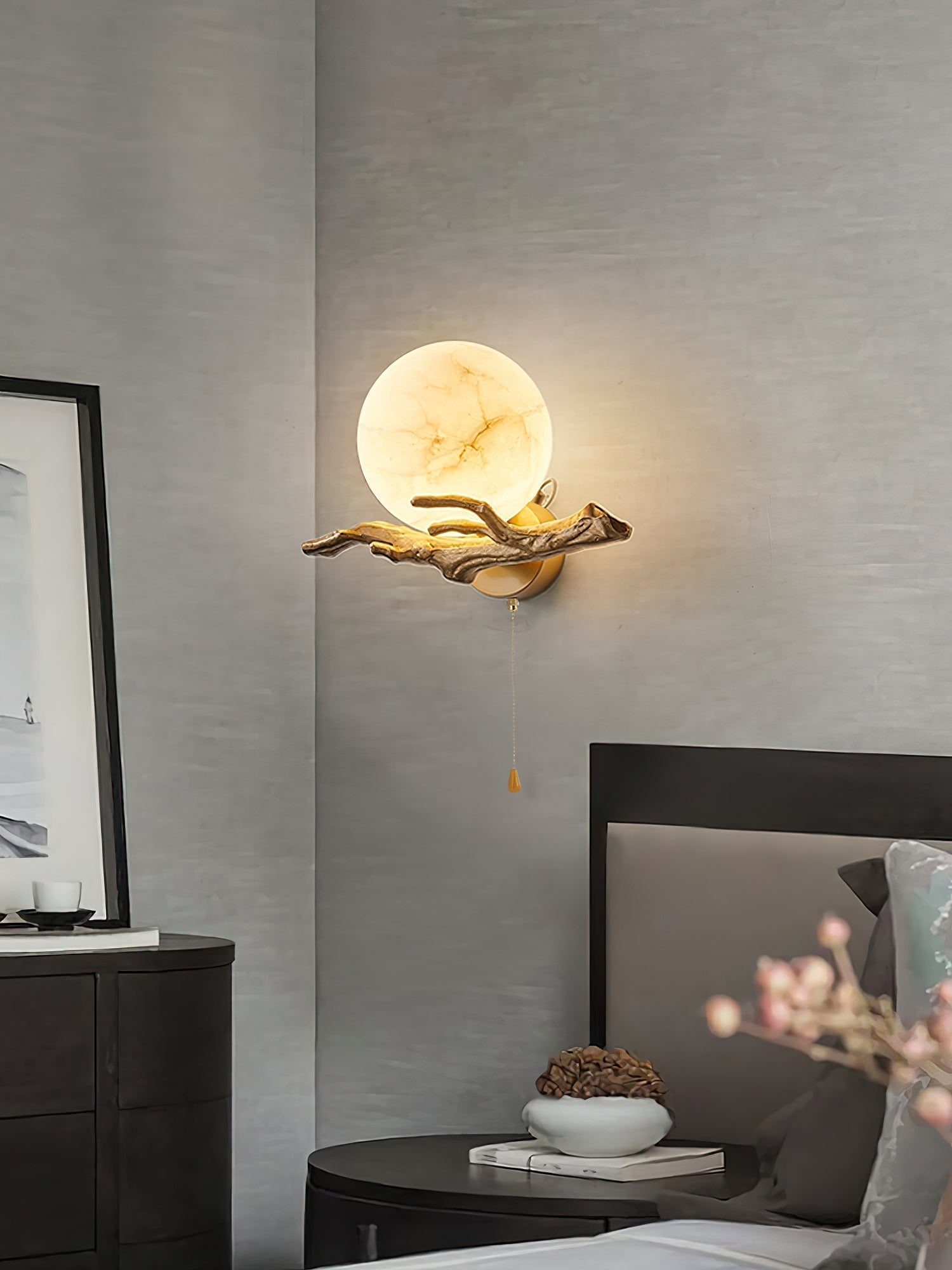 - Illuminate your space with the ethereal beauty of the Lunar Alabaster Wall Sconce. This captivating piece features a chaotic pattern of alabaster, reminiscent of the moon's surface. The intricate tree branch moldings, crafted from shimmering brass, add a touch of fancy. When lit in a dimly lit room, the sconce casts a soft, moonlit glow, creating a serene and enchanting ambiance.
