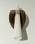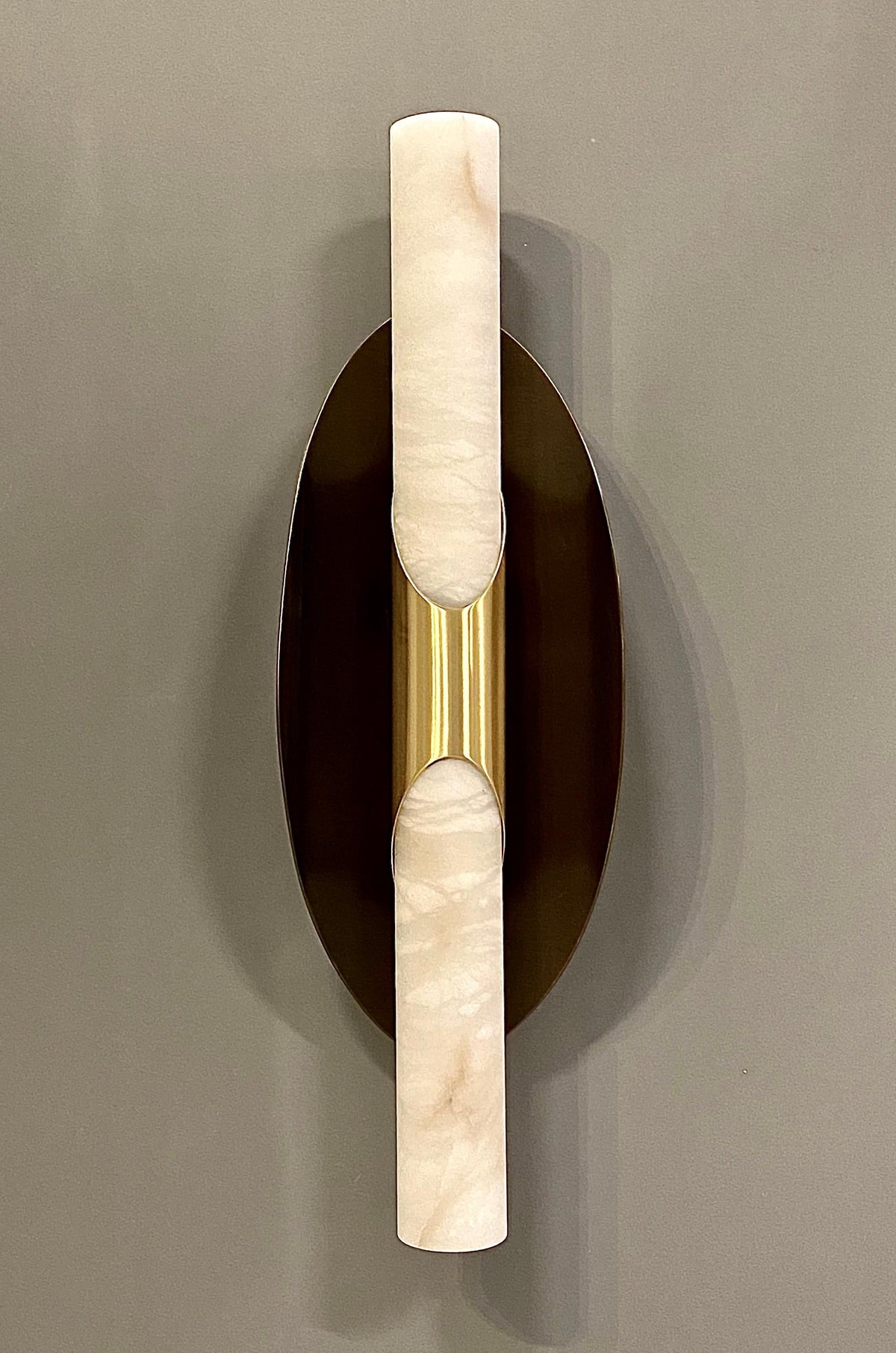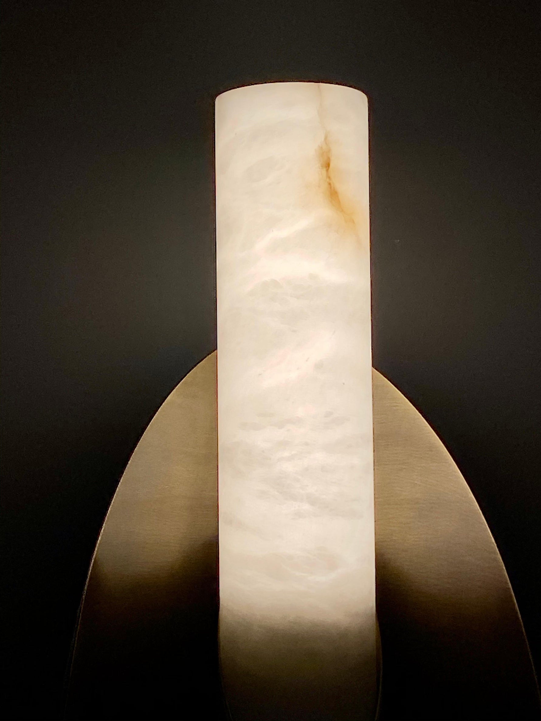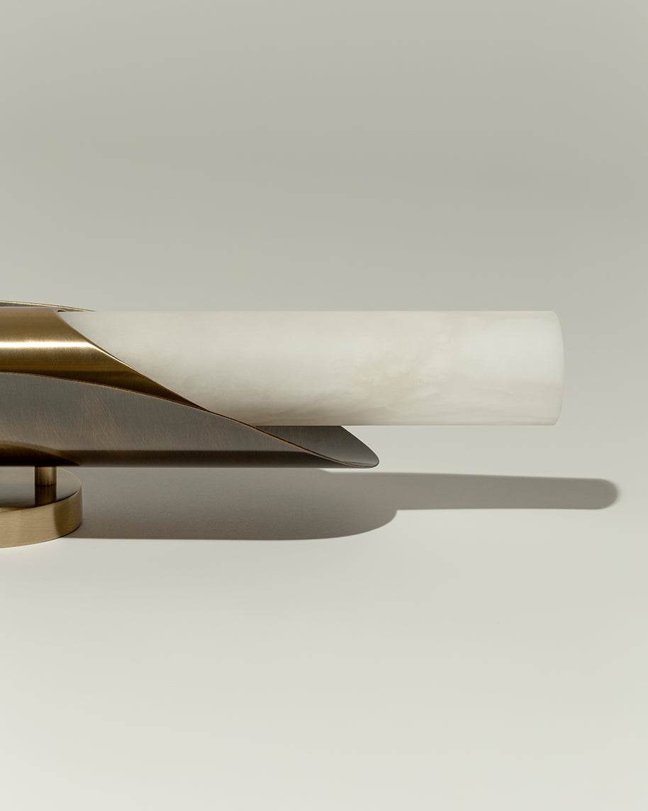 - The Manta Alabaster Wall Sconce captivates with its bold, dynamic design. At its heart lies a gracefully tubular element, expertly carved from natural Alabaster. This luminous stone is paired with a screen in a contrasting finish, creating a stunning visual tension that is both striking and sophisticated. The solid, geometric form of the screen beautifully offsets the soft, organic glow of the alabaster.