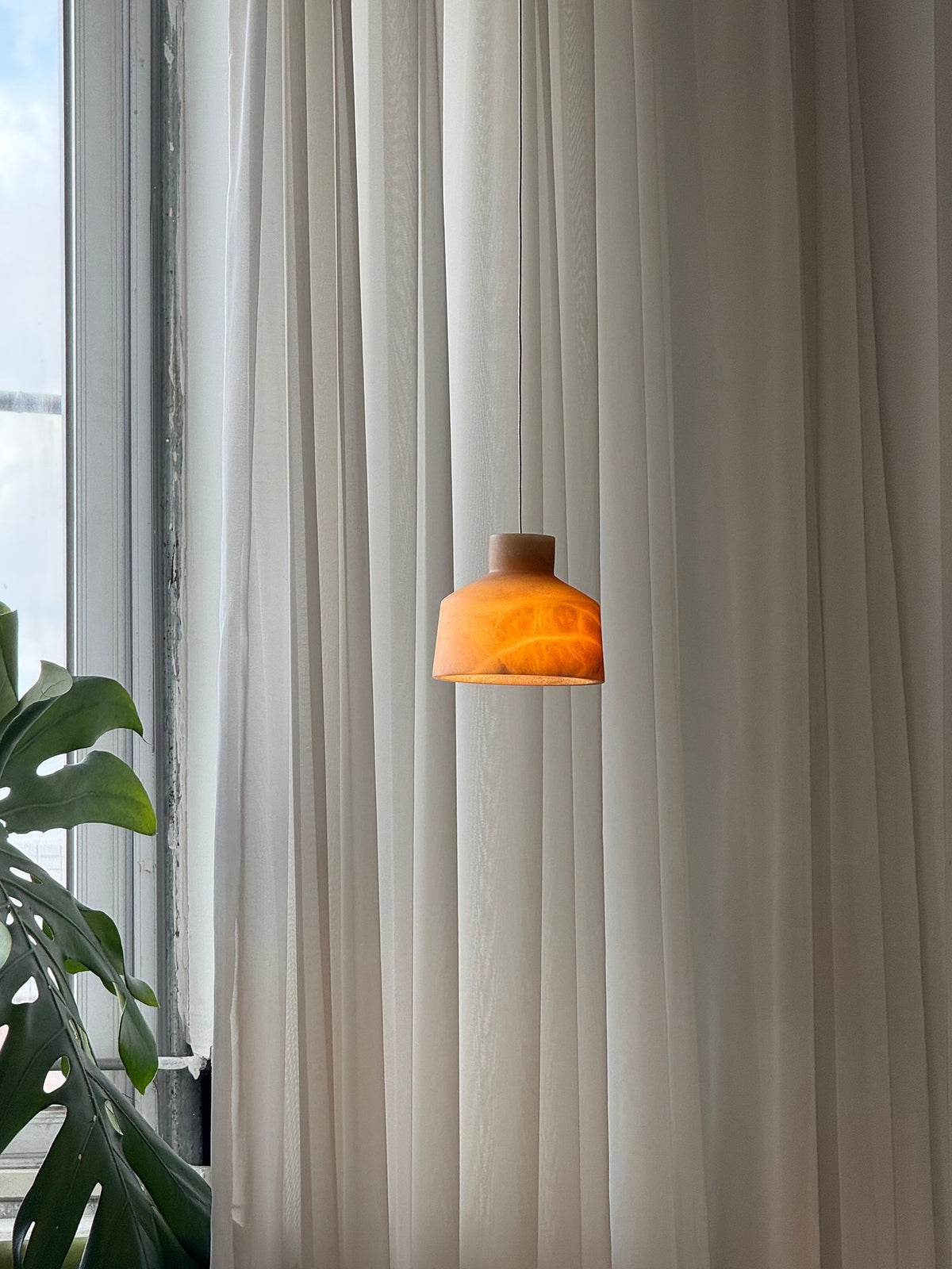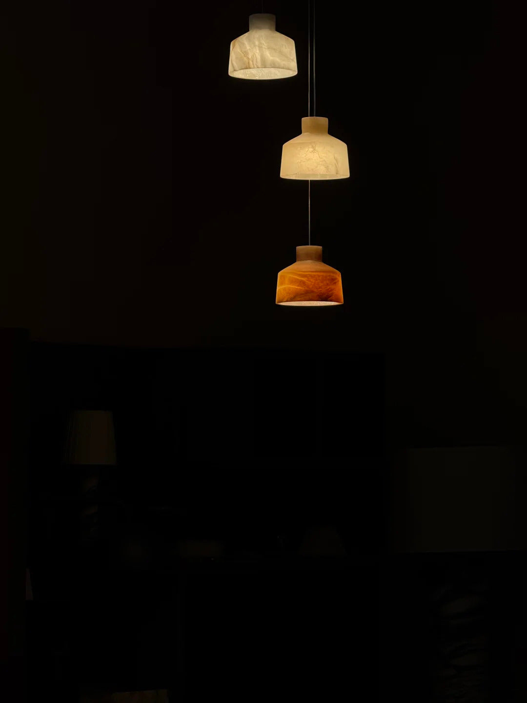 - Crafted from exquisite alabaster, the Marybelle Pendant Lamp showcases a warm, natural texture, making each piece uniquely beautiful. When illuminated, the light diffuses softly through the stone, creating a hazy, inviting glow that enhances any space with a tranquil and cozy atmosphere.