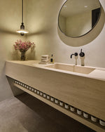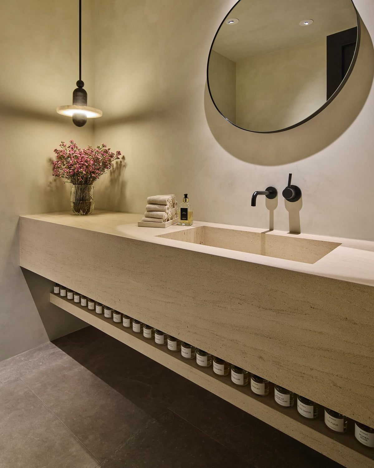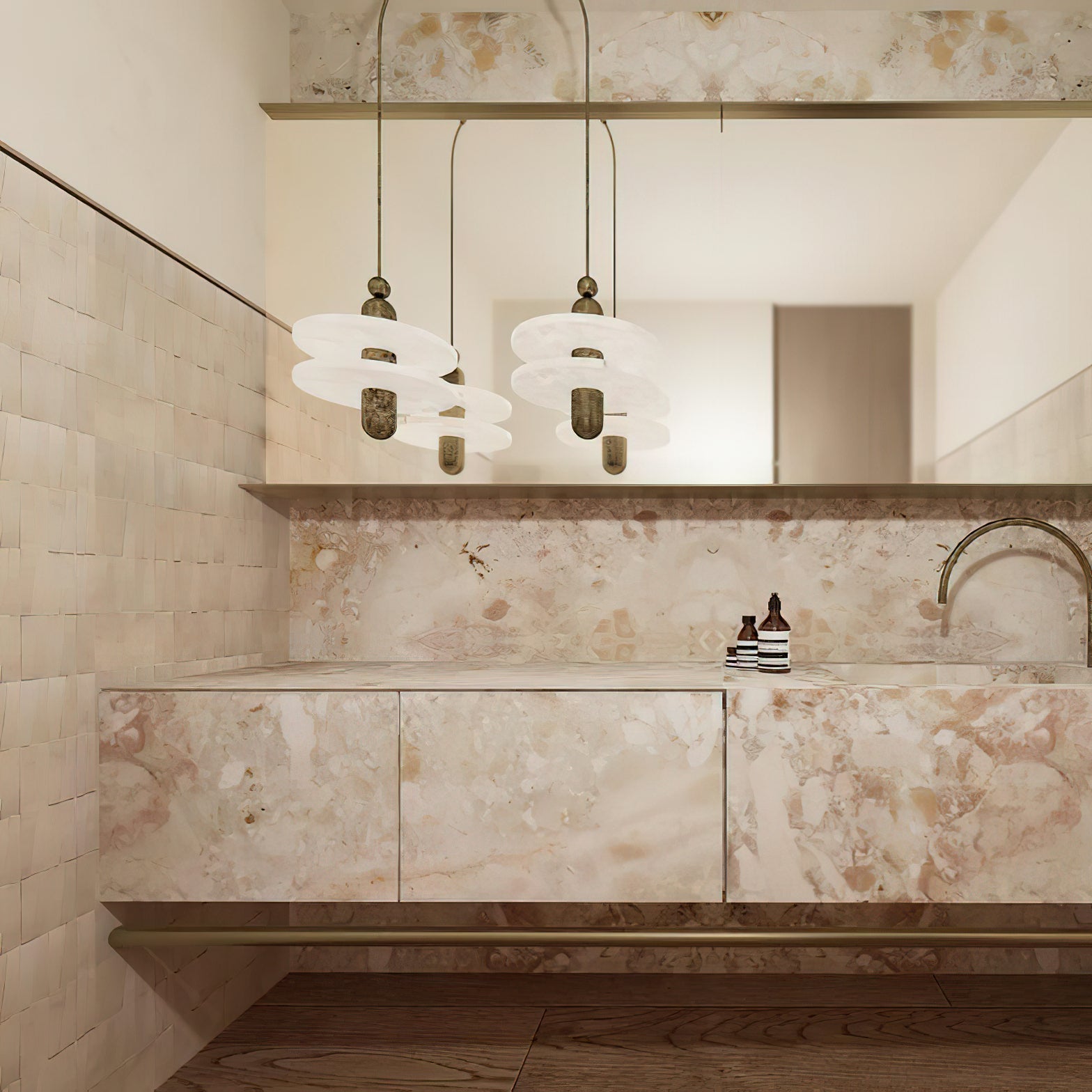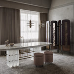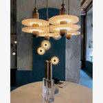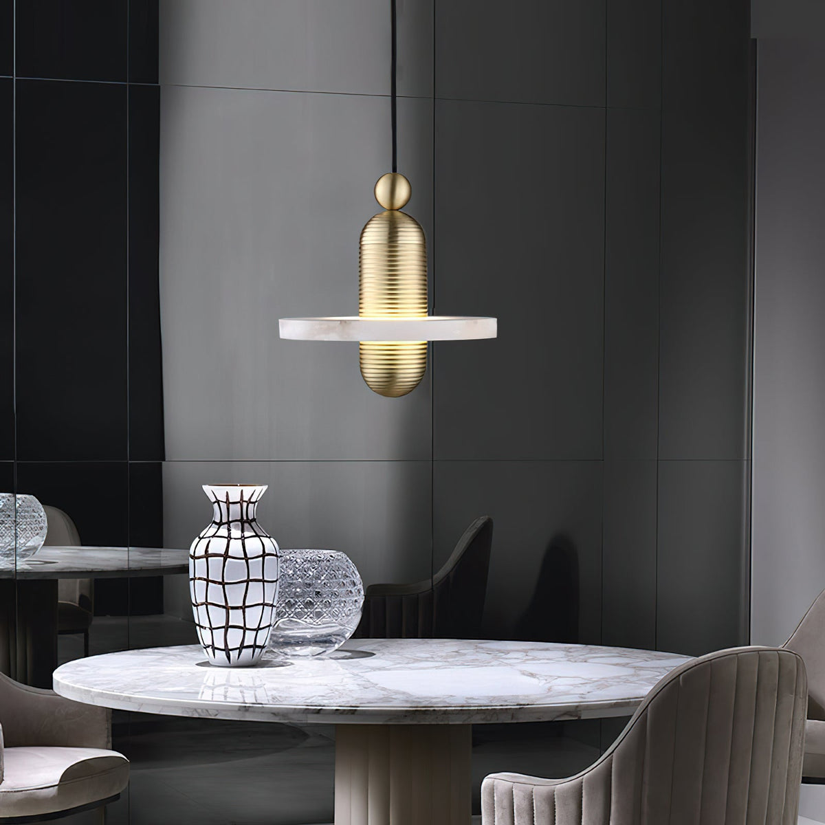• The Median 1 Pendant Lamp is a captivating blend of ancient artistry and futuristic design. Inspired by traditional Middle Eastern jewelry, this unique piece features translucent alabaster planes dramatically intersected by a fluted brass form. A hidden light source gently illuminates the stone, casting a warm glow that subtly reveals the interplay between solid and permeable. This mesmerizing lamp is a statement piece that will add a touch of ethereal elegance to any modern interior.