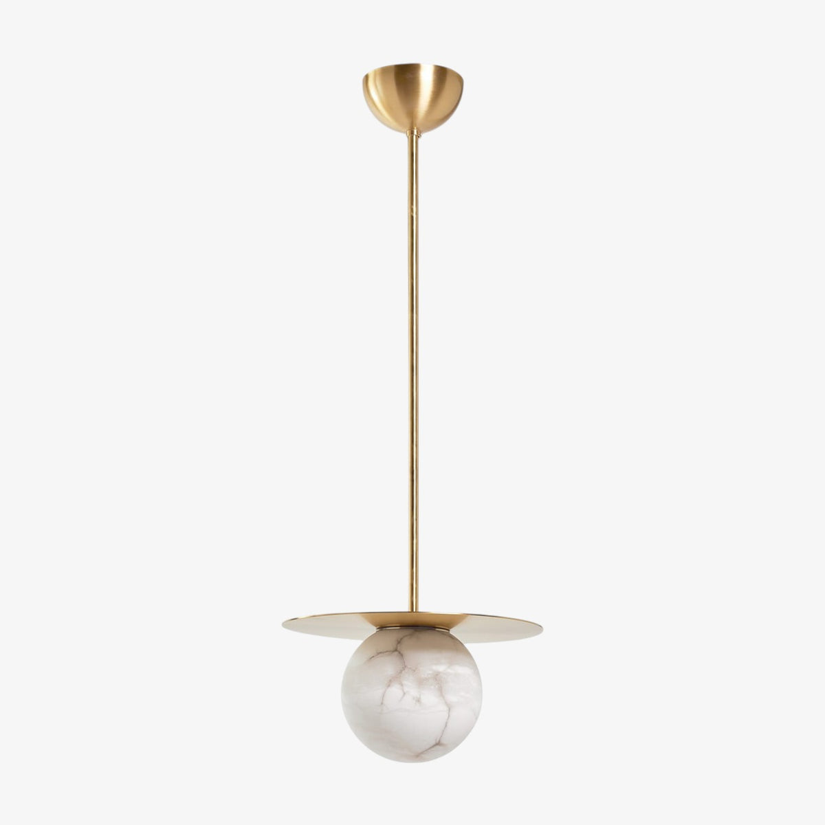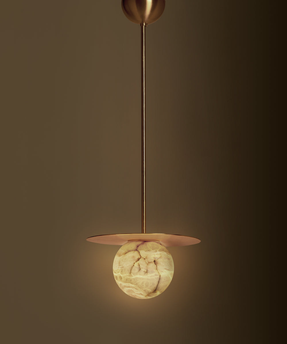- Elevate your space with the Mini Alabaster Moon Pendant Lamp, a piece where artisanal craftsmanship meets modern elegance. Meticulously carved from natural alabaster, each pendant is a unique work of art, showcasing the stone's delicate, one-of-a-kind veining. When illuminated, the warm light filters through the alabaster, creating a soft, ethereal glow that transforms any room into a serene and inviting sanctuary.