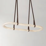 - The ODDA L1P Suspension Light redefines minimalist lighting with a bold yet refined presence. At its core, a sculptural alabaster ring—softly glowing and delicately textured—floats effortlessly, its organic warmth balanced by a slender metallic plate that introduces a sleek, contemporary contrast. Suspended from supple leather straps, meticulously handcrafted for a touch of artisanal luxury, this suspension light bridges raw materiality and modern precision.