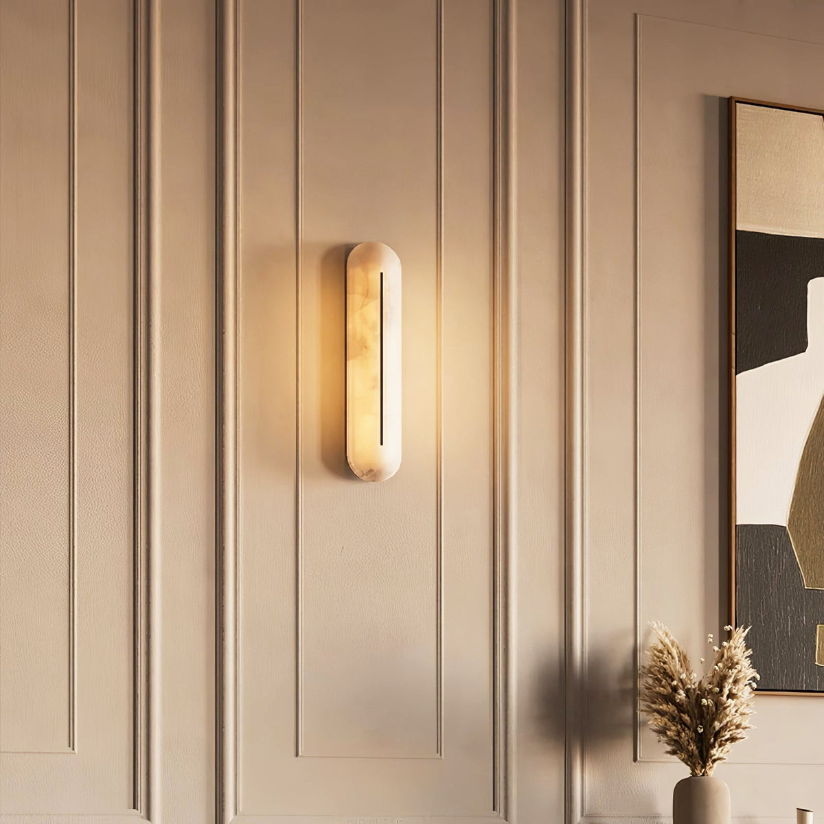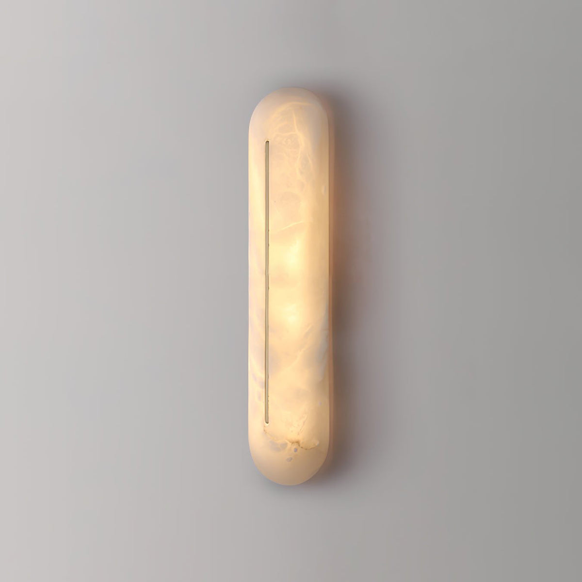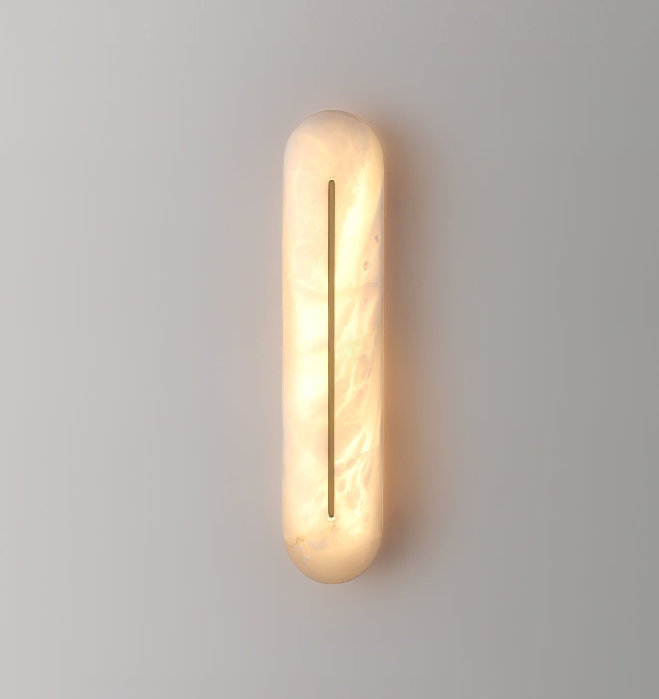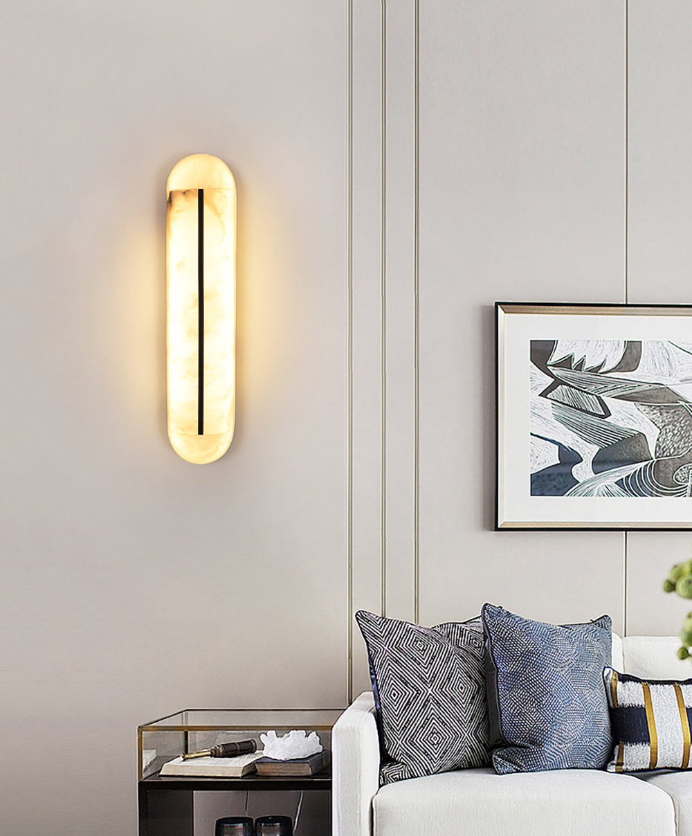 - Oval Alabaster Wall Sconce is a wall lamp with a long oval alabaster lampshade as the core, with a metal line in the middle, smooth lines and simple shape. The warmth and delicateness of alabaster and the metallic luster of brass are perfectly combined to show noble quality. The two classic colors of gold and black can be matched with a variety of home styles. Whether it is to embellish the bedroom, living room, or enhance the style of the corridor, this wall lamp can add a modern and simple artistic atmosphere to your space.