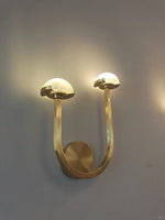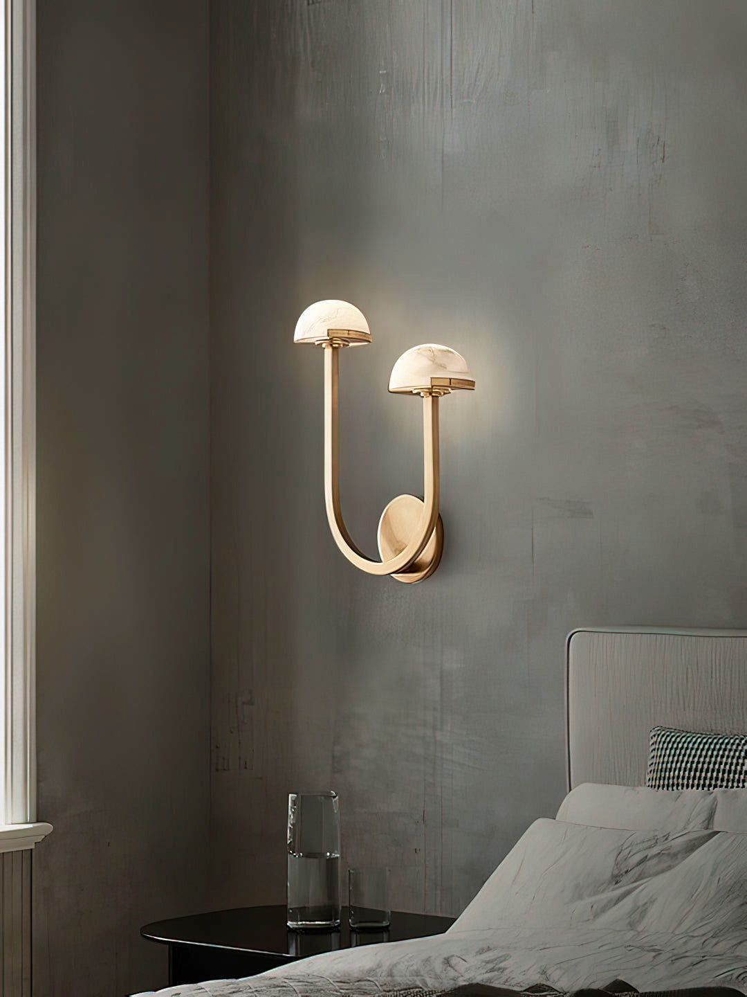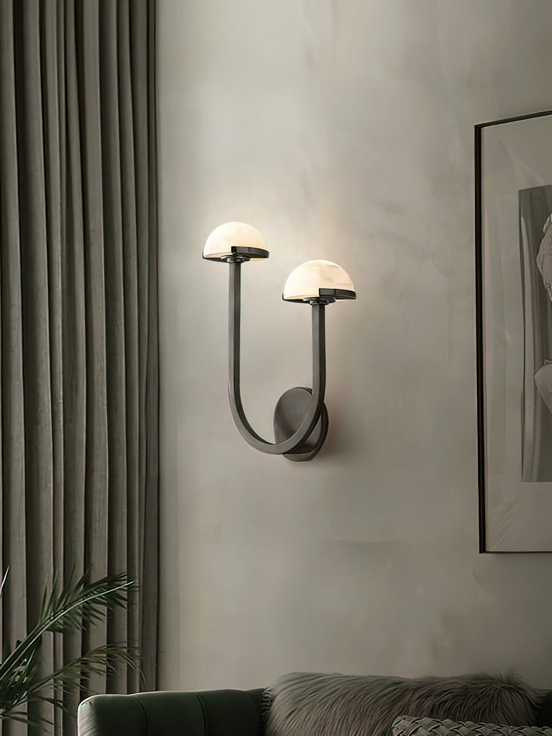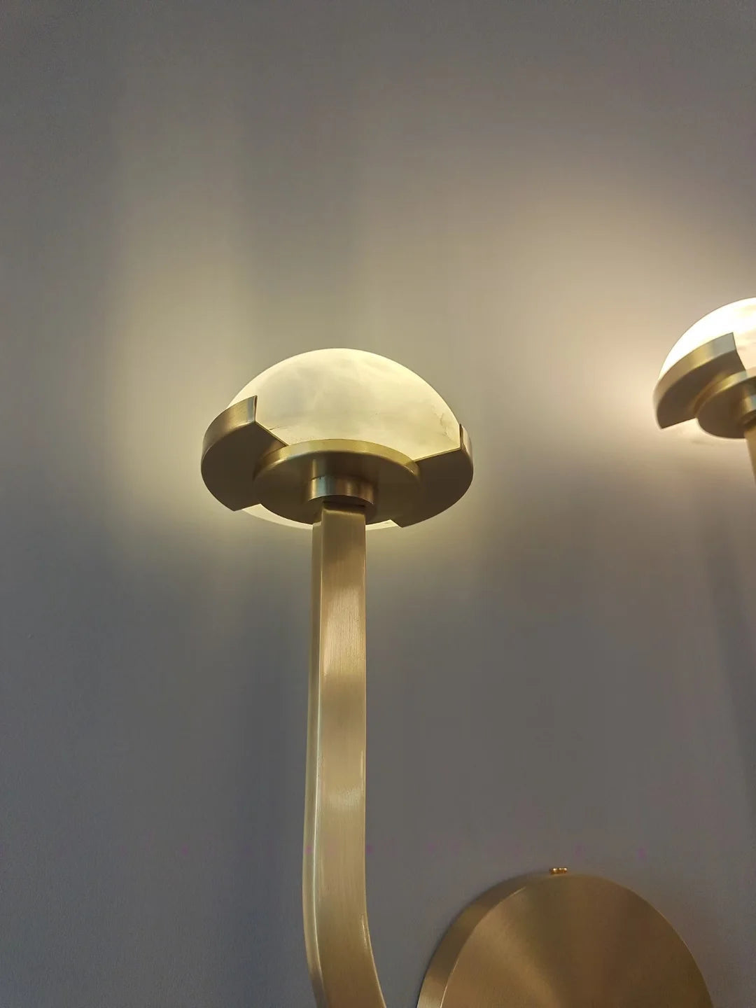 - Effortlessly balancing minimalist design with maximalist impact, the Pedra Double Sconce draws inspiration from midcentury Italian silhouettes, reimagined for contemporary sophistication. Its sleek metal armatures—reminiscent of architectural tracery—elegantly support a constellation of dome-shaped alabaster shades, each hand-selected to showcase the stone’s natural veining and soft, organic coloration.