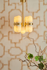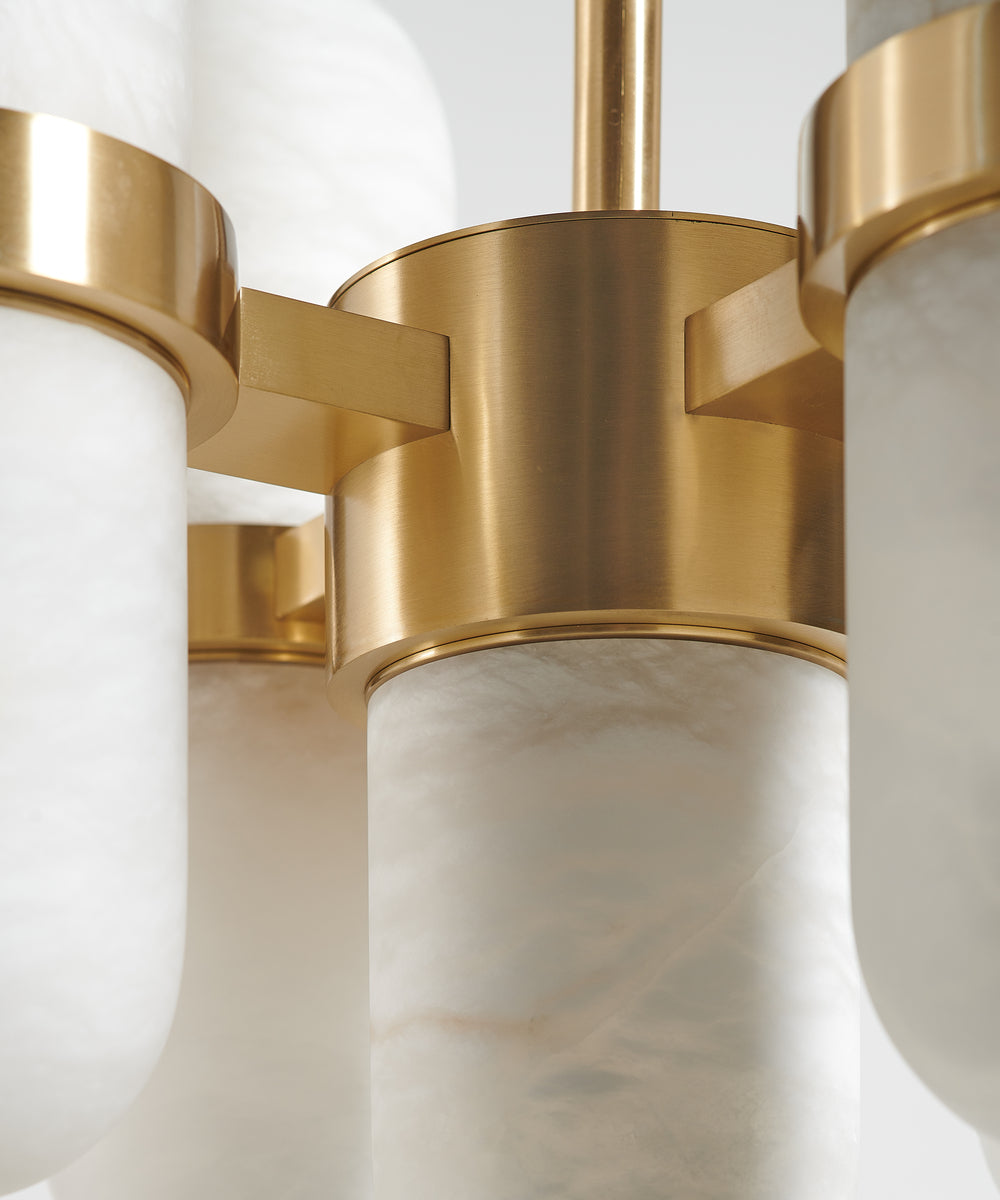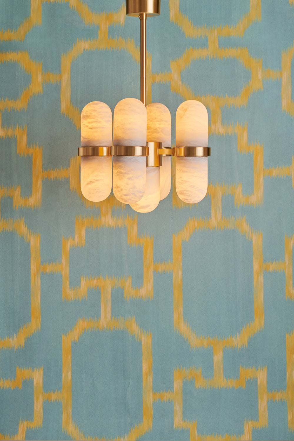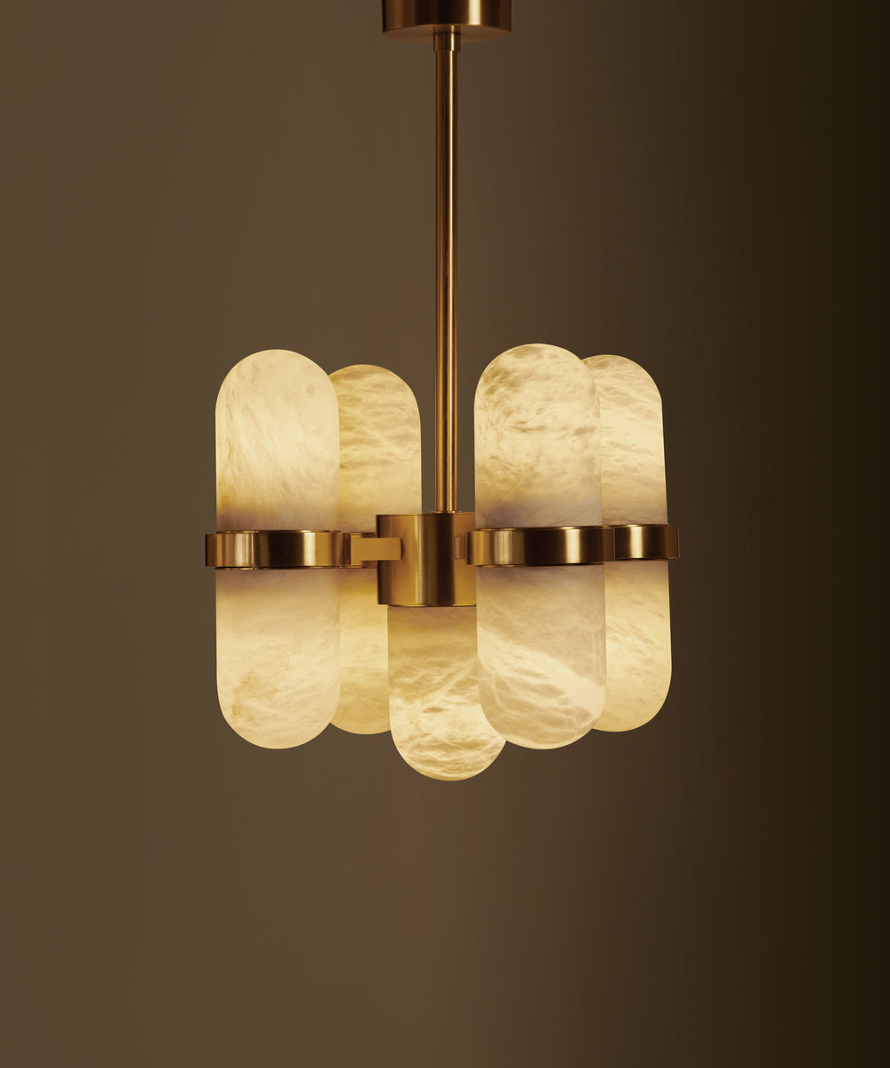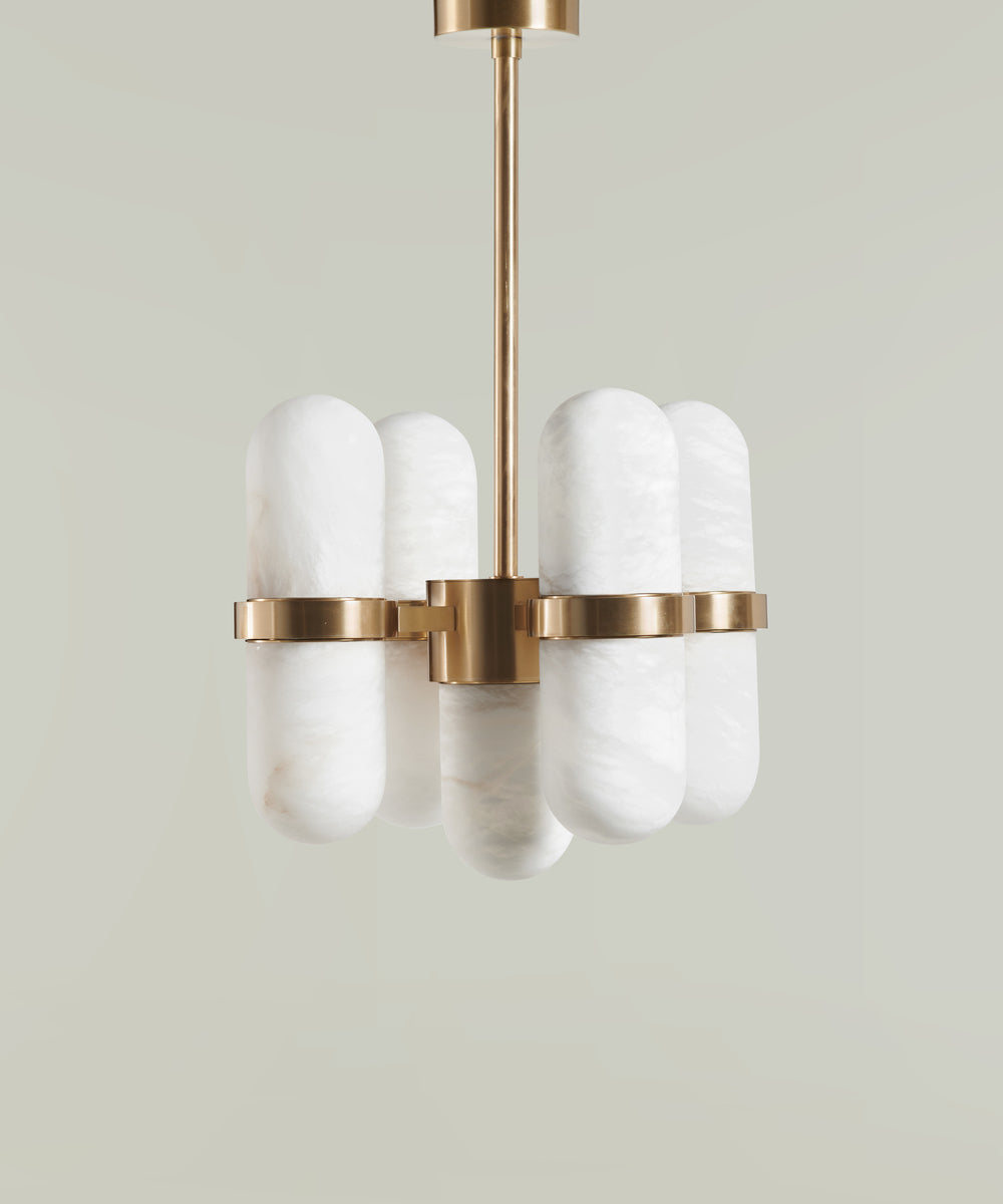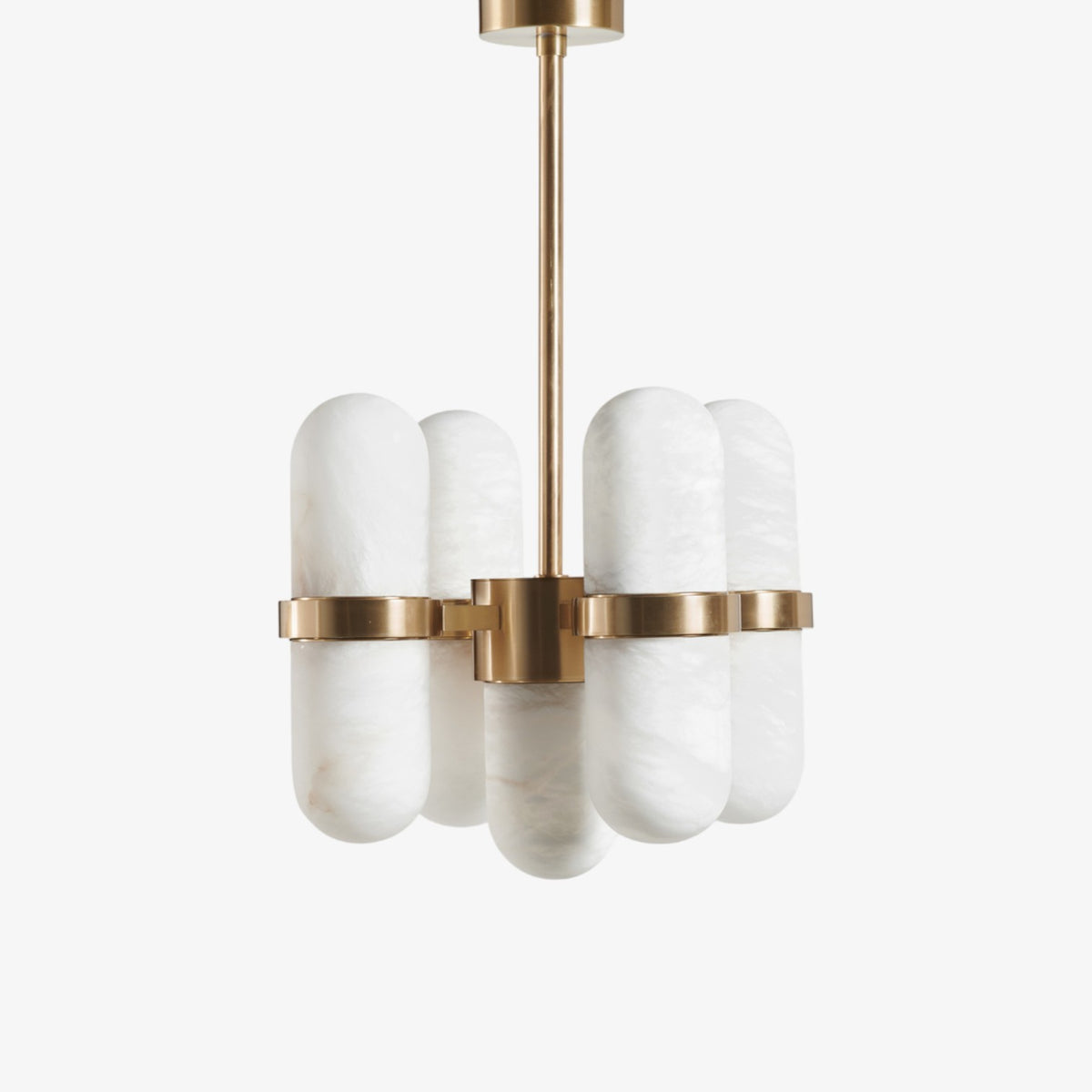 • Its unique form is composed of five distinct "pill"-shaped elements—four lateral pieces encircling a central core—creating a captivating sculptural presence. Crafted from exquisite alabaster, the chandelier features integrated backlighting that beautifully enhances the stone's natural veining and texture. The result is a wonderfully warm and soft ambient glow, perfect for creating an inviting atmosphere in any room.