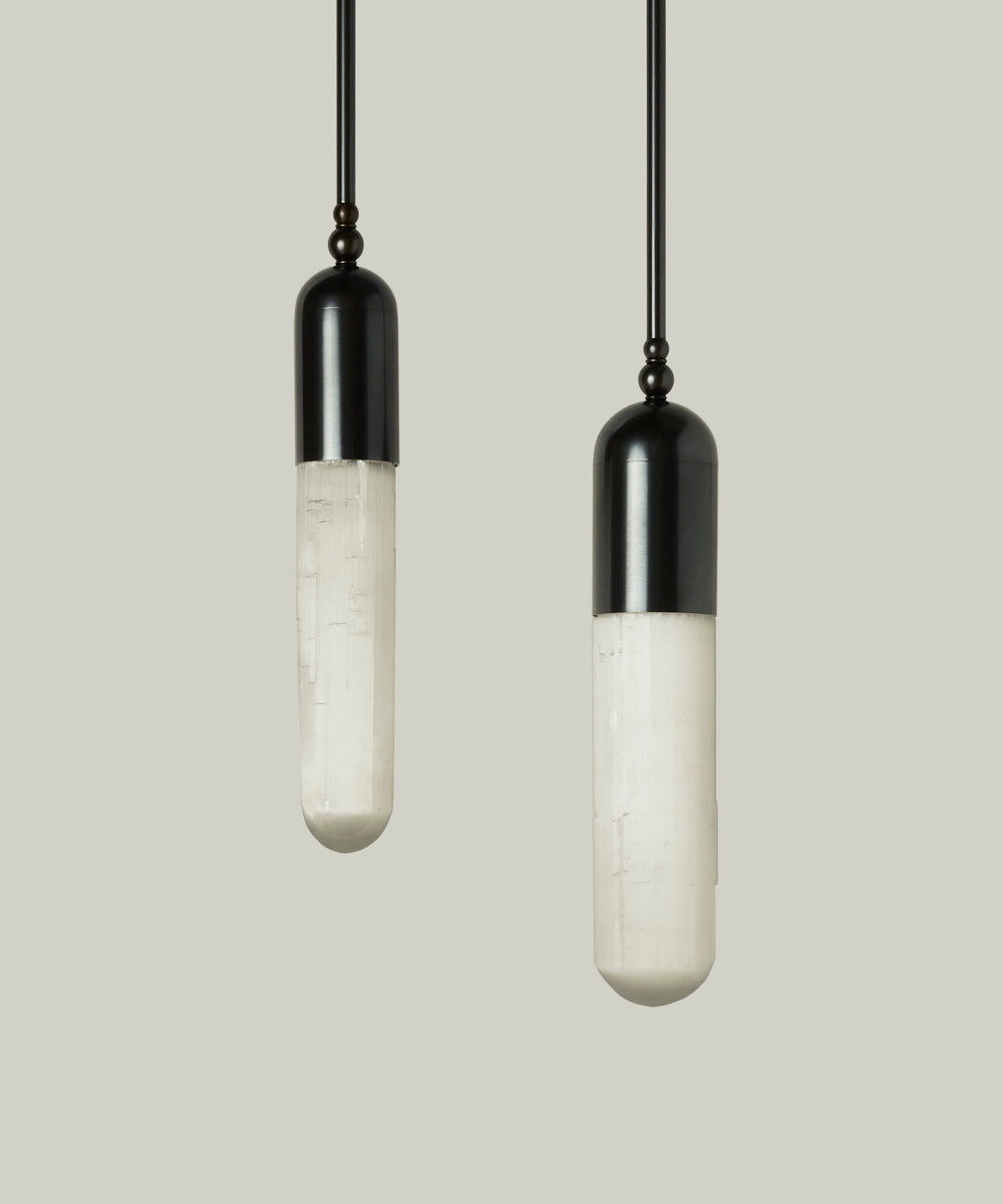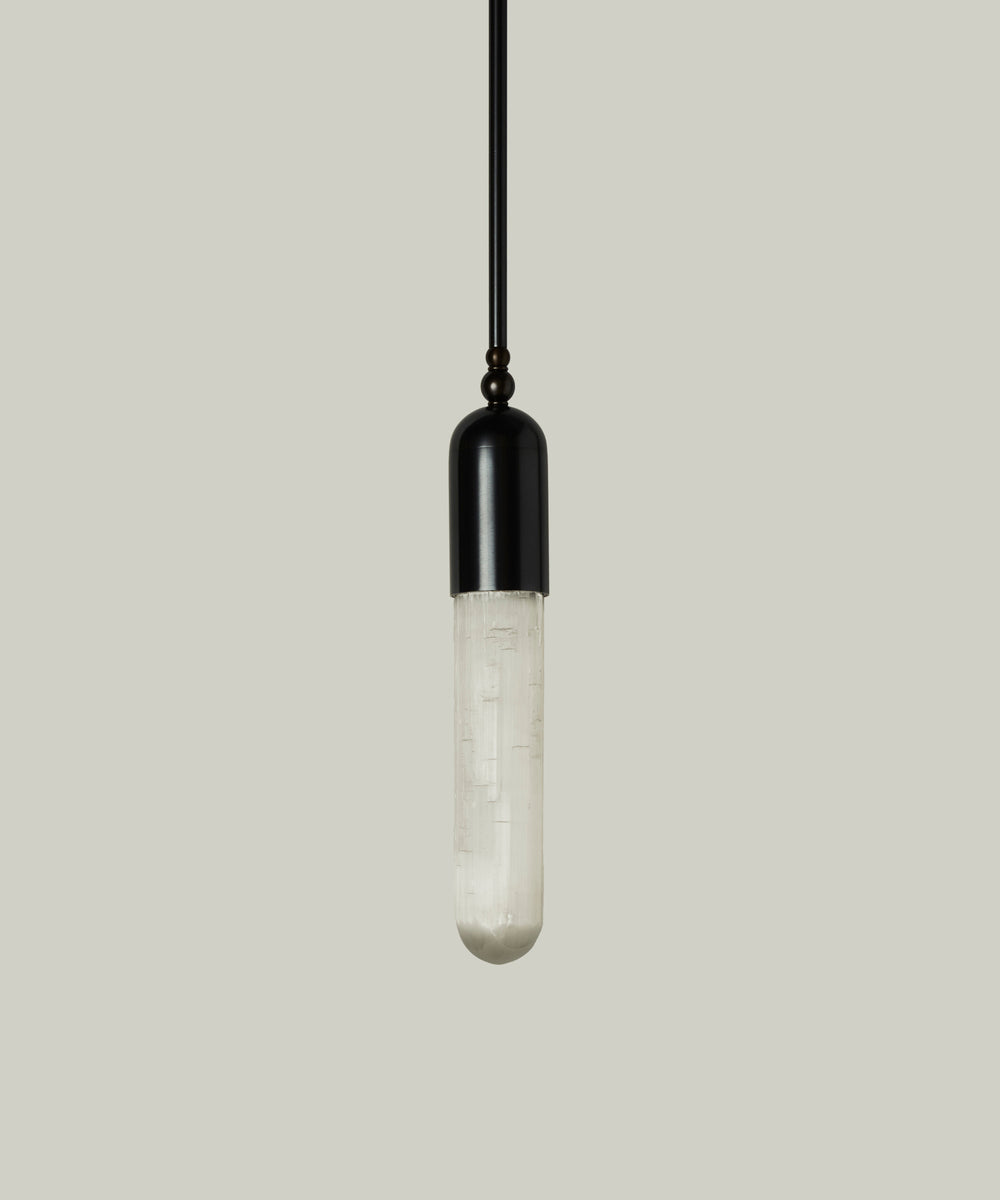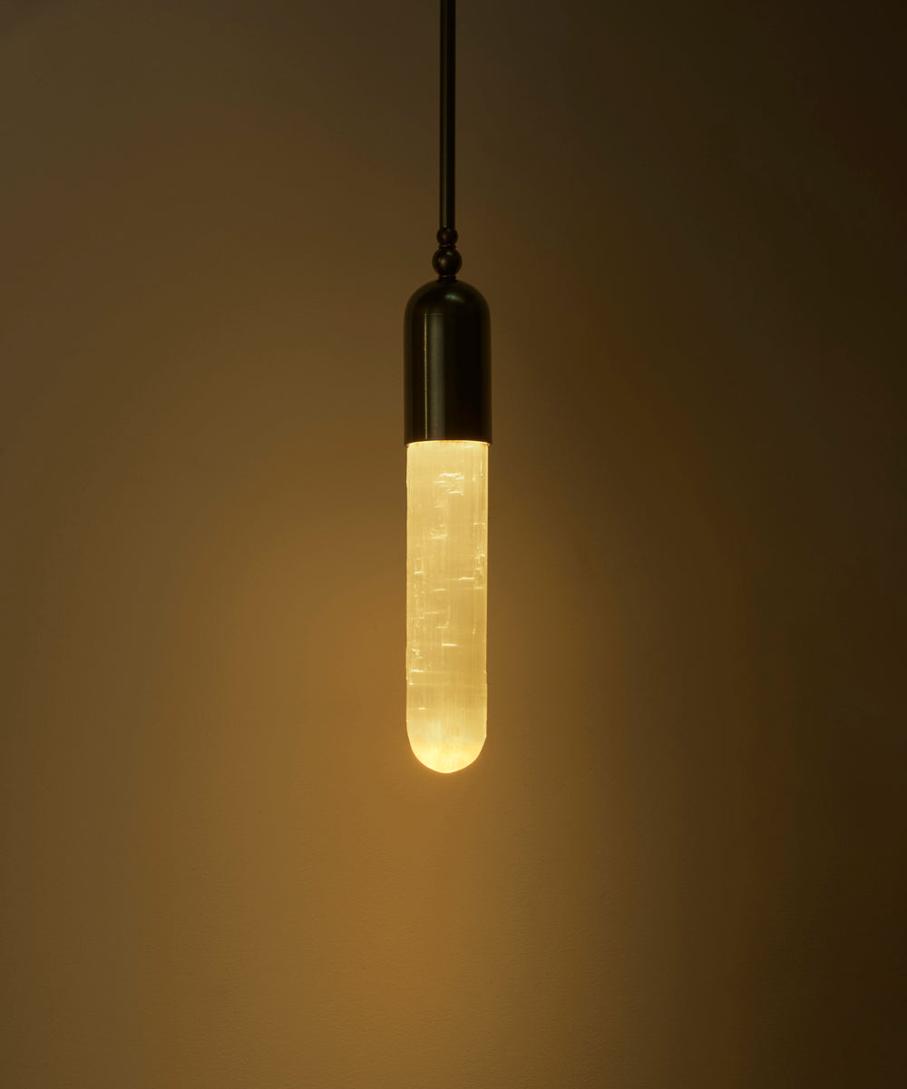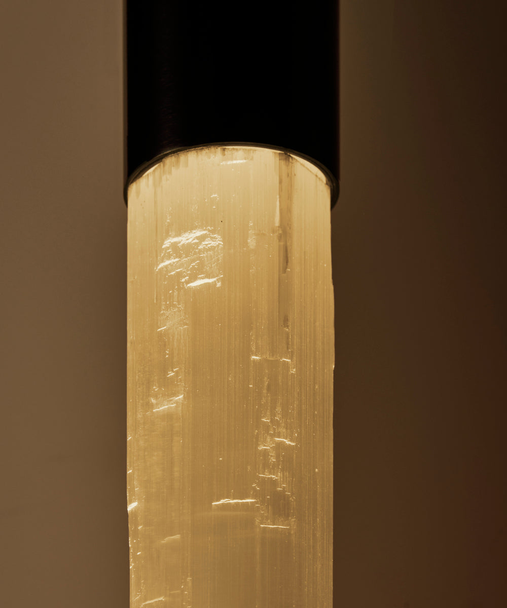 • Each Selene lamp features a stunning cylindrical diffuser, meticulously hand-sculpted from a solid, rough block of Selenite. This isn't mass-produced glass or plastic—it's a unique mineral canvas. As light passes through the stone, it highlights the natural, defined striations and irregularities of the crystal, creating a soft, diffused glow that is never the same twice. Selenite's remarkable property of transmitting light with minimal power loss ensures the glow remains beautifully potent from end to end.