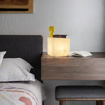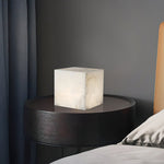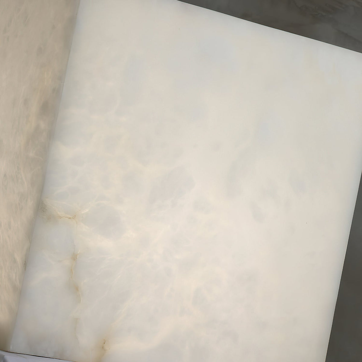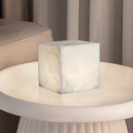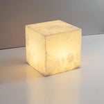 • Crafted from hand-selected alabaster sheets, the lamp is seamlessly joined to create a smooth, polished surface that radiates sophistication. The sturdy cube base houses soft LED lighting, casting a warm, ethereal glow that enhances the stone’s natural luminosity.
