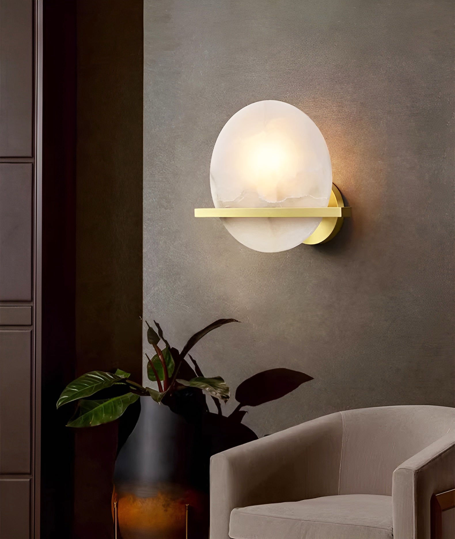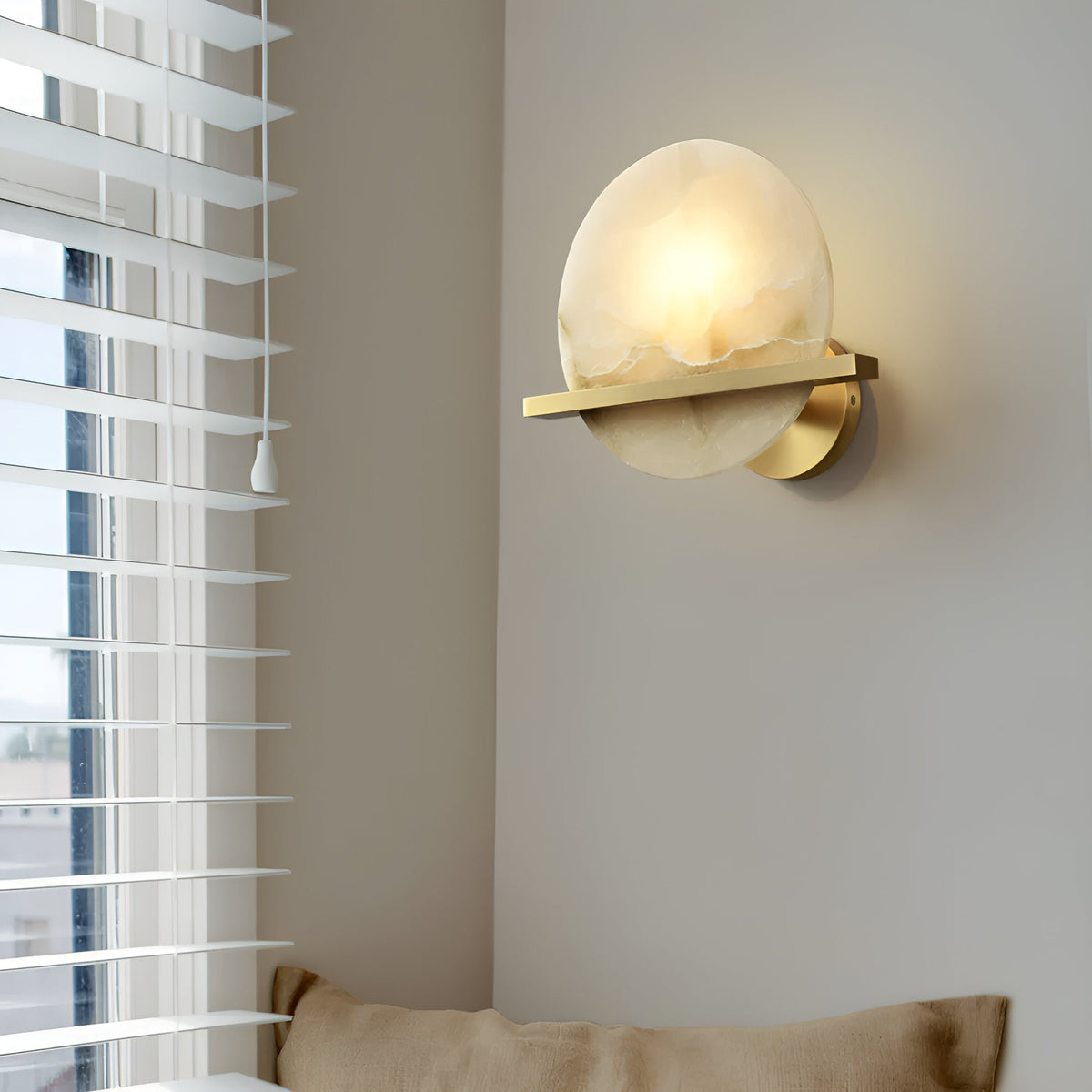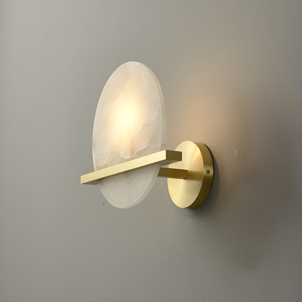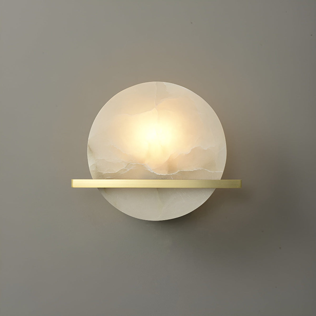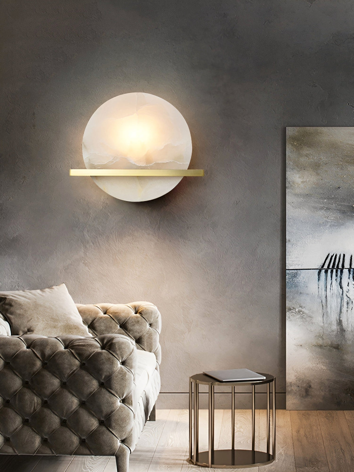 • The Vicky Alabaster Wall Sconce Round is a minimalist masterpiece. A sleek brass crossbar, reminiscent of a horizon, supports a captivating white Alabaster disc. The disc's natural textures and swirling patterns are beautifully highlighted by a warm ambient glow, casting a striking silhouette on the wall.