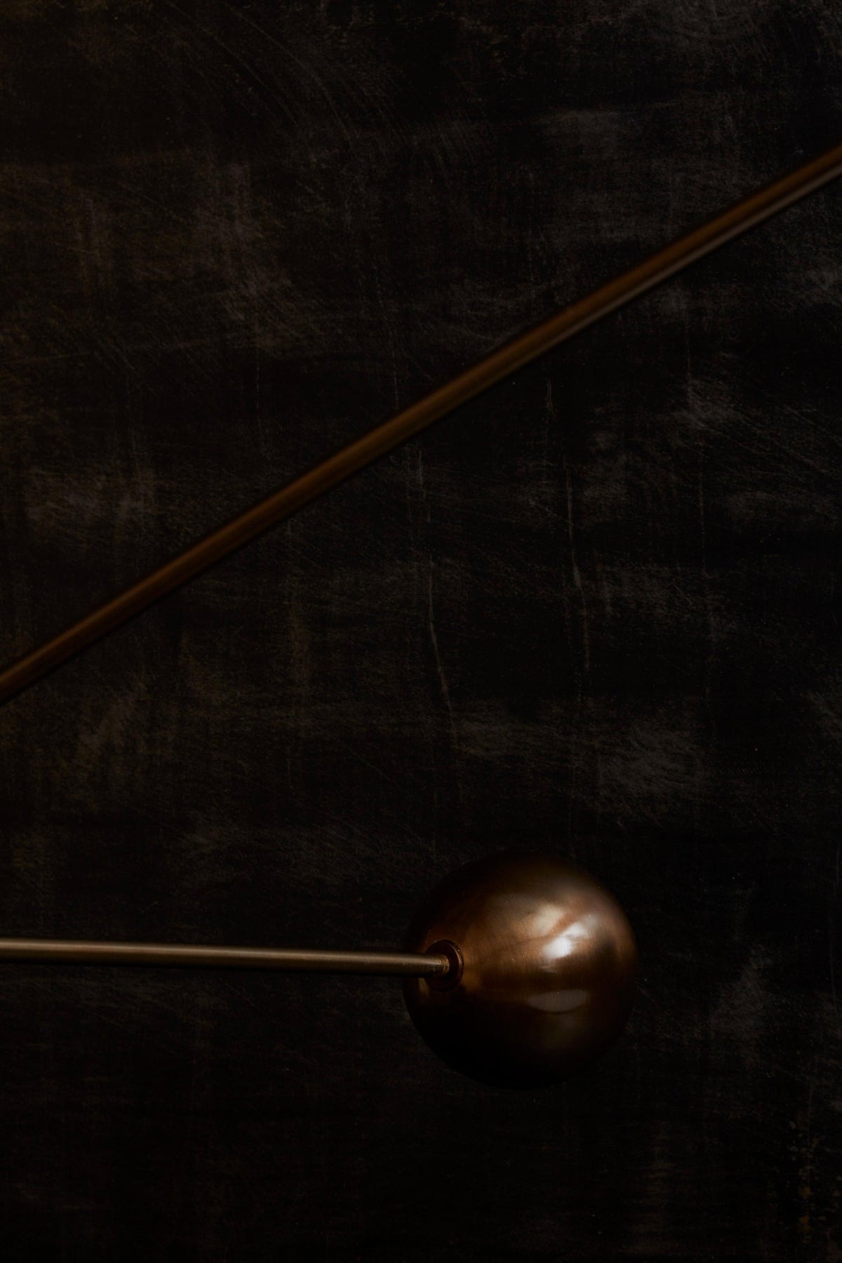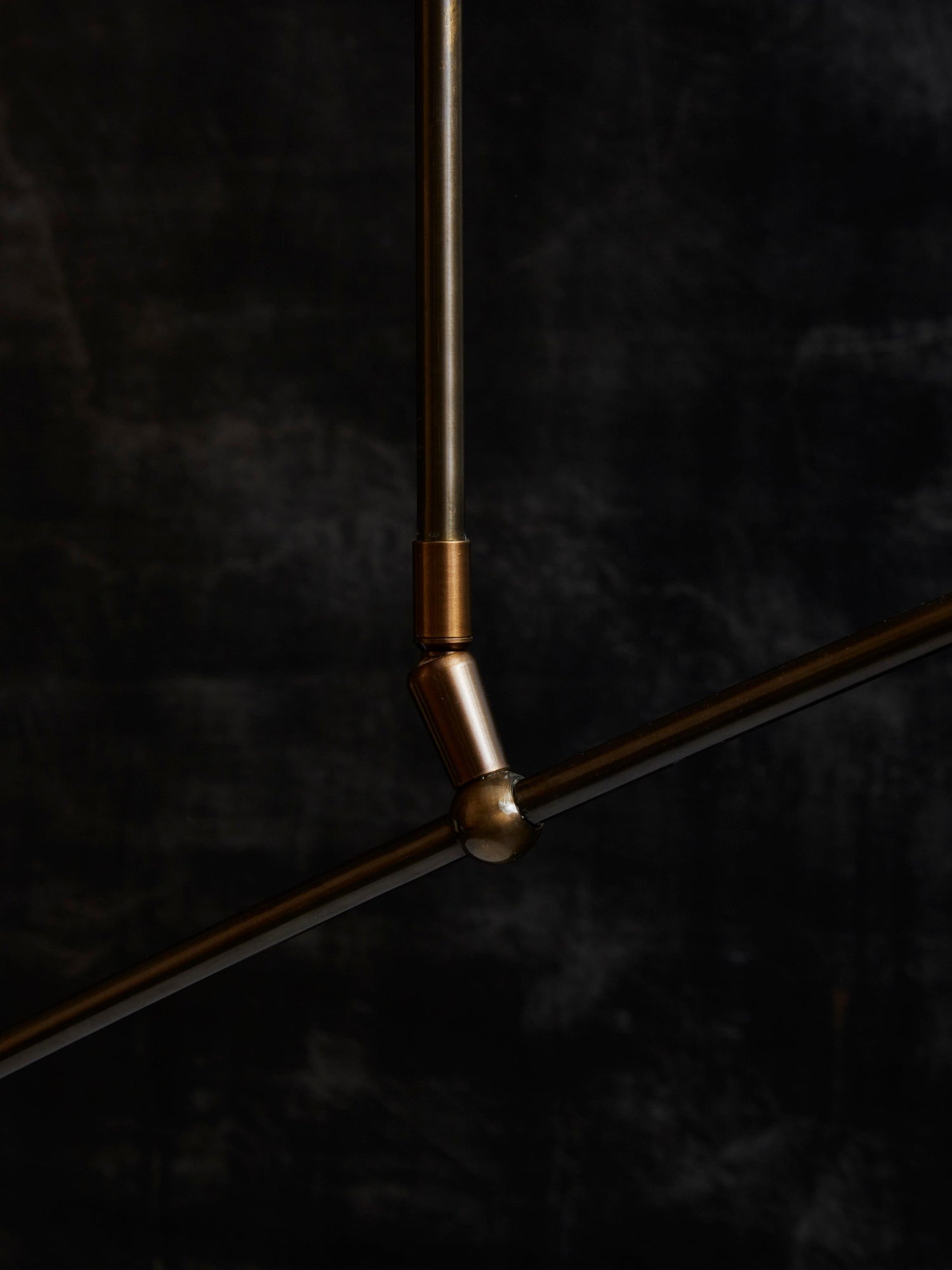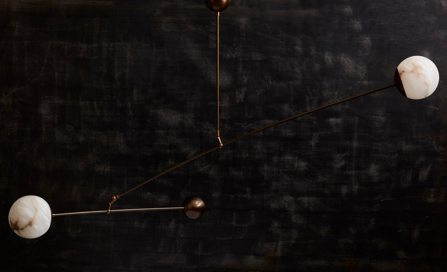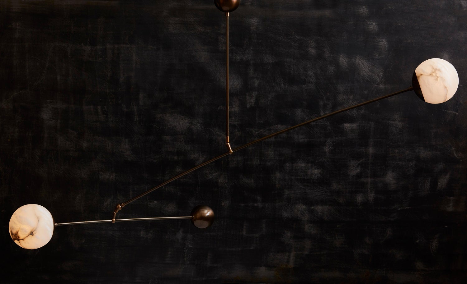 - Introduce a captivating focal point to any room with our Alabaster Mobile Chandelier. This unique kinetic sculpture combines timeless materials with graceful movement. Featuring two softly glowing alabaster globes suspended from a structure of richly patinated brass, the chandelier is balanced by a sleek, round counterweight. A gentle breeze or a subtle touch sets the entire piece into a slow, mesmerizing dance, casting beautiful, dynamic shadows. More than a light source, it's a statement piece of living art.