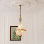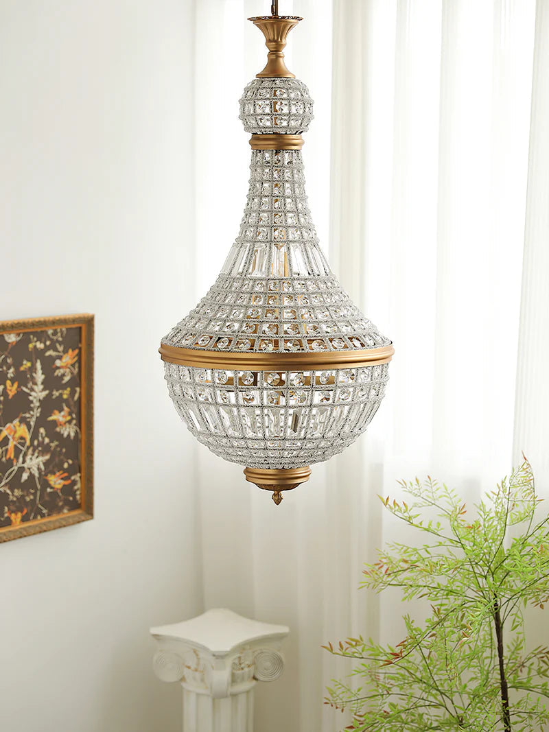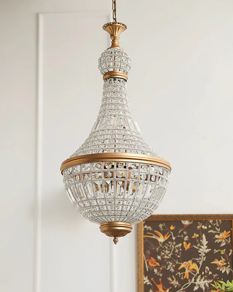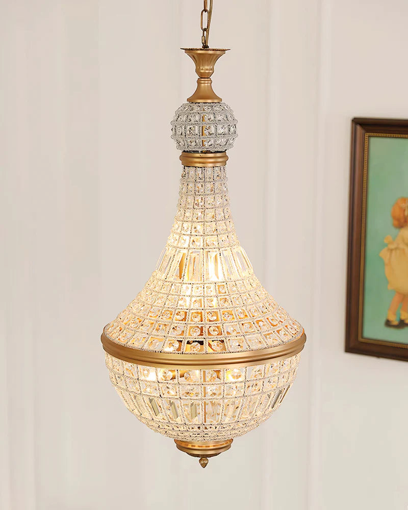 - Elevate your space with the timeless elegance of the Annamaria Crystal Chandelier. This stunning fixture features a vintage-inspired frame adorned with sparkling crystals, creating a luxurious and captivating ambiance. The unique design incorporates large crystals suspended between each rectangular space, adding a touch of opulence to any room. Perfect for formal dining rooms, grand foyers, or opulent bedrooms, the Annamaria Chandelier is a masterpiece that will leave a lasting impression.