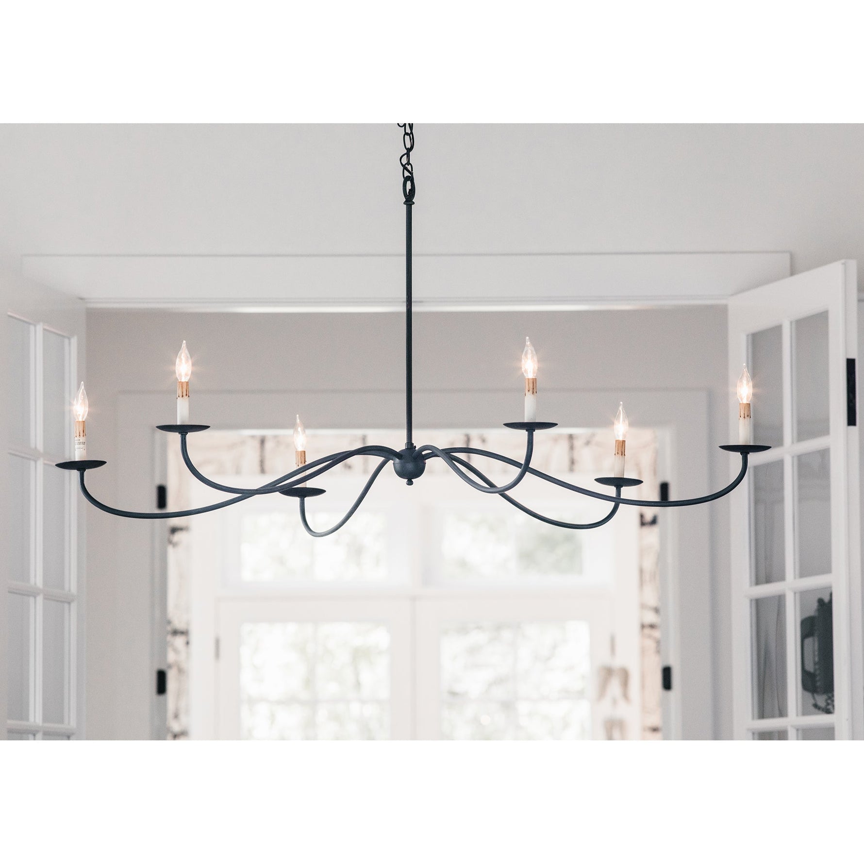 - The Arline Chandelier is a breathtaking statement piece, boasting an impressive 63-inch diameter that commands attention in any grand space. Inspired by a bygone era, its exquisite silver Granello finish adds a touch of vintage sophistication, while the gracefully arched, slender lines lend a contemporary edge—perfect for today’s refined interiors.