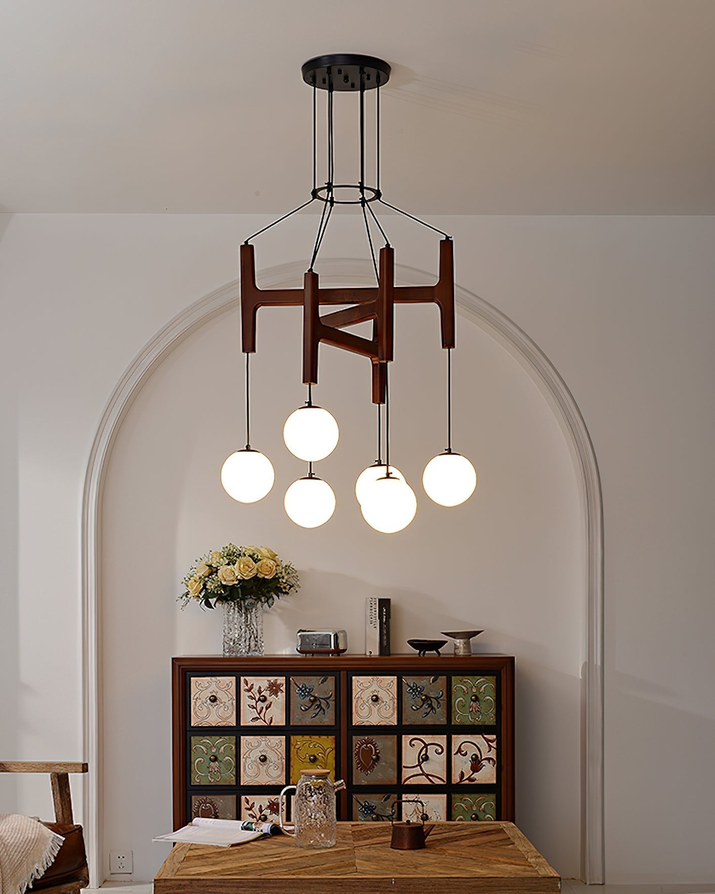 • What sets the Astra Suspension Lamp apart is its unique modular design. As the number of lamp heads increases to four or six, the I-beam wood lamp bodies are stacked vertically, allowing for a larger fixture without expanding the overall footprint. This ingenious design makes the Keitel Chandelier ideal for both small and large spaces.