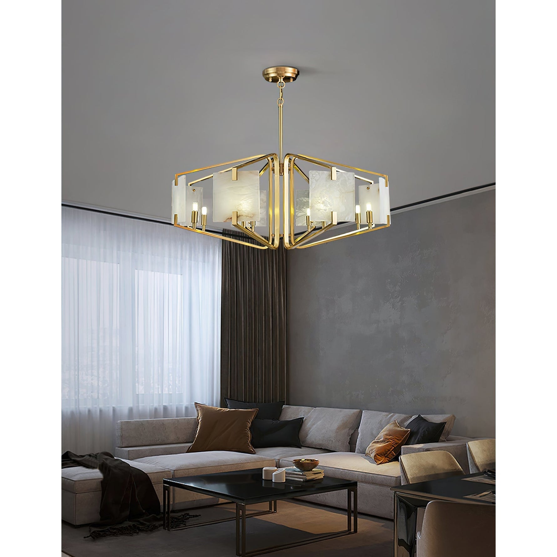 - Elevate your living space with the Audette Alabaster Chandelier, an exquisite lighting fixture that embodies the perfect fusion of classic charm and contemporary sophistication. Meticulously crafted, this stunning chandelier features a robust brass lamp body that exudes a timeless appeal, while the sumptuous alabaster lampshades diffuse a warm, inviting glow that enhances any interior.