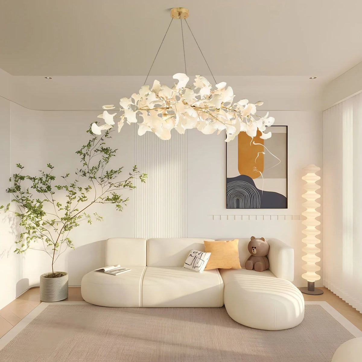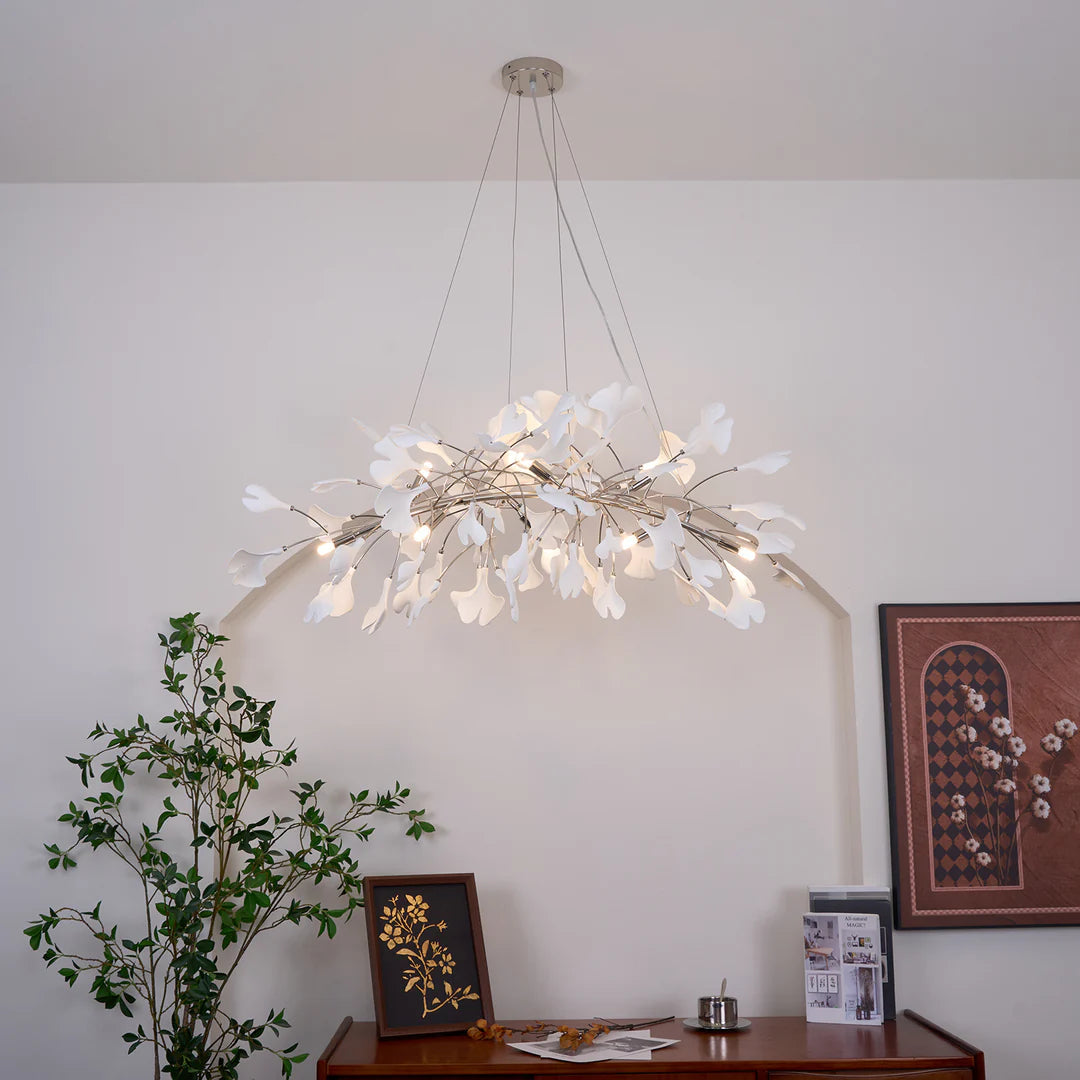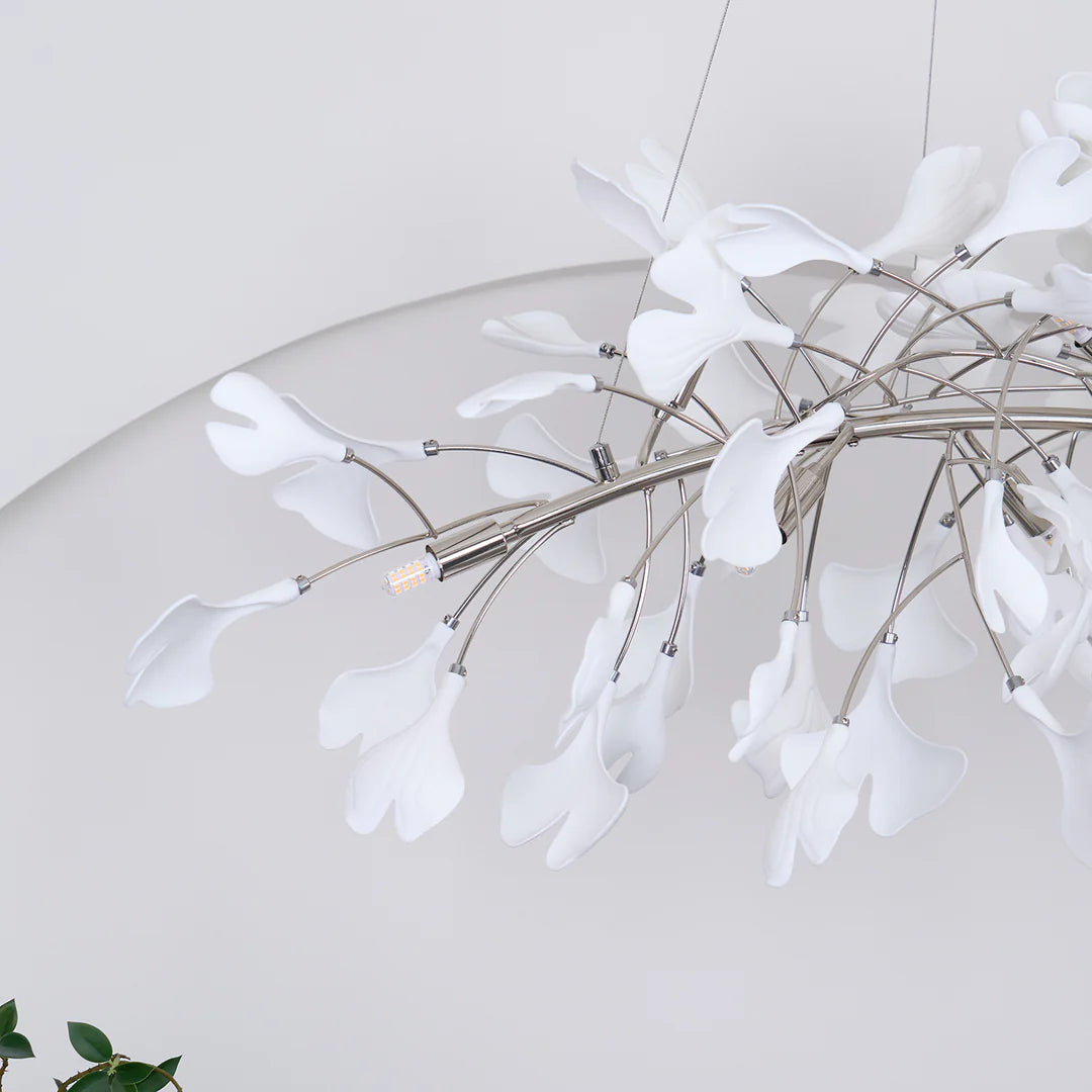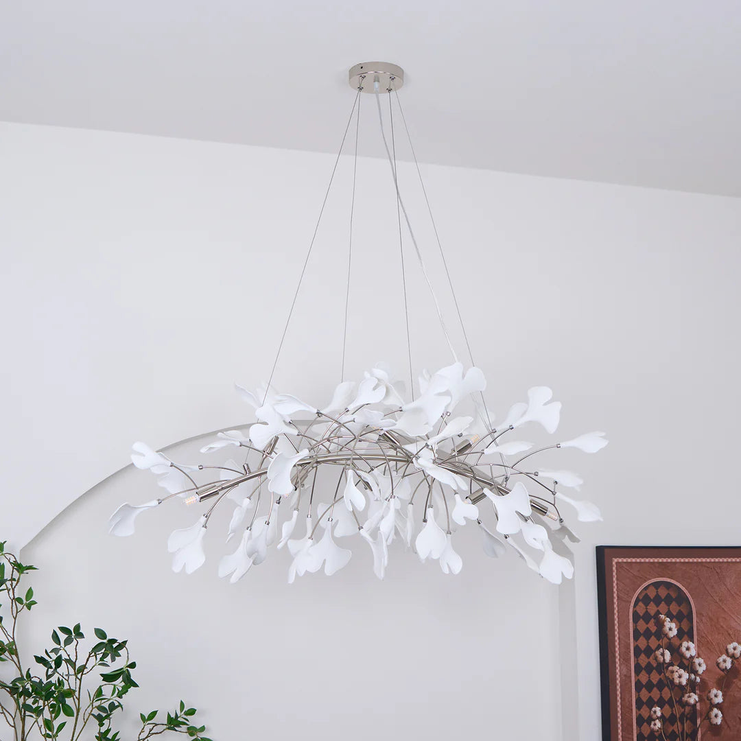 - We want to make your room more natural overall, the Carias Ceramic Ginkgo Chandelier Downward is inspired by this idea, the scene becomes more vivid with warm white light, immerse yourself in a grove over time.