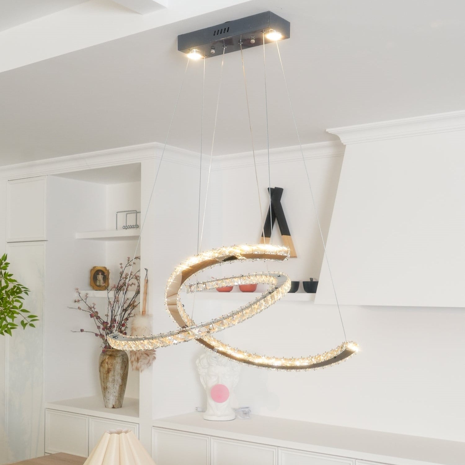 - The Crossed-C Crystal Chandelier is a stunning fusion of elegance and modern design. Featuring two beautifully intertwined C-shaped lamp bodies, this chandelier is a true statement piece that will elevate any room. The stainless steel frame provides a sleek and durable base, while the choice of two crystal colors allows you to customize the ambiance to suit your style. Perfect for those who appreciate refined luxury, this chandelier adds a touch of sophistication and brilliance to your space, making it ideal for high-end interiors.