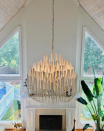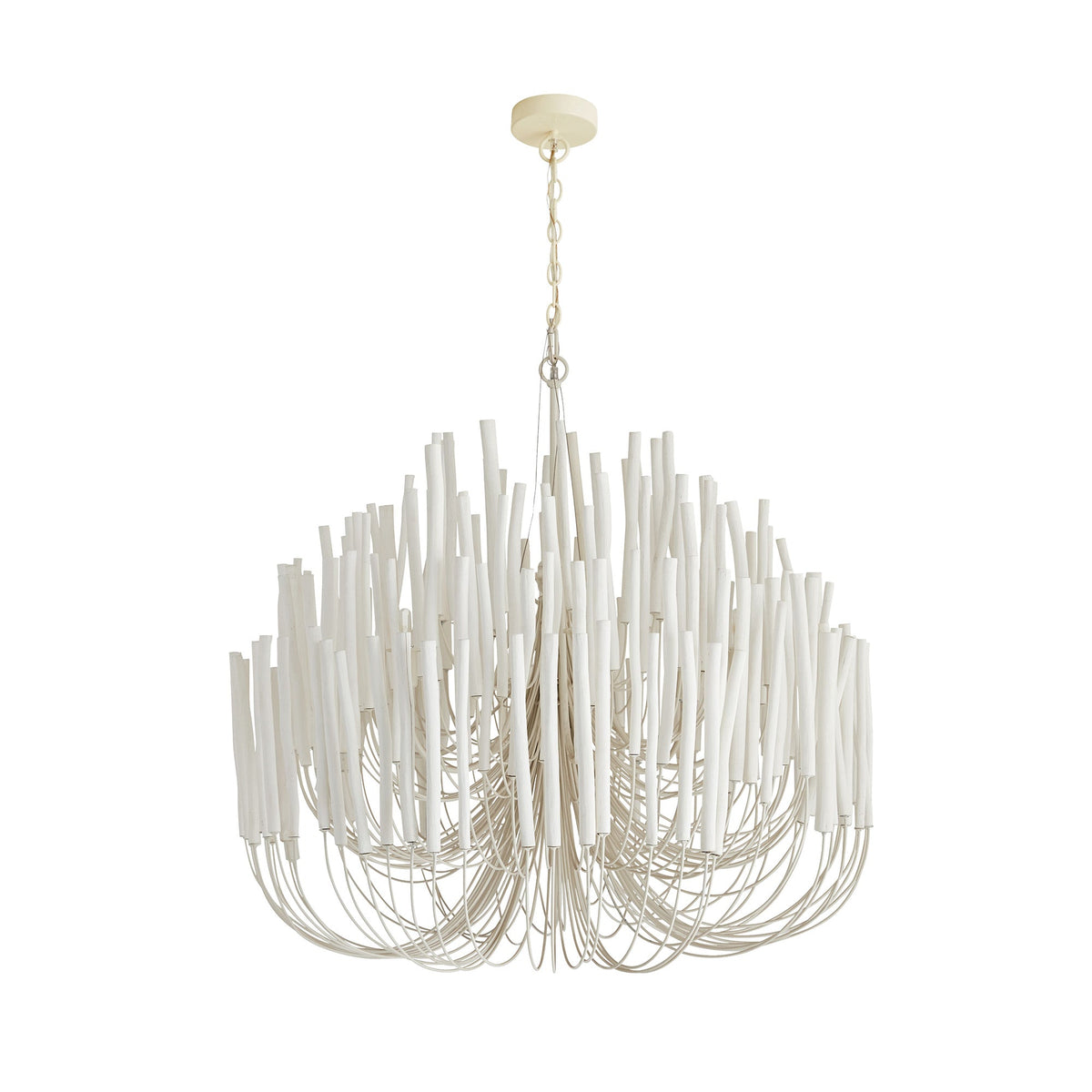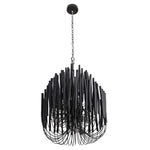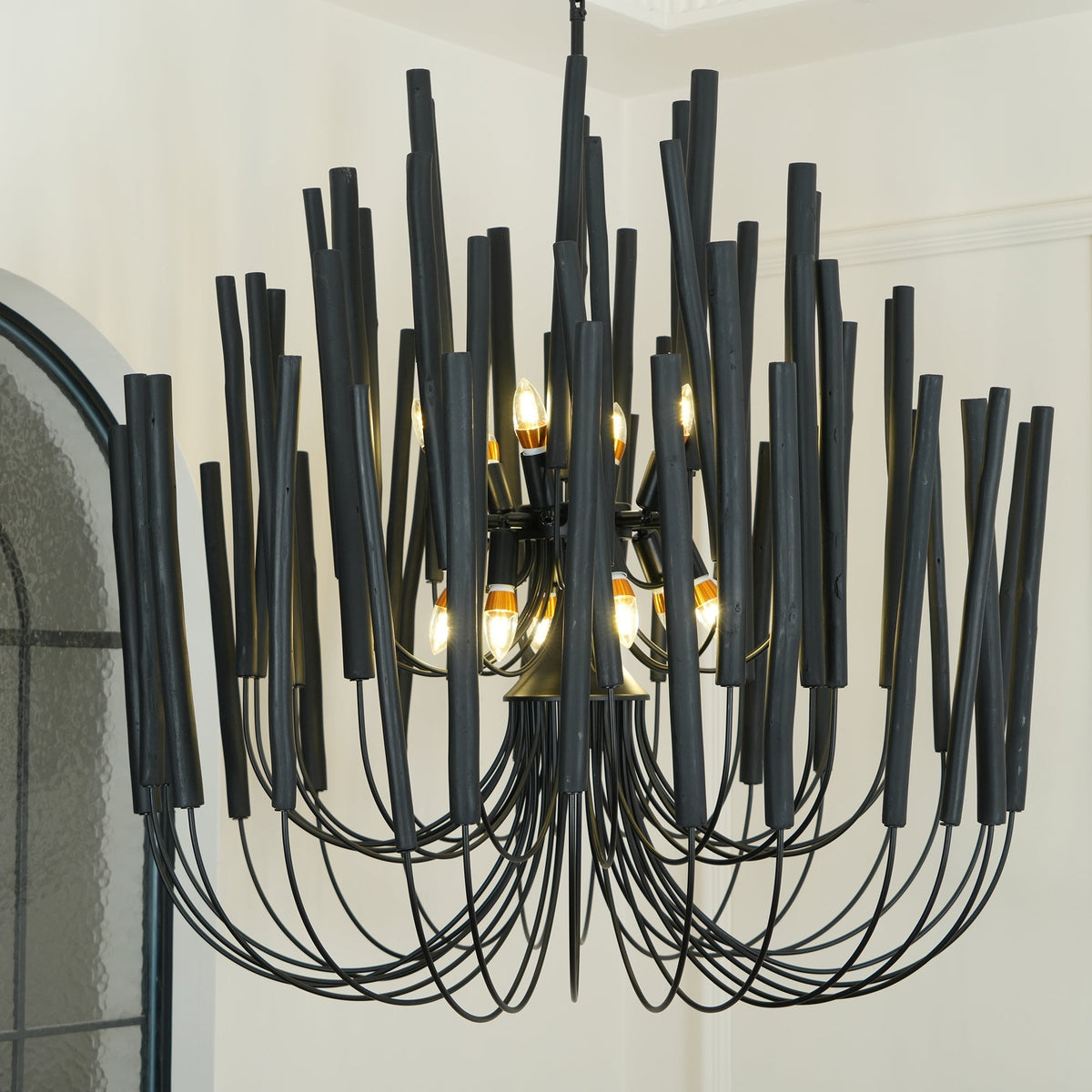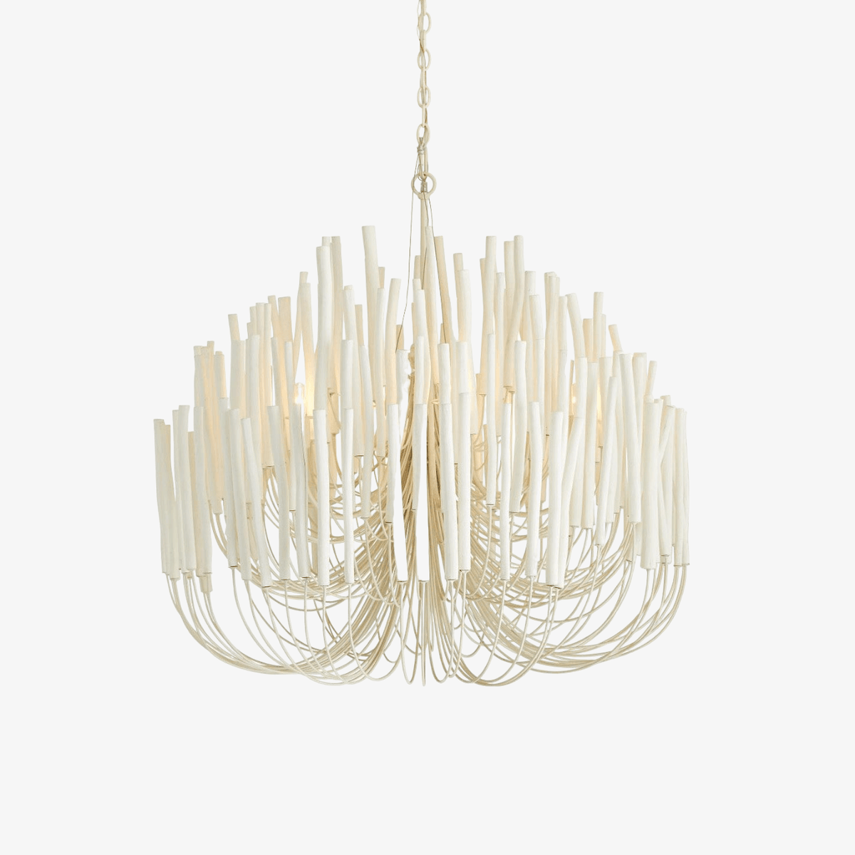 - Add a touch of organic elegance to your space with the Egil Chandelier. This captivating fixture features multiple tiers of slender wooden sticks gracefully arranged on curved iron arms. The interplay of light and shadow creates a mesmerizing effect, adding a unique and intriguing dimension to any room. Available in two stunning finishes - Black stained wood for a dramatic and sophisticated look, or Whitewash stained wood for a more rustic and airy feel. The Egil Chandelier is a true conversation starter, sure to elevate the ambiance of your home.