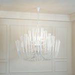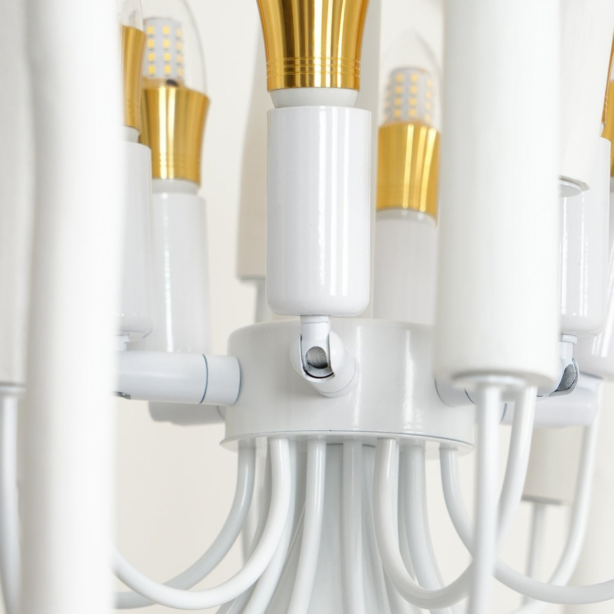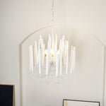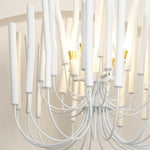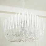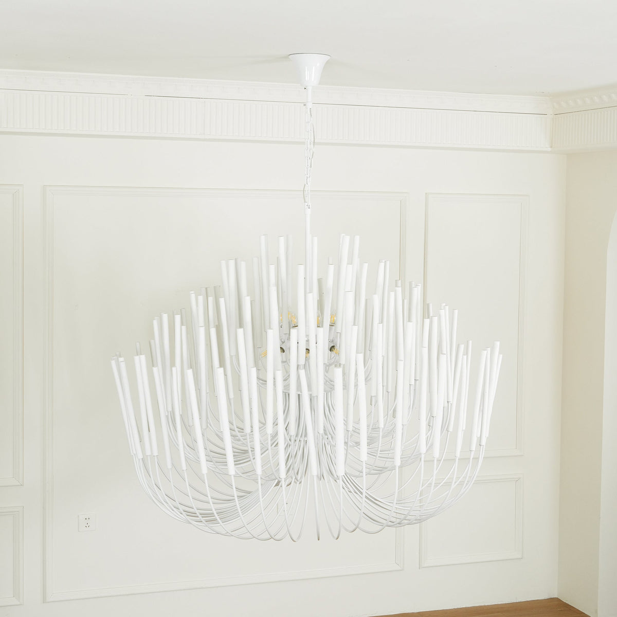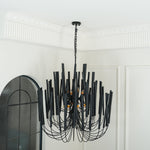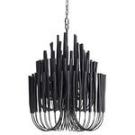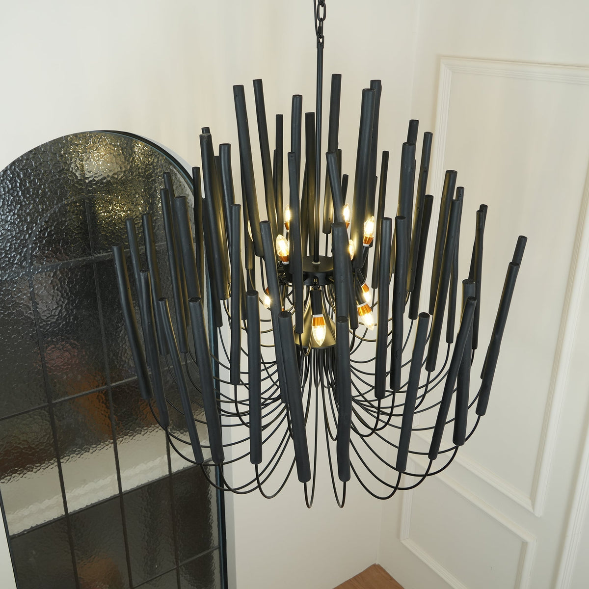 - Add a touch of organic elegance to your space with the Egil Chandelier. This captivating fixture features multiple tiers of slender wooden sticks gracefully arranged on curved iron arms. The interplay of light and shadow creates a mesmerizing effect, adding a unique and intriguing dimension to any room. Available in two stunning finishes - Black stained wood for a dramatic and sophisticated look, or Whitewash stained wood for a more rustic and airy feel. The Egil Chandelier is a true conversation starter, sure to elevate the ambiance of your home.