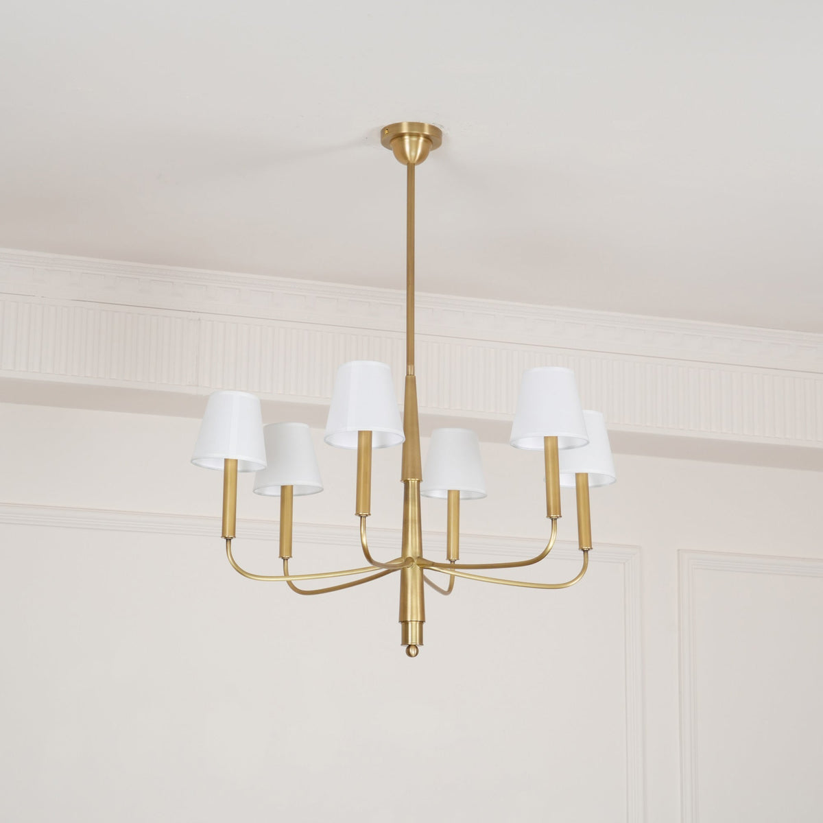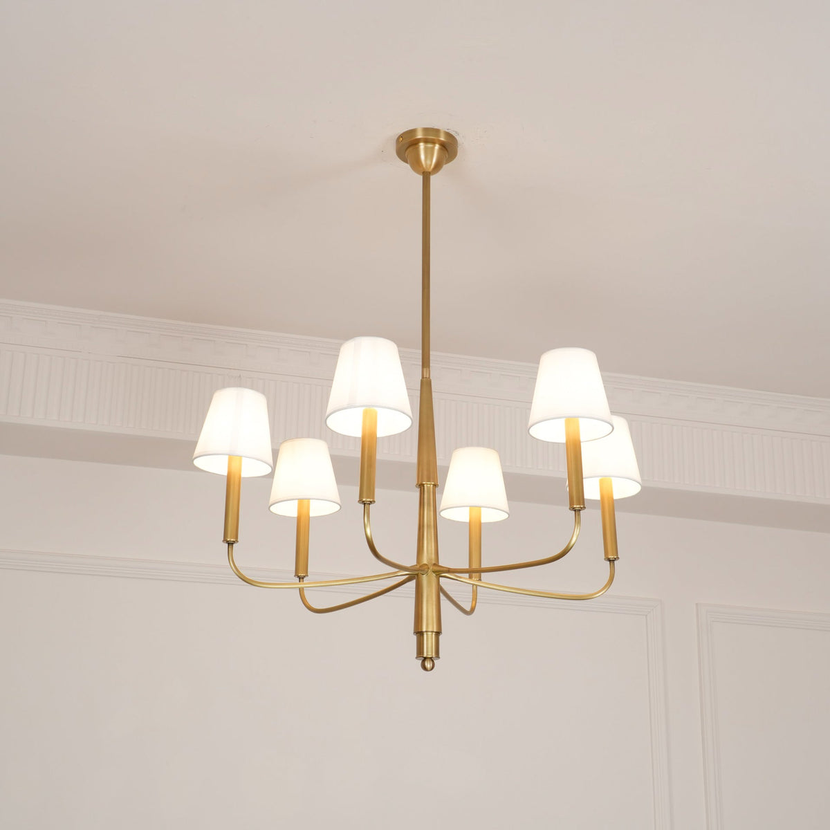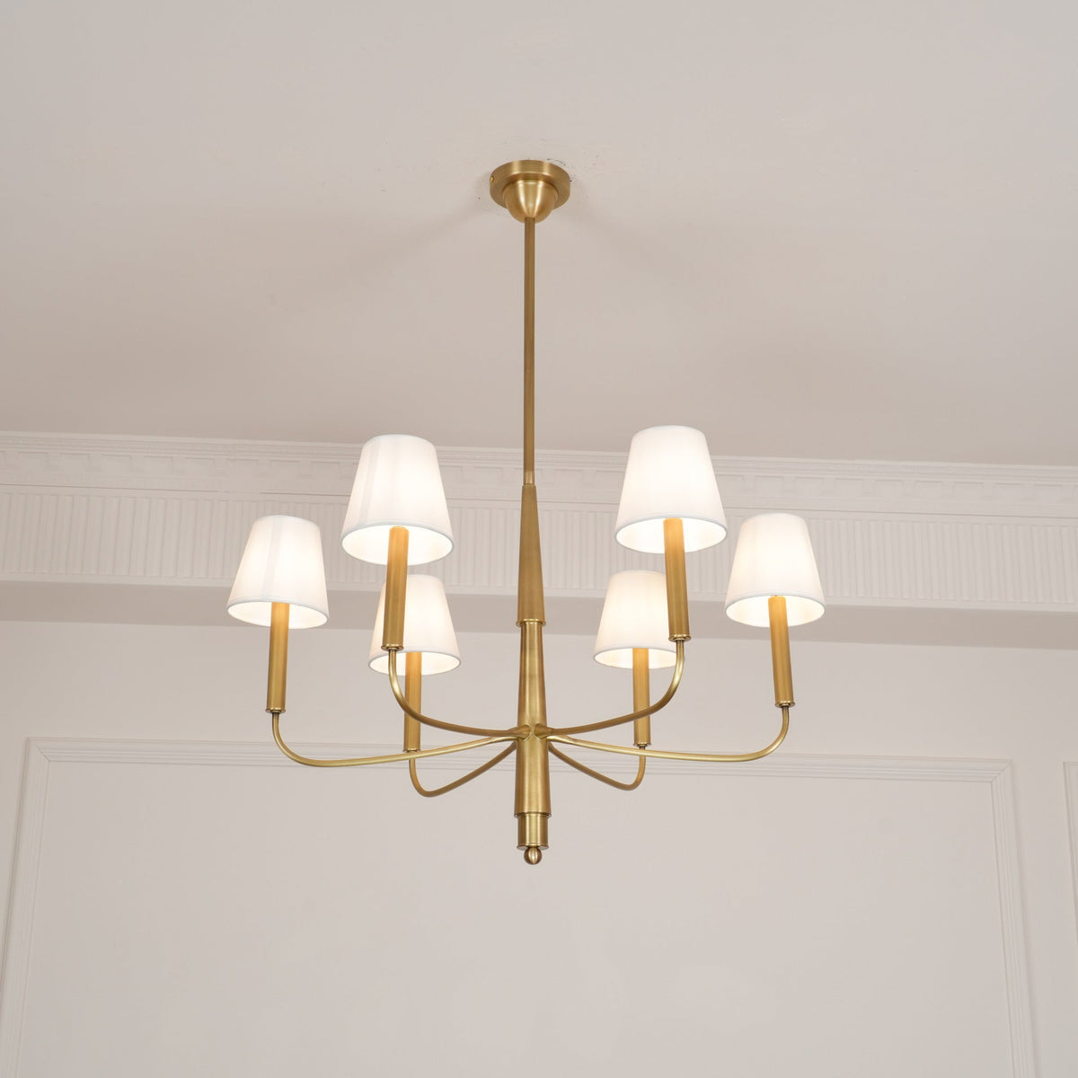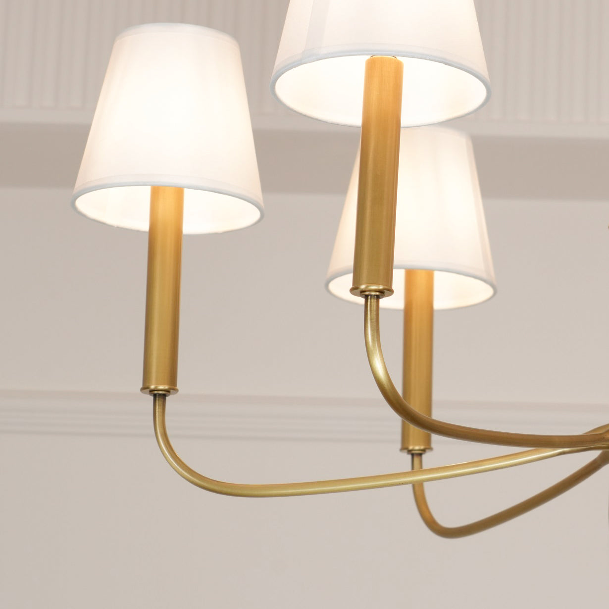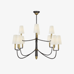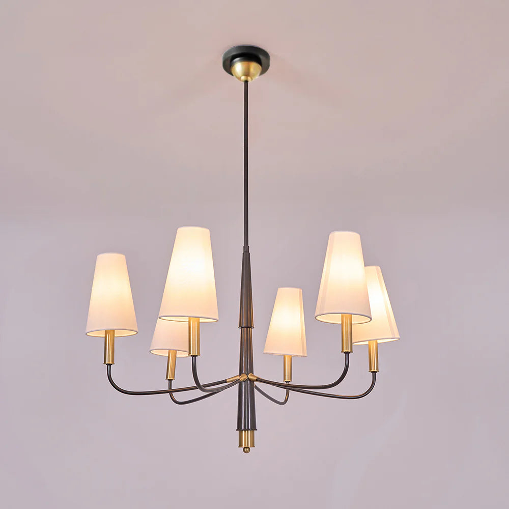 - Bring timeless elegance to your home with the Farlane Chandelier. This beautifully designed fixture, featuring smooth, curved lines and classic linen shades, creates a warm and inviting ambiance in any room. The tall, tapered shades evenly distribute ambient light, while the detailed and layered downrod adds a touch of sophistication. The Farlane Chandelier is the perfect blend of traditional style and modern refinement.