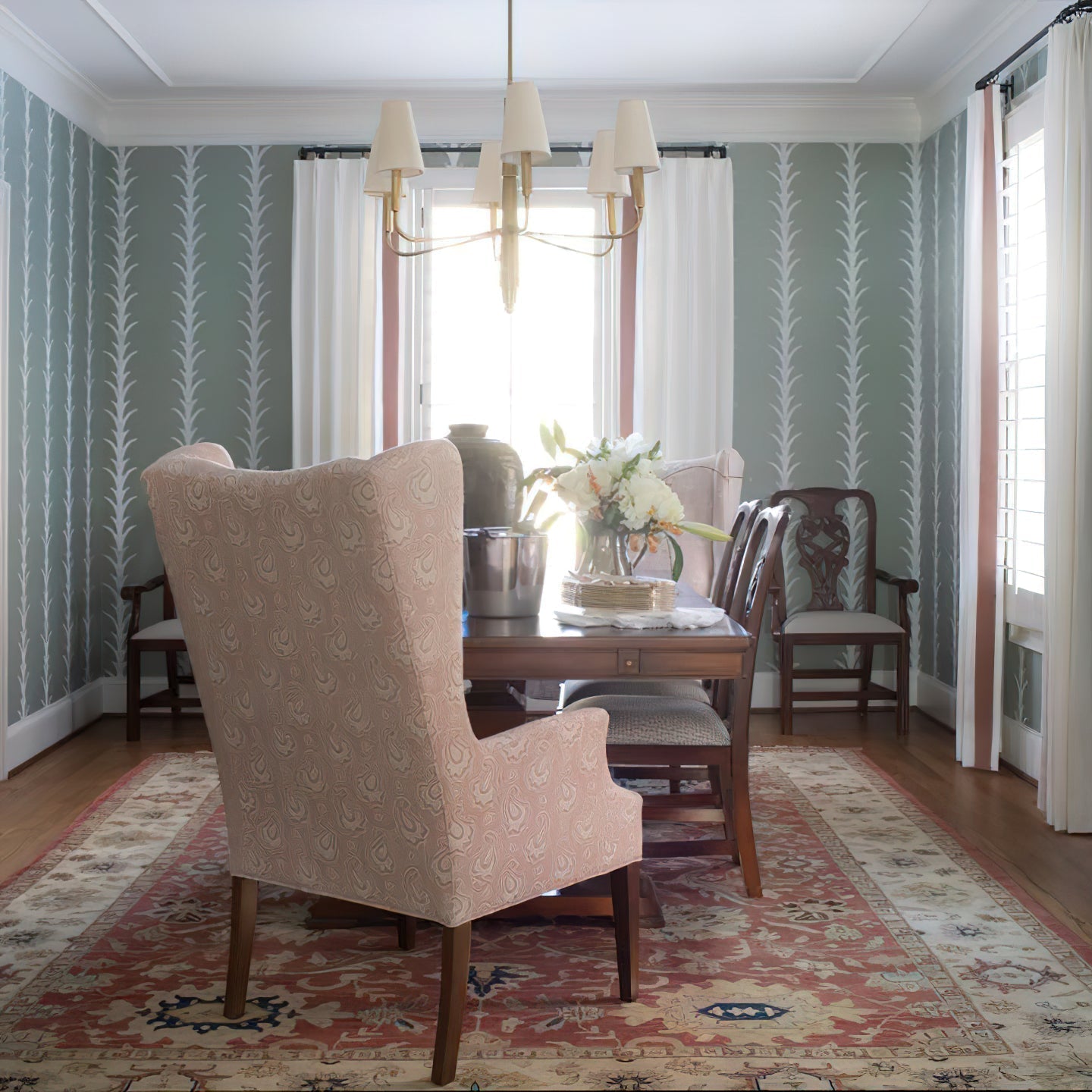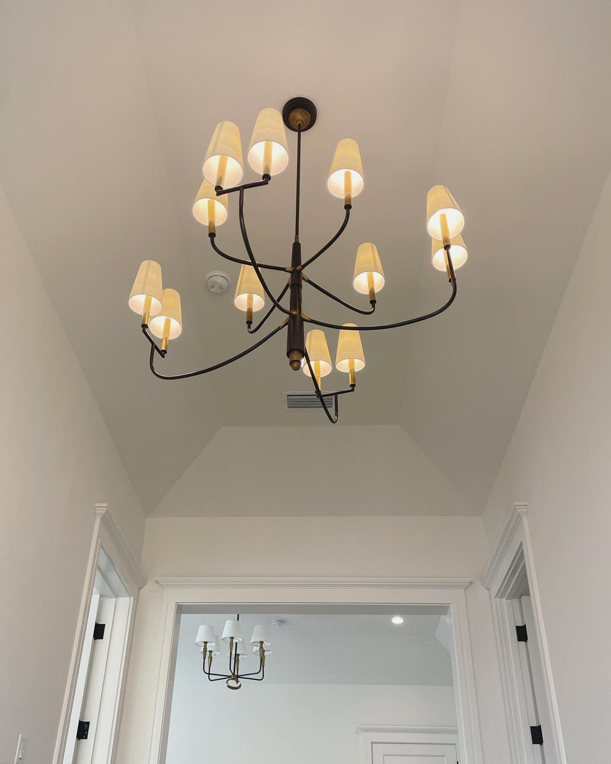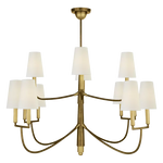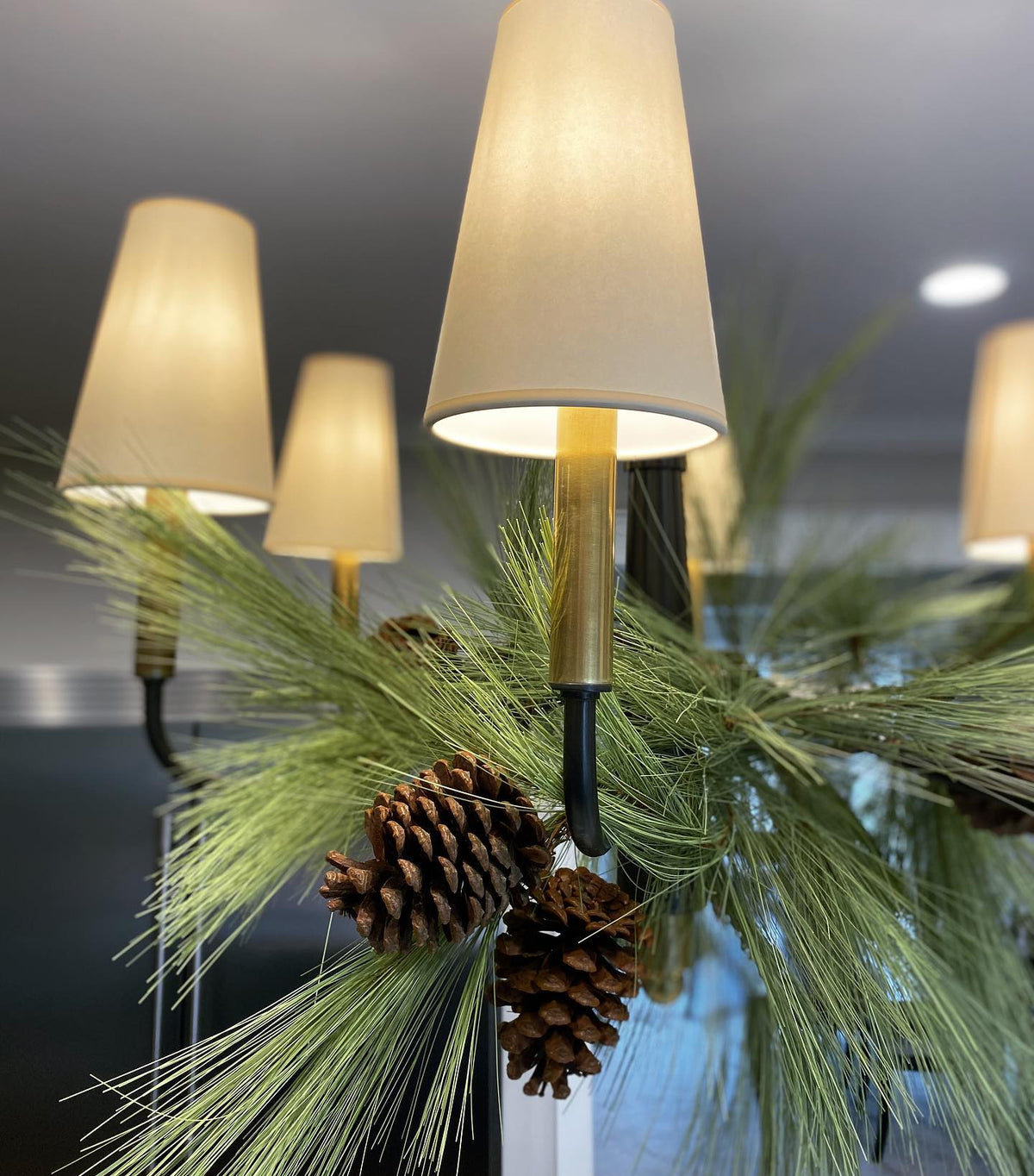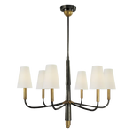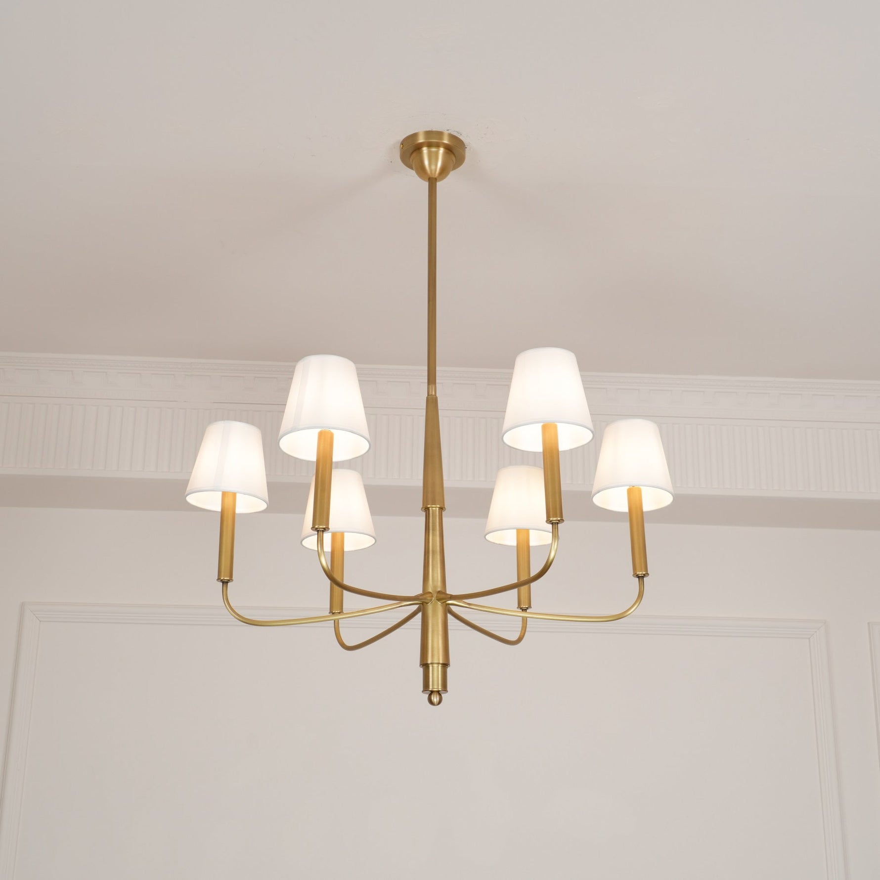 - Bring timeless elegance to your home with the Farlane Chandelier. This beautifully designed fixture, featuring smooth, curved lines and classic linen shades, creates a warm and inviting ambiance in any room. The tall, tapered shades evenly distribute ambient light, while the detailed and layered downrod adds a touch of sophistication. The Farlane Chandelier is the perfect blend of traditional style and modern refinement.