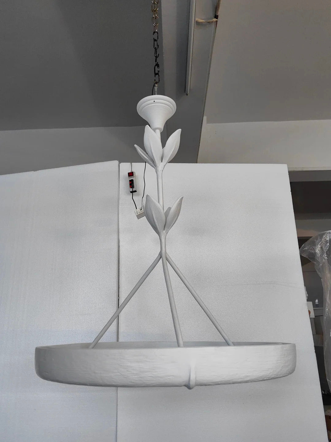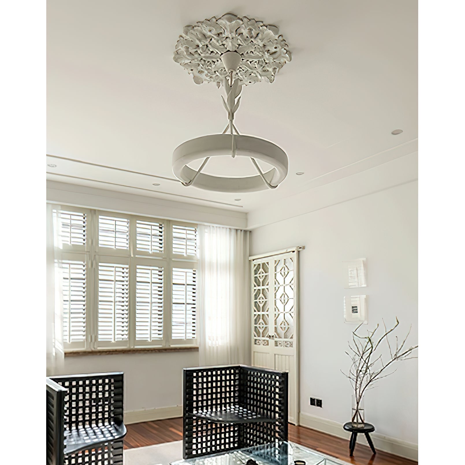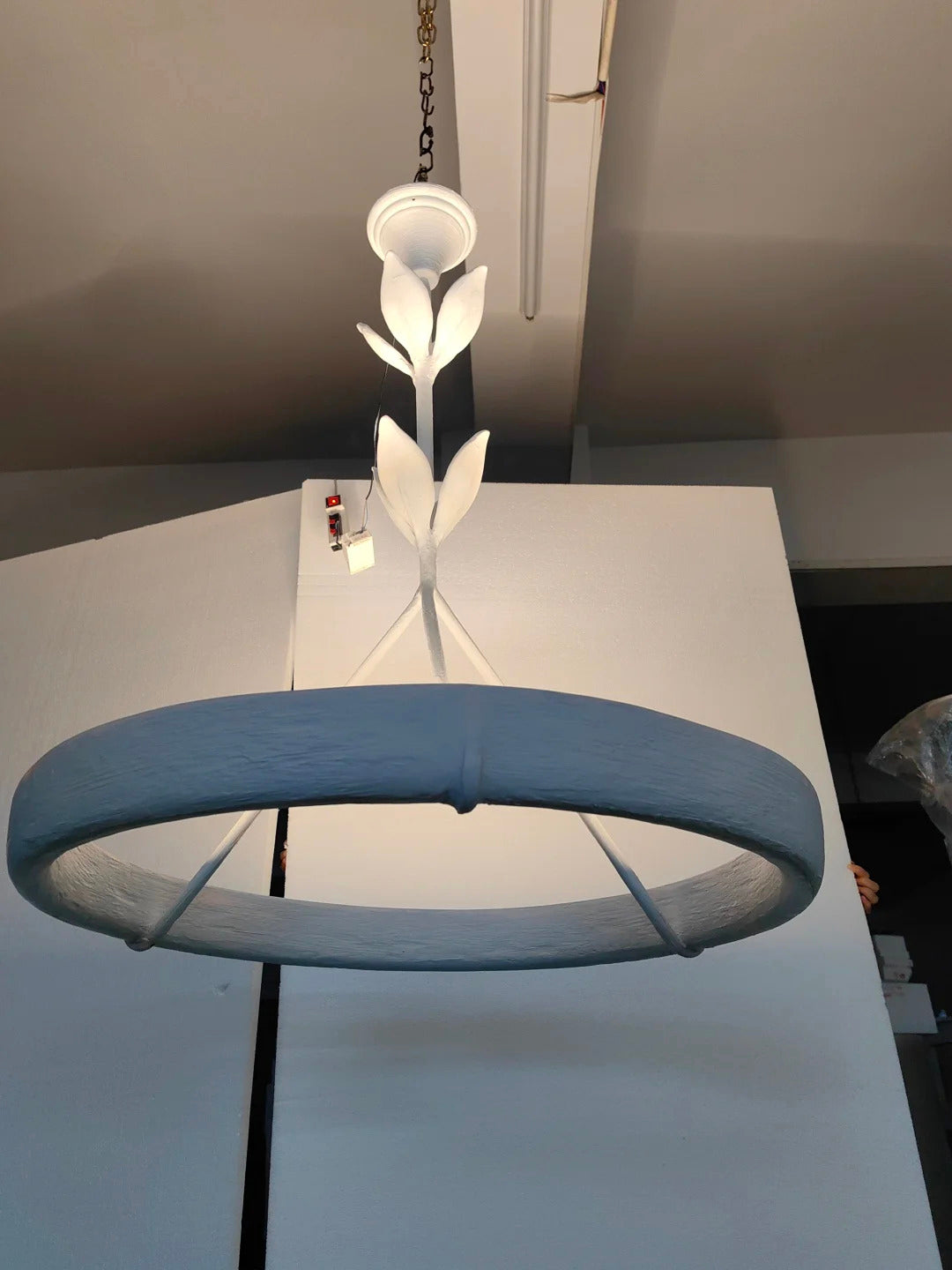 • Crafted from natural plaster, the Flora Ottilia Chandelier boasts a beautifully rough, organic texture that enhances its artisanal charm. The material's low light transmittance creates a soft, diffused glow, while the integrated LED strip on the back casts a gentle upward reflection on the ceiling, adding ambient warmth to any space.