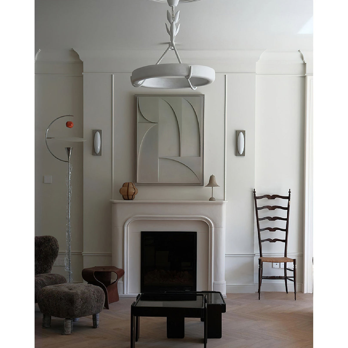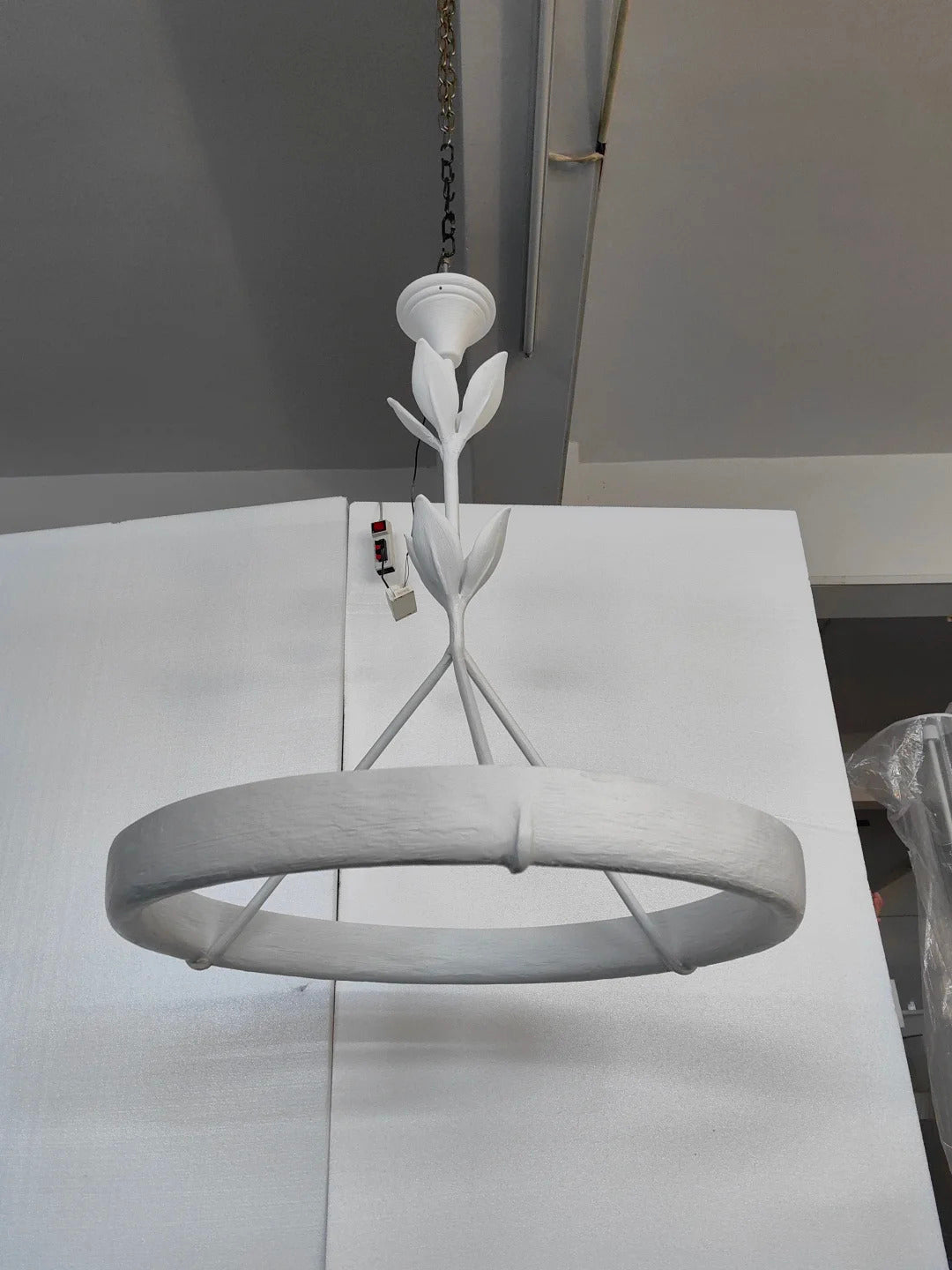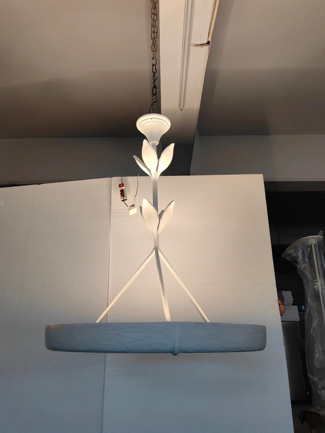 • Crafted from natural plaster, the Flora Ottilia Chandelier boasts a beautifully rough, organic texture that enhances its artisanal charm. The material's low light transmittance creates a soft, diffused glow, while the integrated LED strip on the back casts a gentle upward reflection on the ceiling, adding ambient warmth to any space.