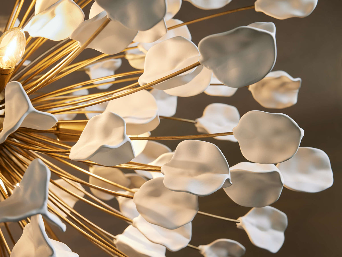 - From every angle, the Lunaria Chandelier reveals a new dimension of its beauty. The design masterfully interprets the layered, disc-like structure of the lunaria seedpod. Dozens of individual ceramic petals cascade from a central core, each one carefully angled to create a sense of gentle, natural movement, as if caught in a soft breeze. This isn't a static object; it's a frozen ballet of botanical forms. The cluster creates a lush, voluminous silhouette that is both dramatic and astonishingly light, bringing the serene harmony of the natural world into your dining room, living area, or foyer.
