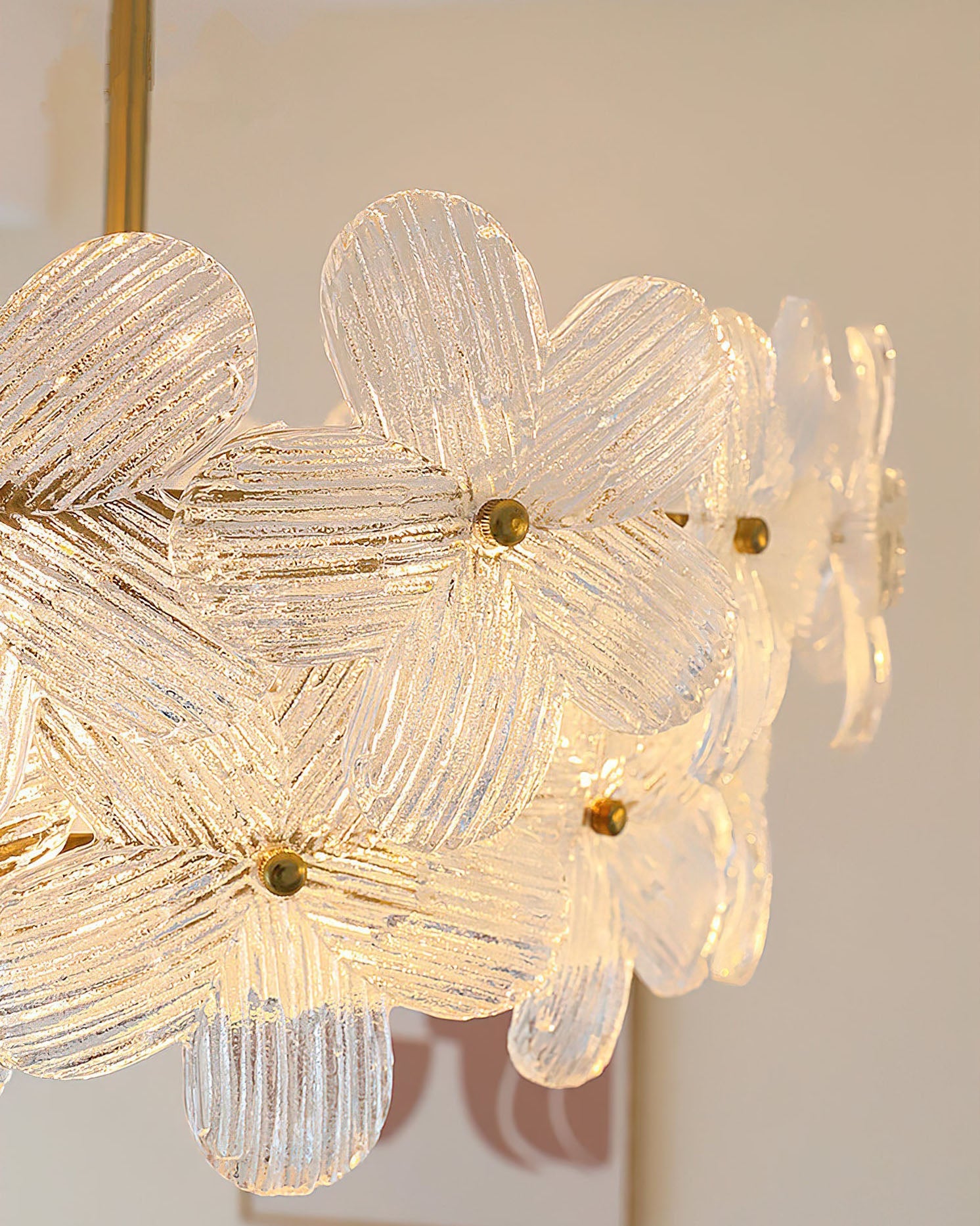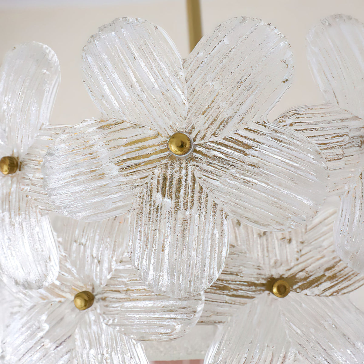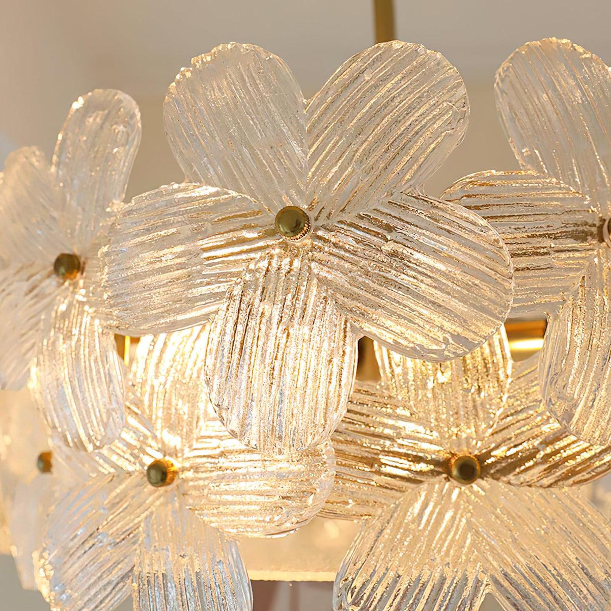 - Crafted from solid brass, the frame offers a rich, elegant metallic luster and a refined texture that promises exceptional durability and corrosion resistance. It is a investment in lasting quality.Each glass lampshade is a marvel, featuring a clear, intricate flower-shaped pattern with excellent light transmittance. The textured glass softly diffuses light, creating a stunning layered glow and unique light and shadow effects on your walls and ceiling.